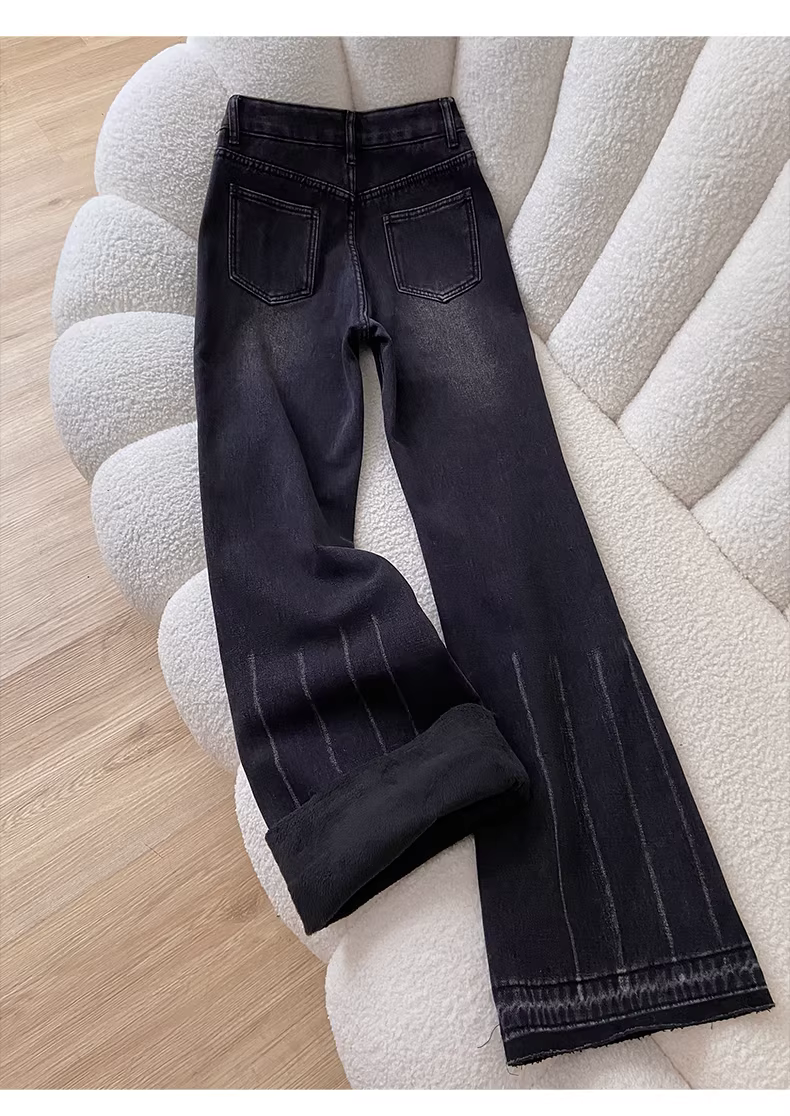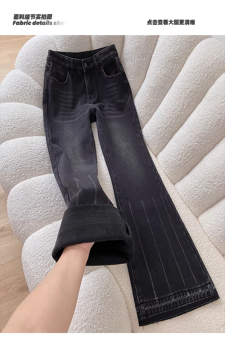 Quần jean ống loe lót lông màu đen và xám La Chapelle dành cho nữ, mùa thu đông 2025, kiểu mới cạp cao dày dặn