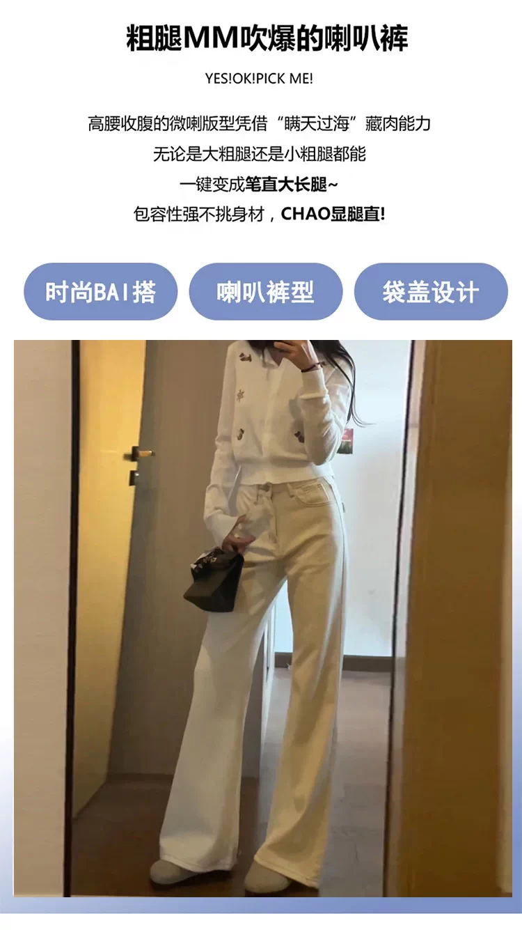 Quần jean ống loe lót lông màu trắng nhạt dành cho nữ, mùa thu đông, cỡ lớn, lưng cao, giảm béo, dáng suôn, quần ống loe không bó sát