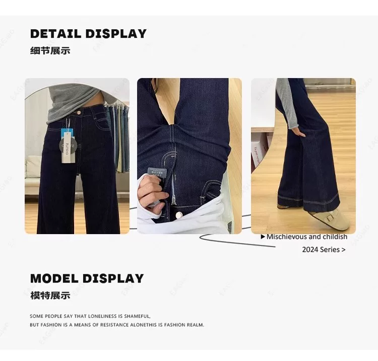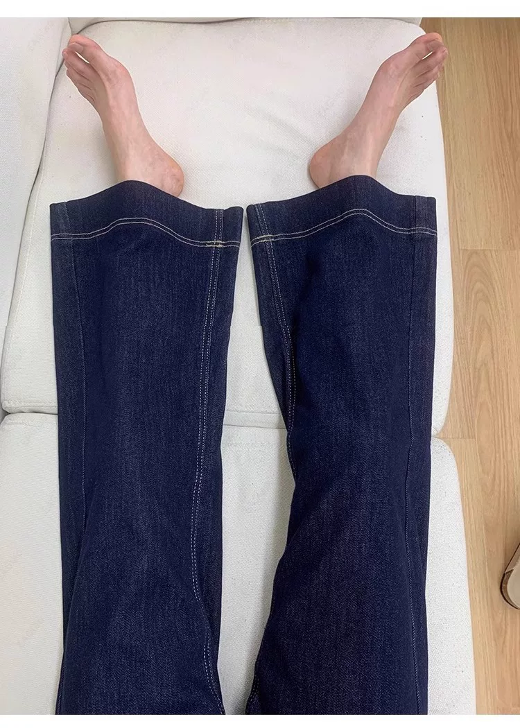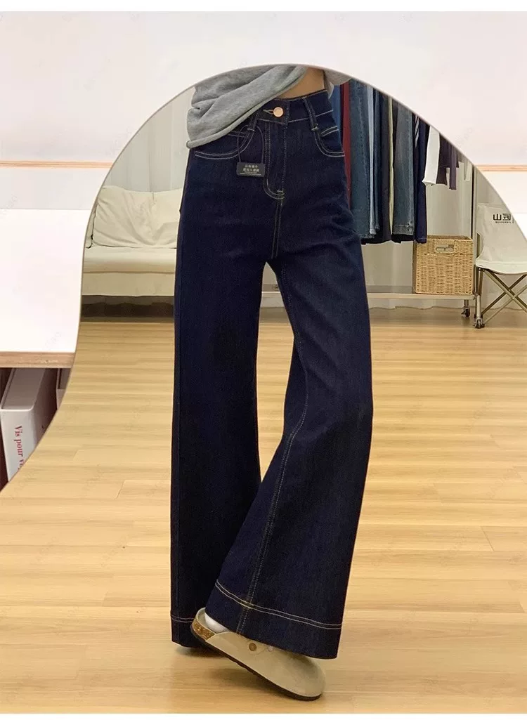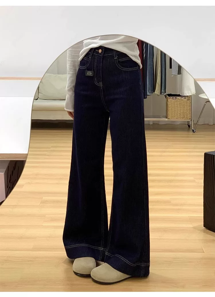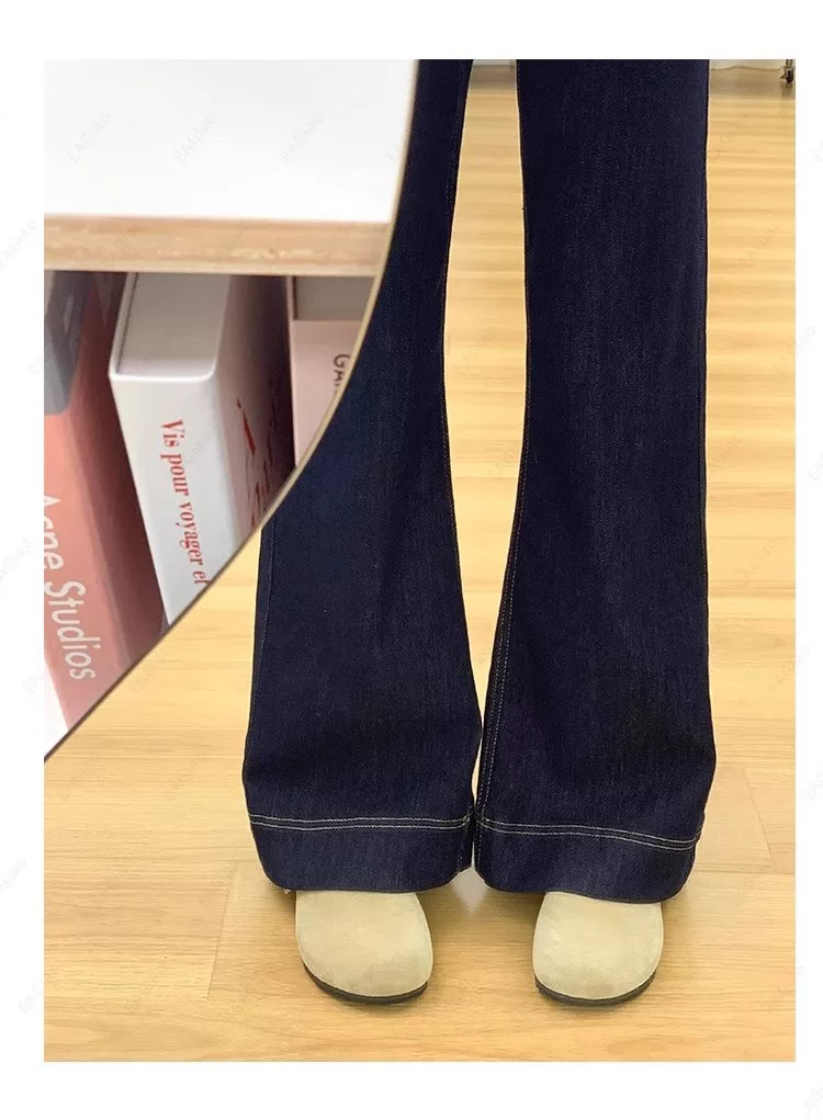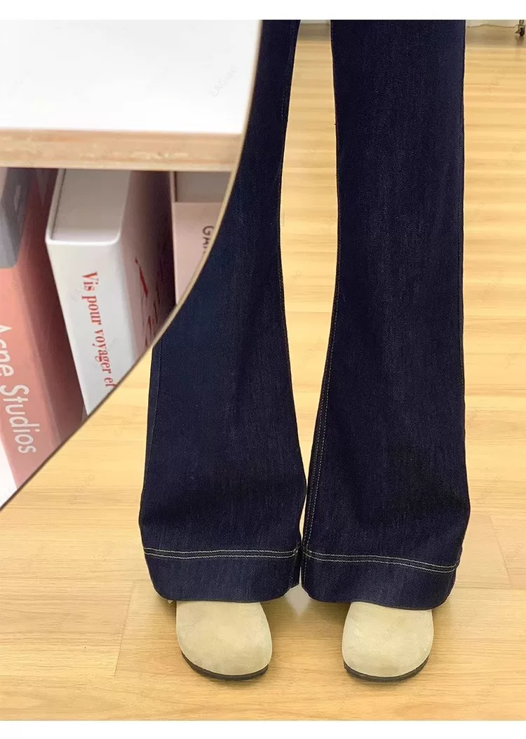 - Quần jean ống loe lót lông màu xanh đậm dành cho nữ, mùa thu đông, cỡ lớn, lưng cao, co giãn, che hông, giảm béo, quần ống loe.