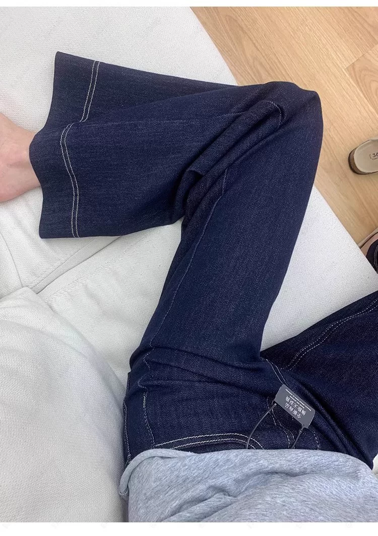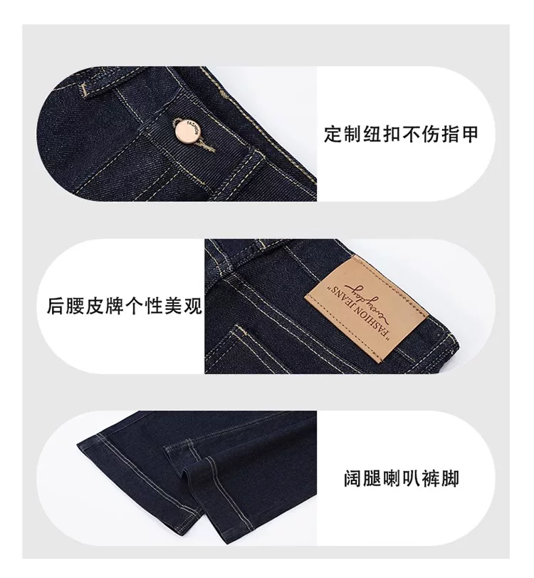 Quần jean ống loe lót lông màu xanh đậm dành cho nữ, mùa thu đông, cỡ lớn, lưng cao, co giãn, che hông, giảm béo, quần ống loe.