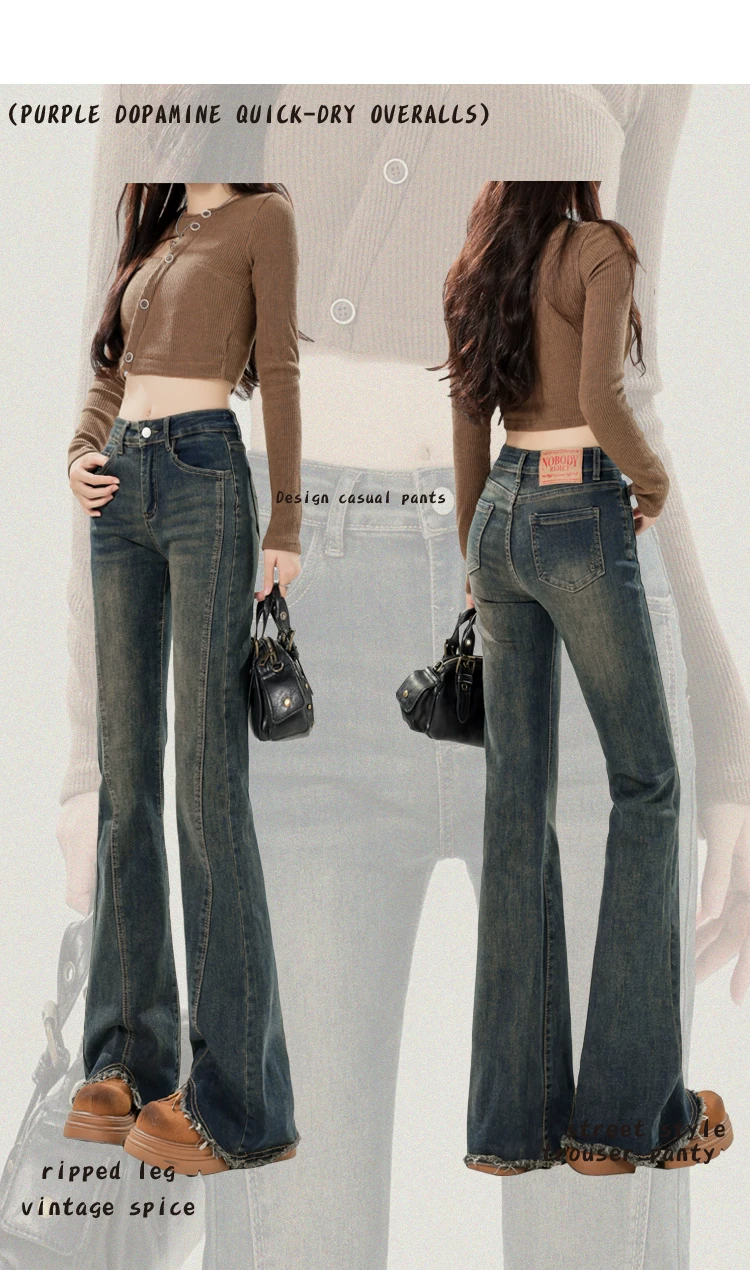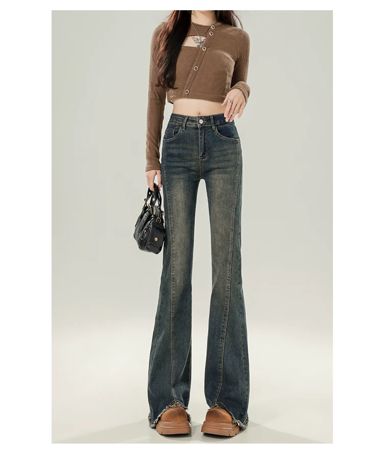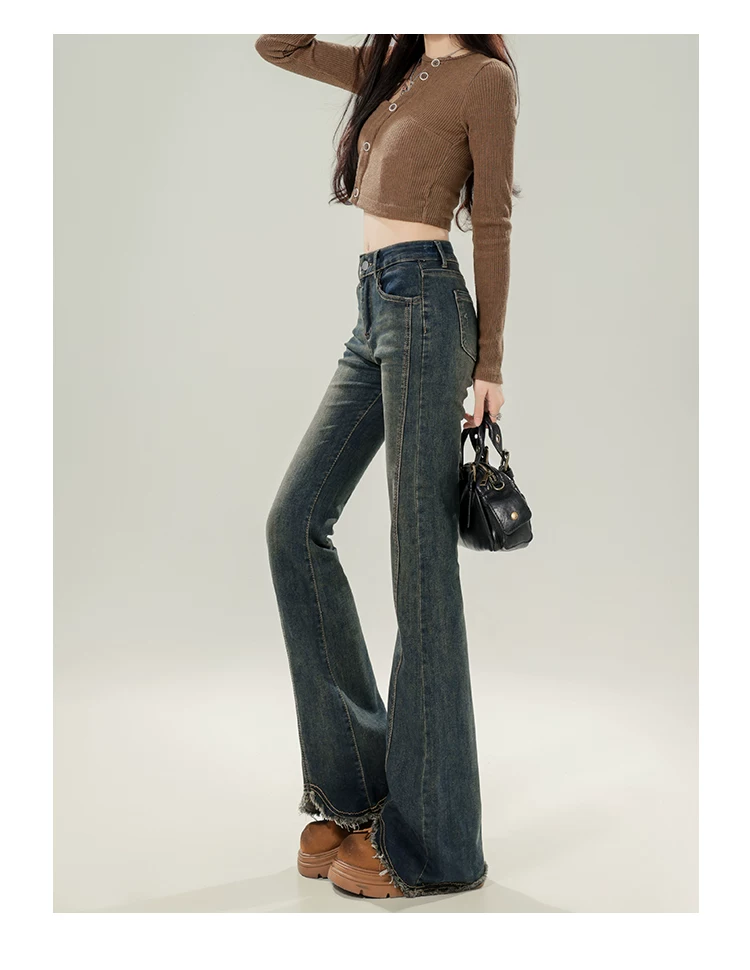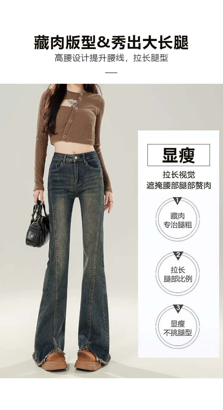 Quần jean ống loe lót lông phong cách retro Mỹ dành cho nữ, mùa thu đông, cỡ lớn, cạp cao, tôn dáng, kiểu dáng thời trang, viền quần xù.