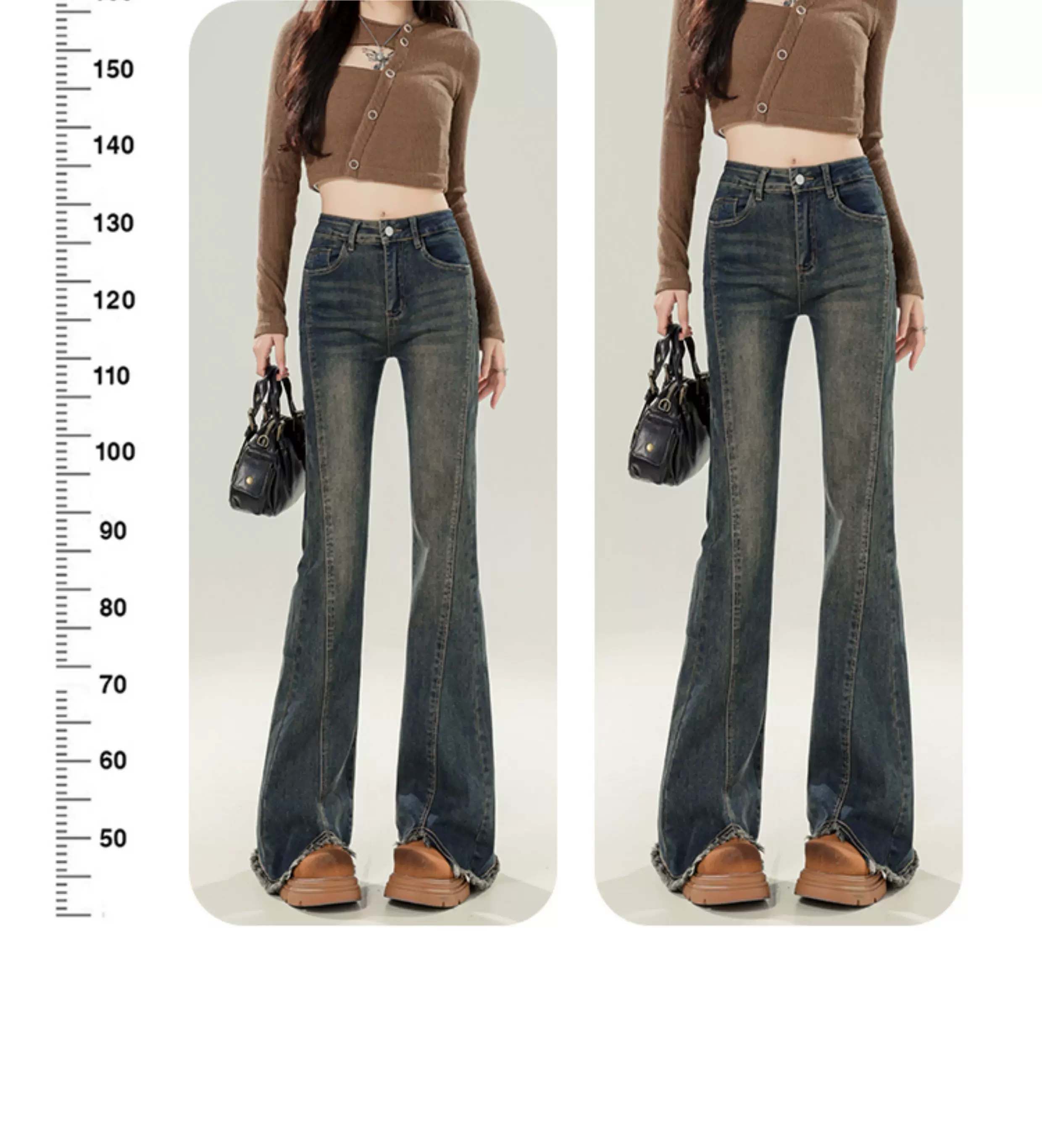 - Quần jean ống loe lót lông phong cách retro Mỹ dành cho nữ, mùa thu đông, cỡ lớn, cạp cao, tôn dáng, kiểu dáng thời trang, viền quần xù.