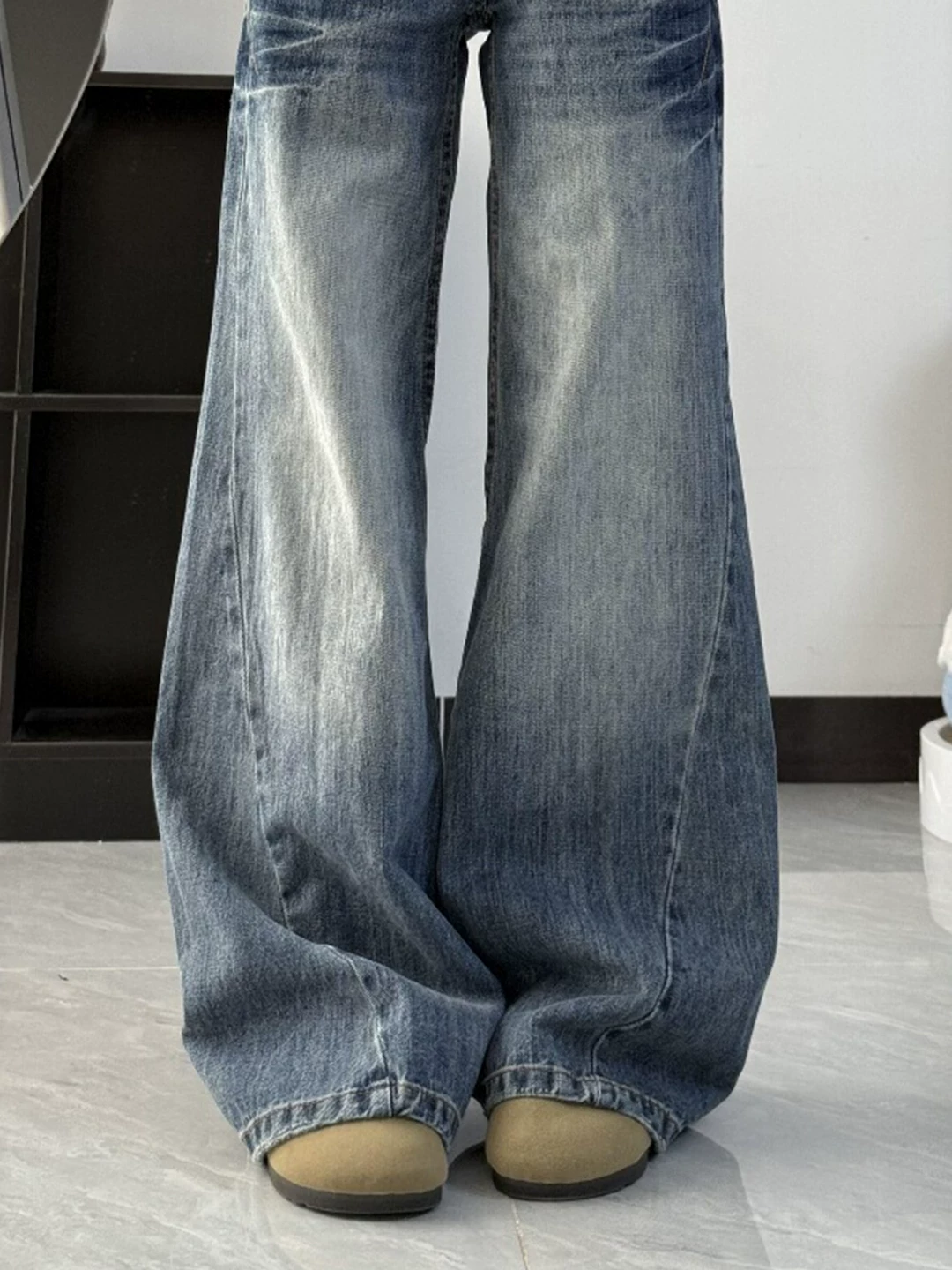 - Quần jean ống loe lưng cao cho nữ, mùa thu, cỡ lớn, không bó sát ở chân, giảm béo, quần hình lưỡi liềm, phong cách Mỹ, quần ống rộng thoải mái