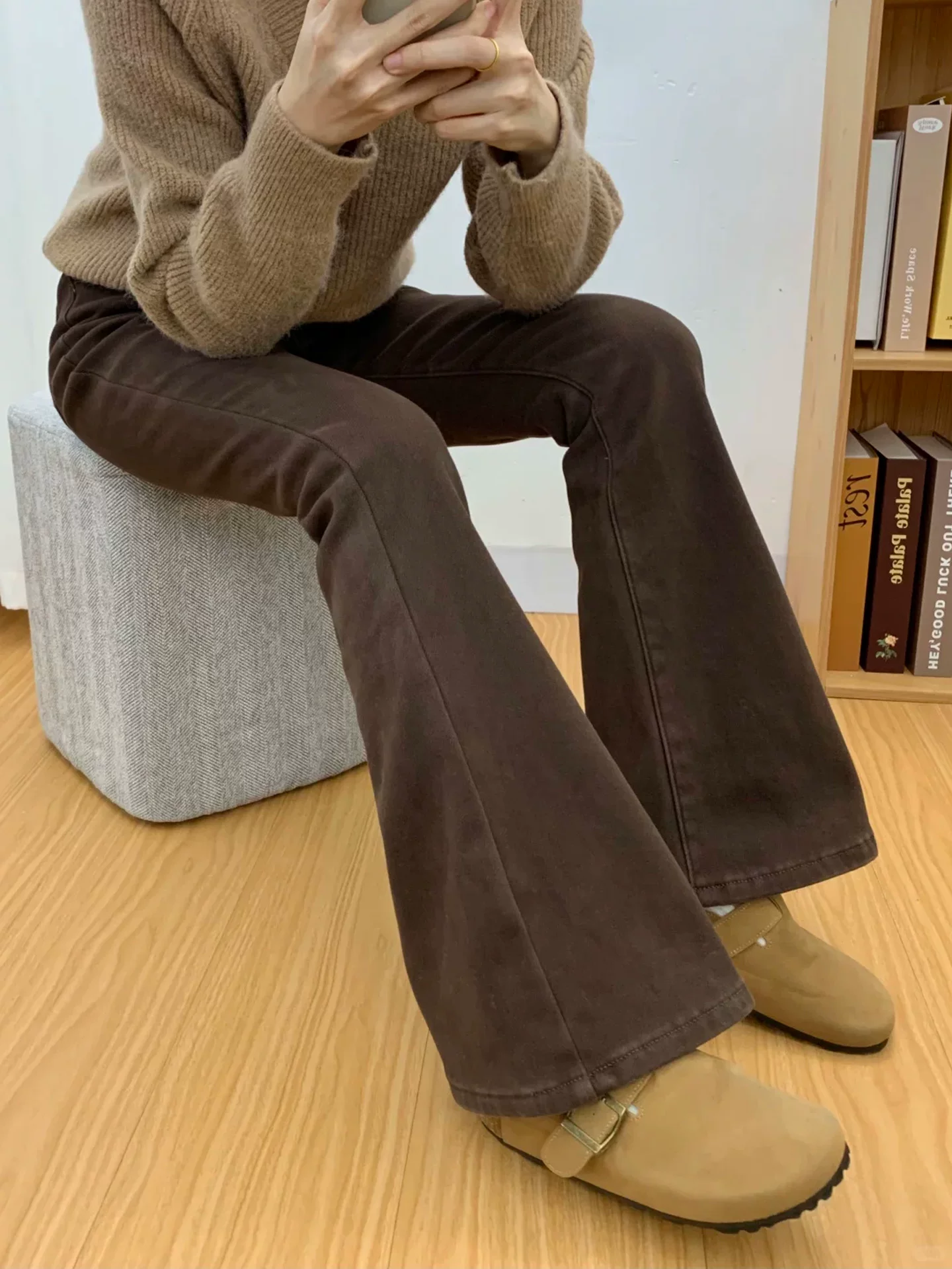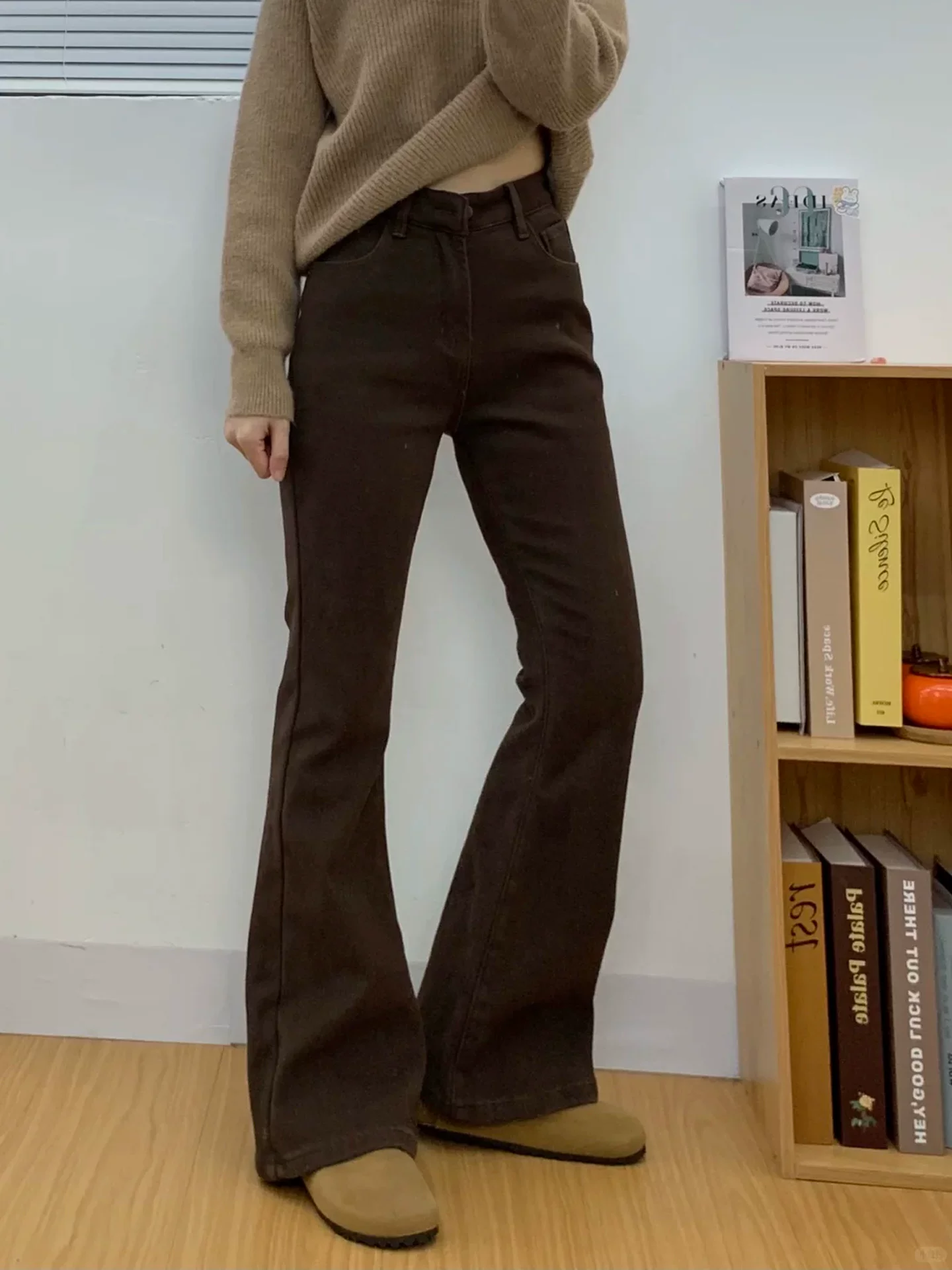 Quần jean ống loe màu cà phê Melard dành cho nữ, mùa thu đông, lót lông cừu, dày dặn, cỡ lớn, cạp cao, co giãn, quần ống loe thon gọn.