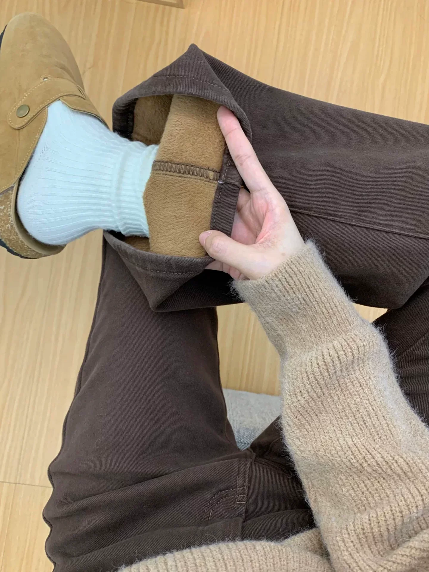 - Quần jean ống loe màu cà phê Melard dành cho nữ, mùa thu đông, lót lông cừu, dày dặn, cỡ lớn, cạp cao, co giãn, quần ống loe thon gọn.