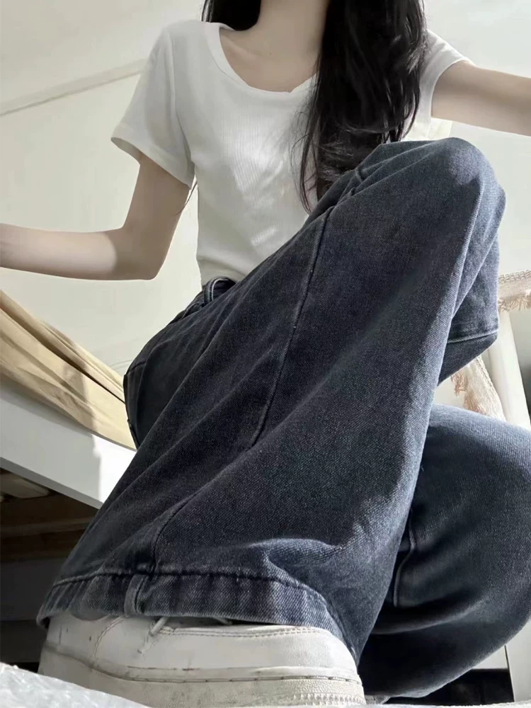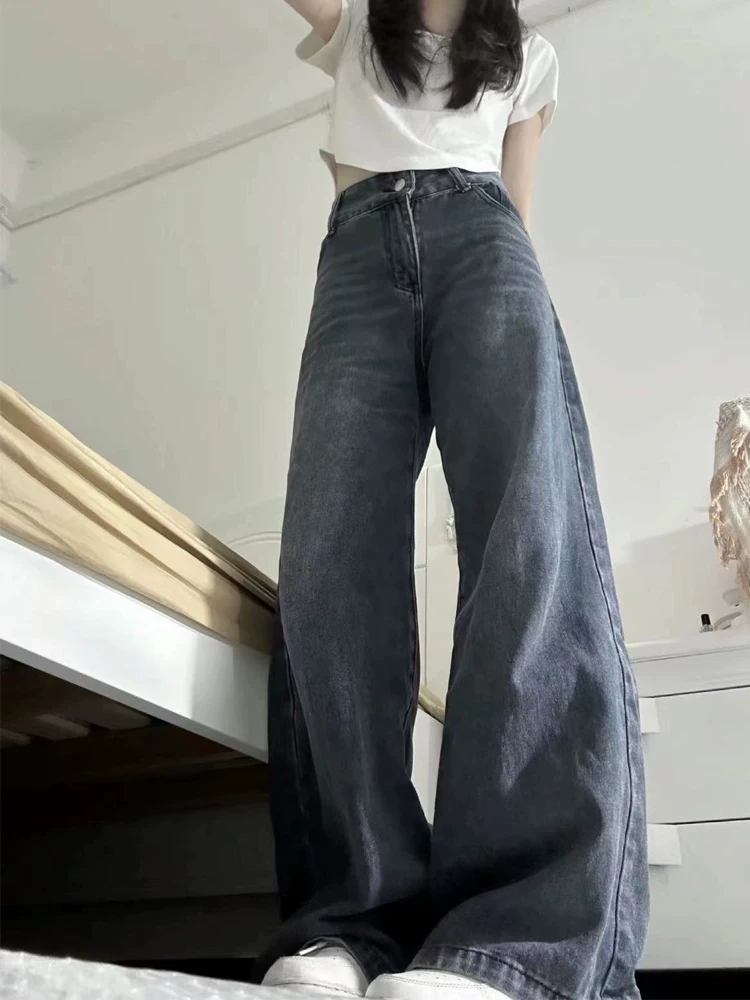 - Quần jean ống loe màu đen và xám dành cho nữ, kiểu dáng mùa thu mới, cỡ lớn, cạp cao, dáng rộng, che hông, giảm béo, quần ống rộng chuông.