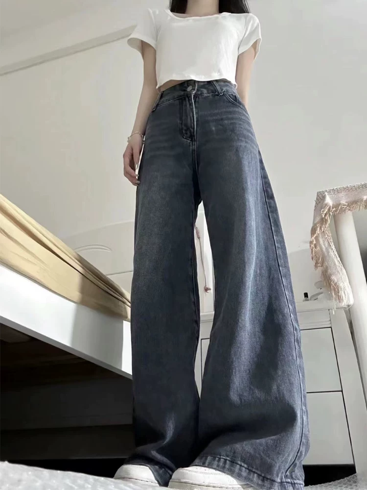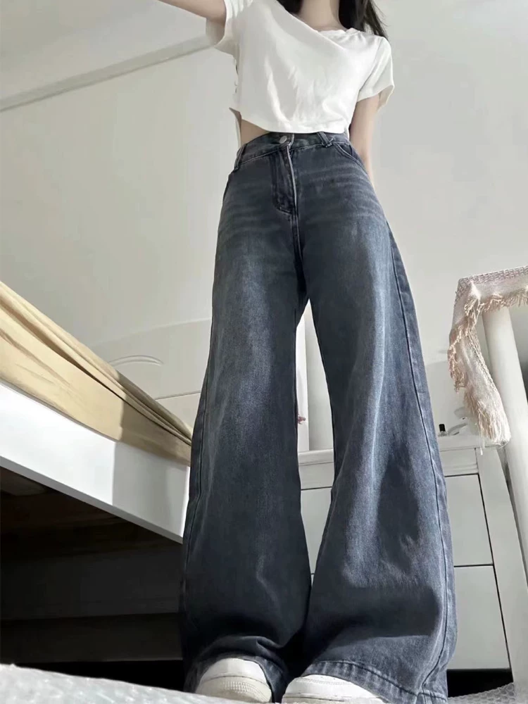 Quần jean ống loe màu đen và xám dành cho nữ, kiểu dáng mùa thu mới, cỡ lớn, cạp cao, dáng rộng, che hông, giảm béo, quần ống rộng chuông.