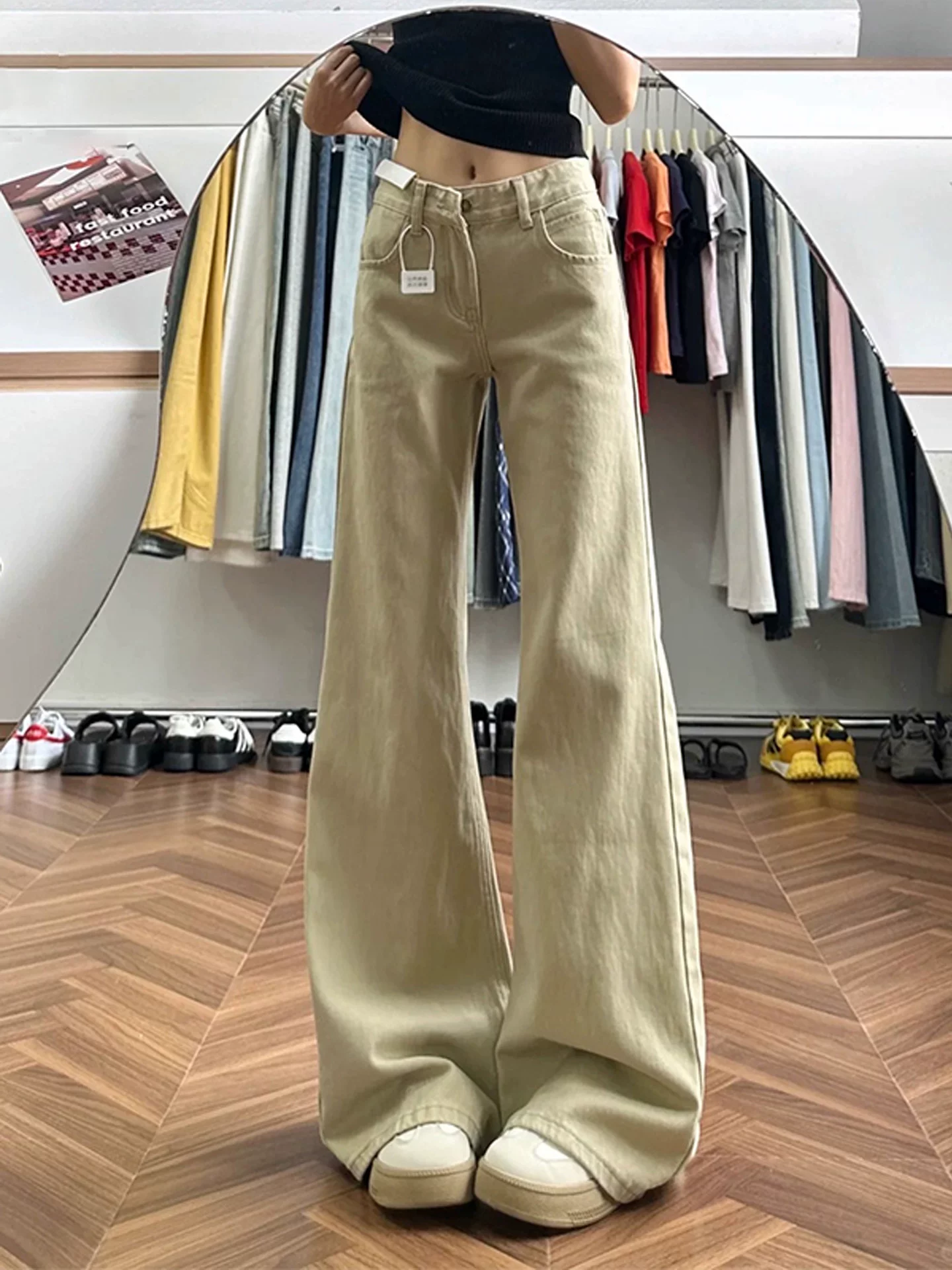 Quần jean ống loe màu kaki dành cho nữ, mùa thu, cỡ lớn, lưng cao, dáng rộng, thon gọn, mềm mại, dài chạm sàn, quần ống chuông kiểu móng ngựa