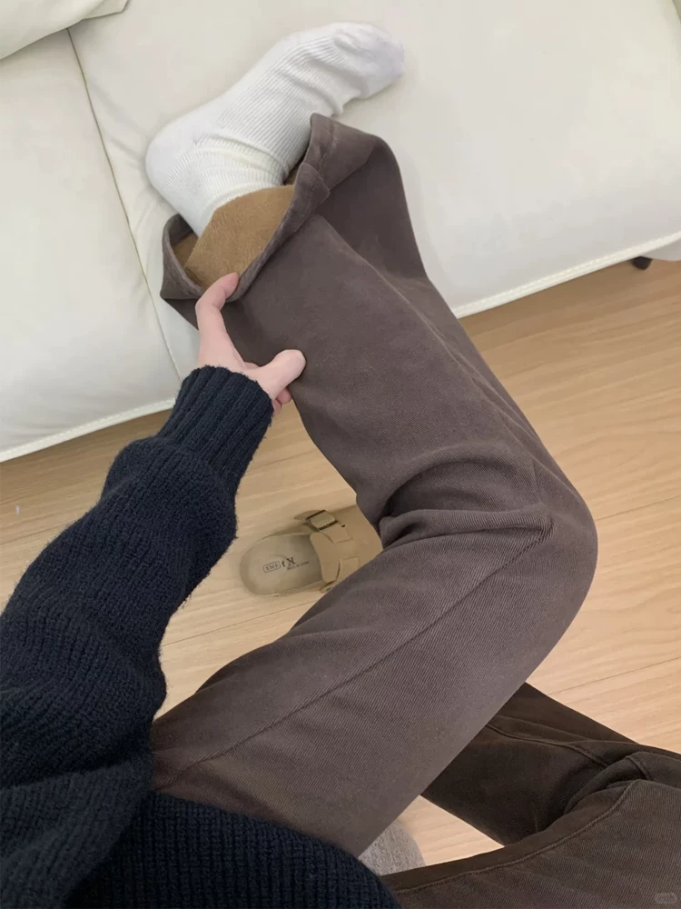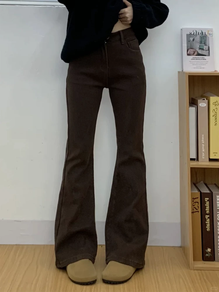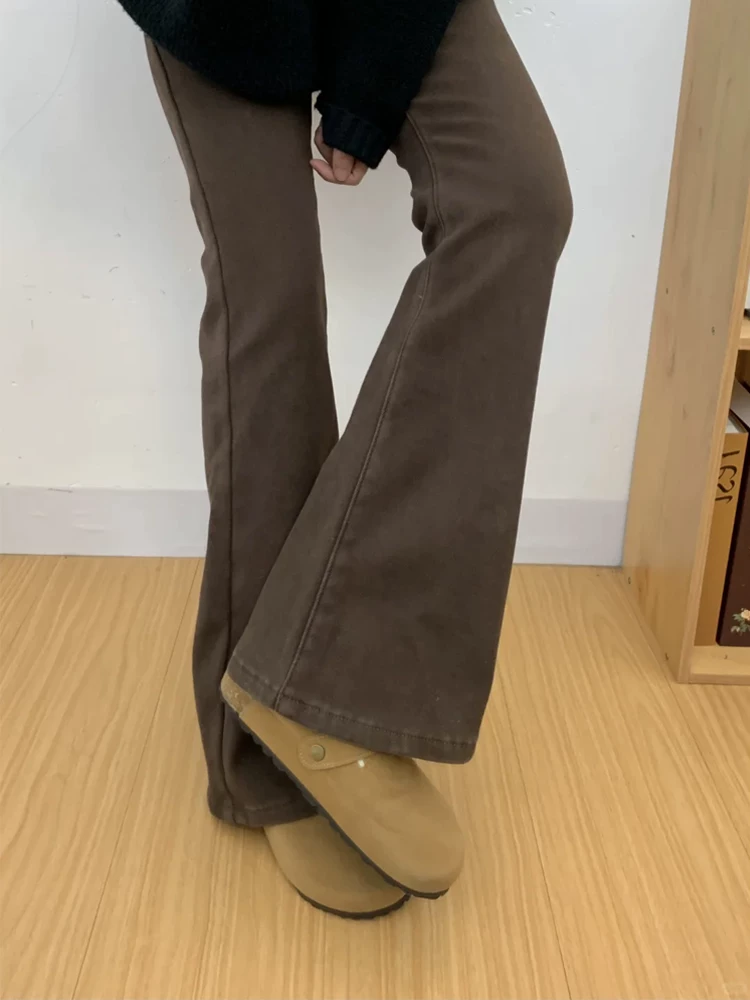 - Quần jean ống loe thẳng dày dặn lót lông cừu màu nâu dành cho nữ, cỡ lớn mùa đông, cạp cao, co giãn, che hông, quần ống loe thon gọn