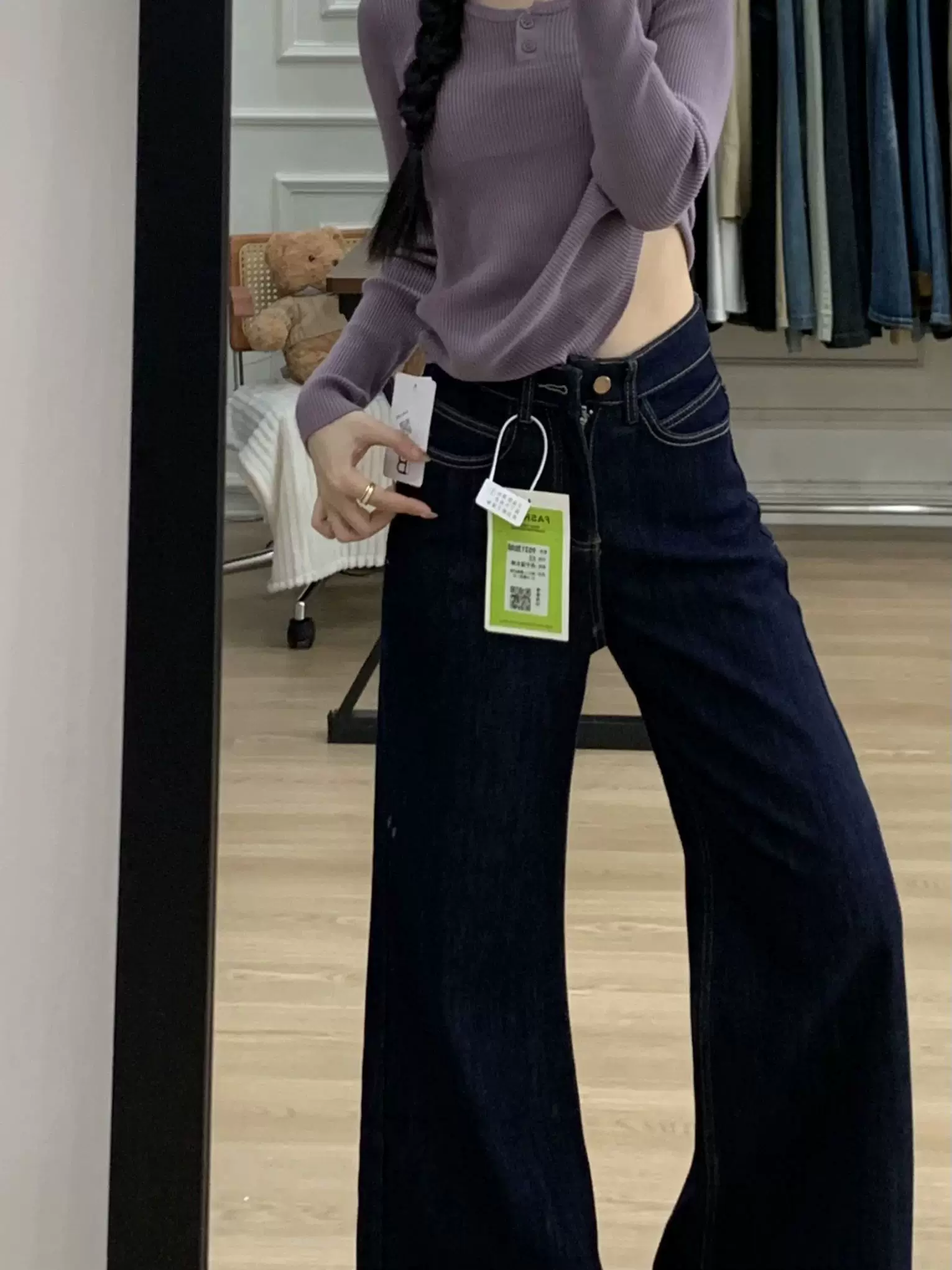 - Quần jean ống loe thẳng, dày dặn, lót lông cừu màu xanh đậm dành cho nữ, size lớn mùa đông, cạp cao, co giãn, che hông.