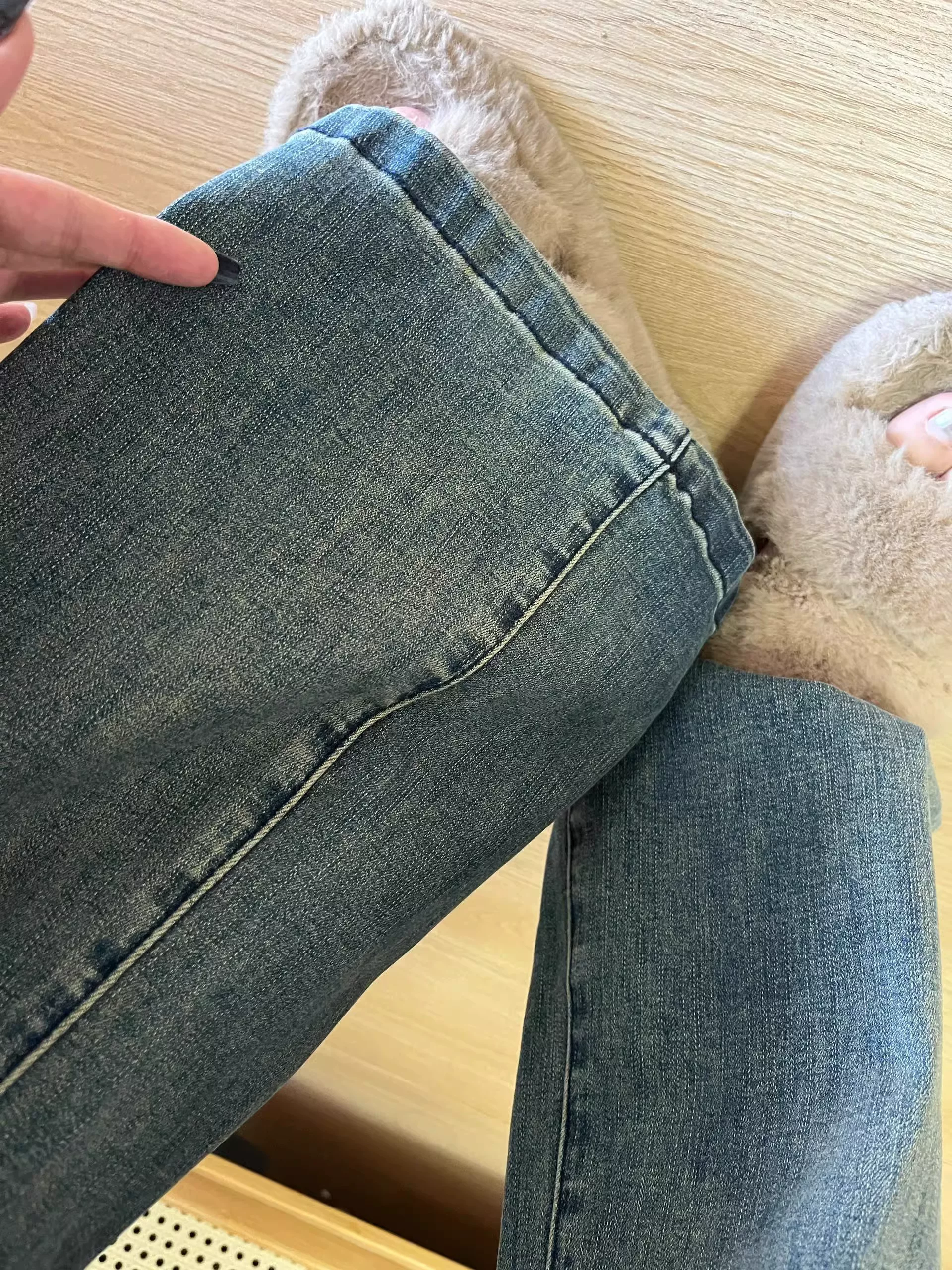 Quần jean ống loe thẳng màu xanh retro kiểu Mỹ dành cho nữ, lót lông cừu, dày dặn, cỡ lớn, cạp cao, co giãn, quần ống loe tôn dáng.