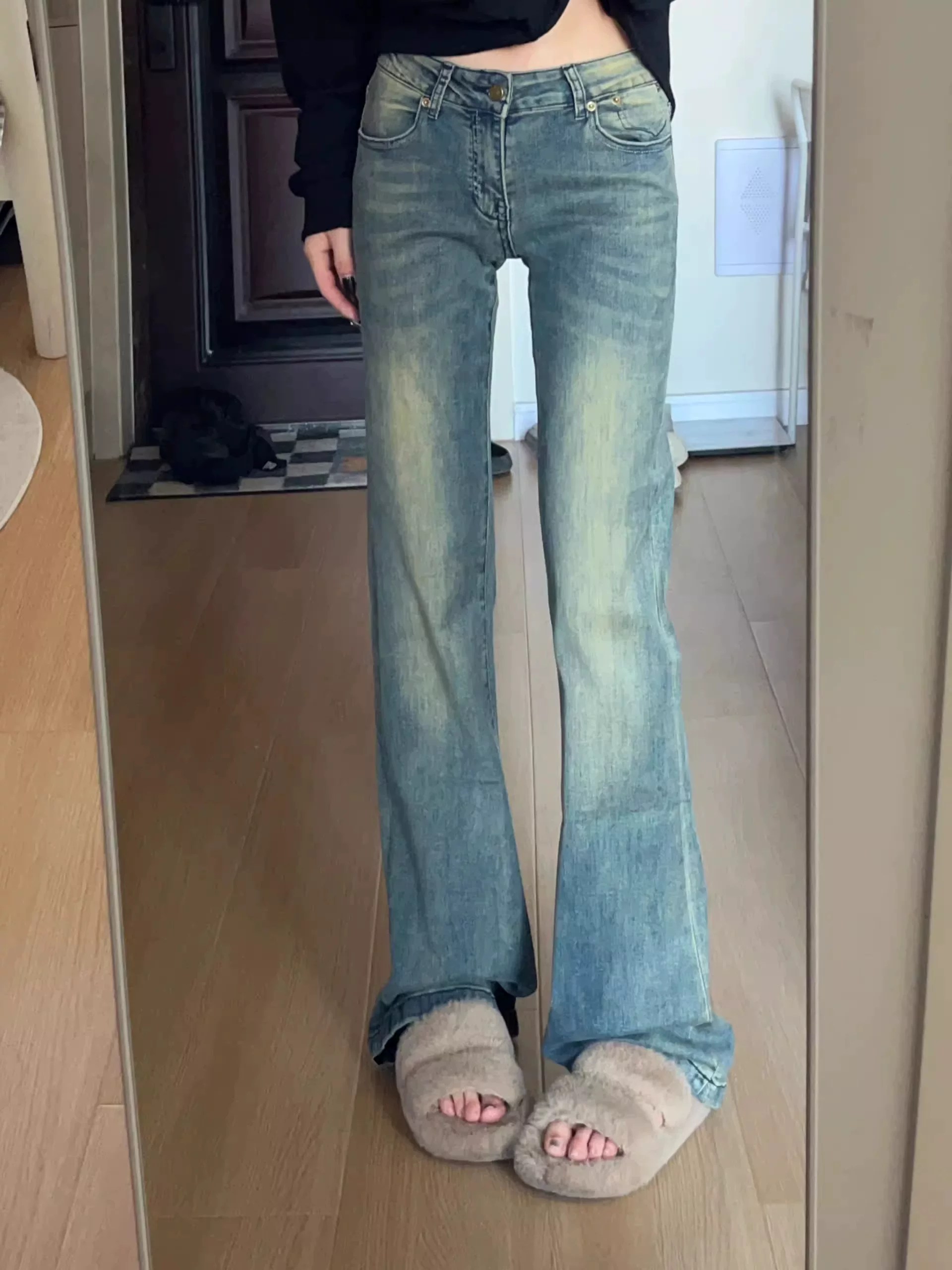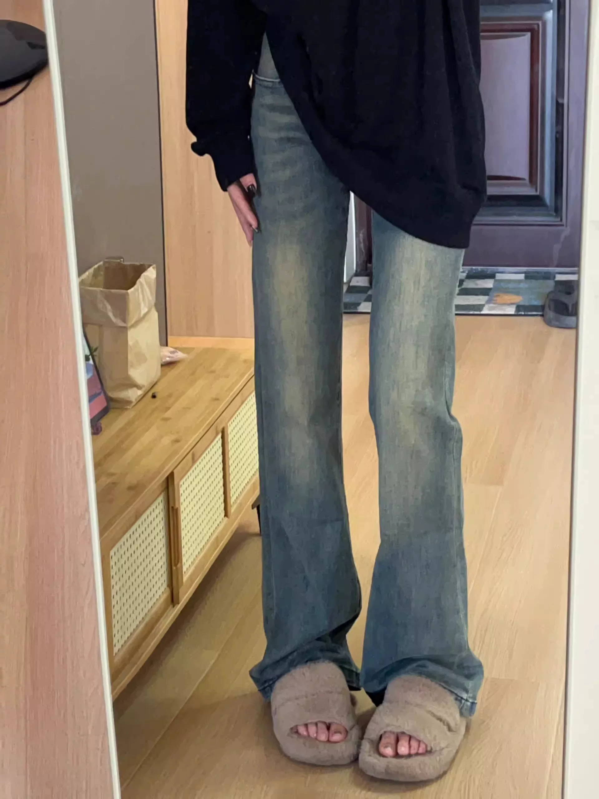 - Quần jean ống loe thẳng màu xanh retro kiểu Mỹ dành cho nữ, lót lông cừu, dày dặn, cỡ lớn, cạp cao, co giãn, quần ống loe tôn dáng.