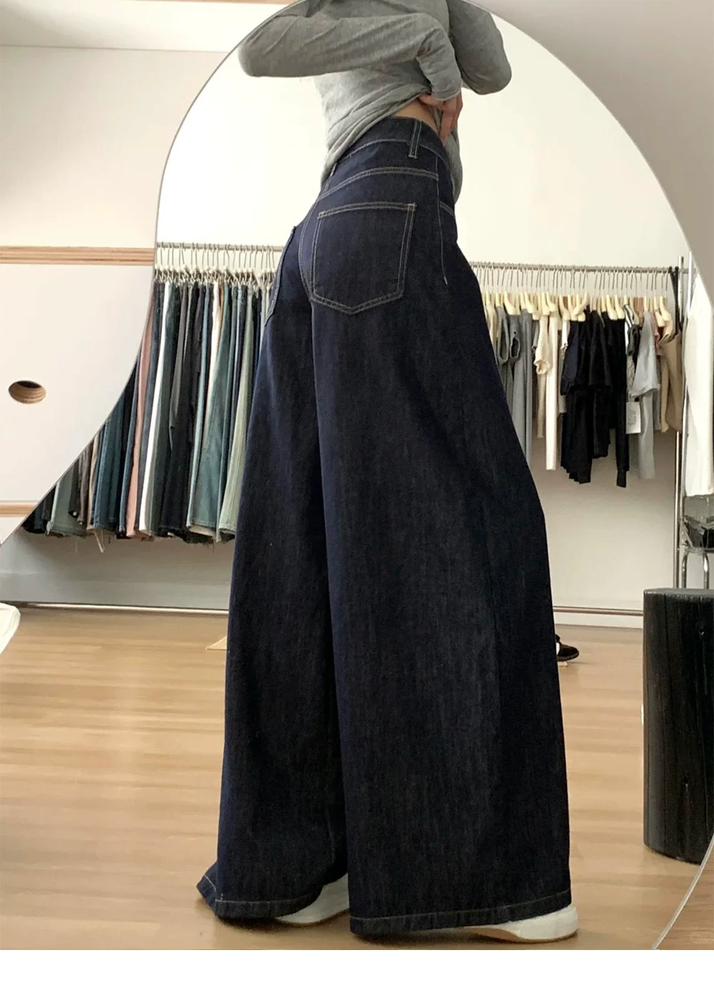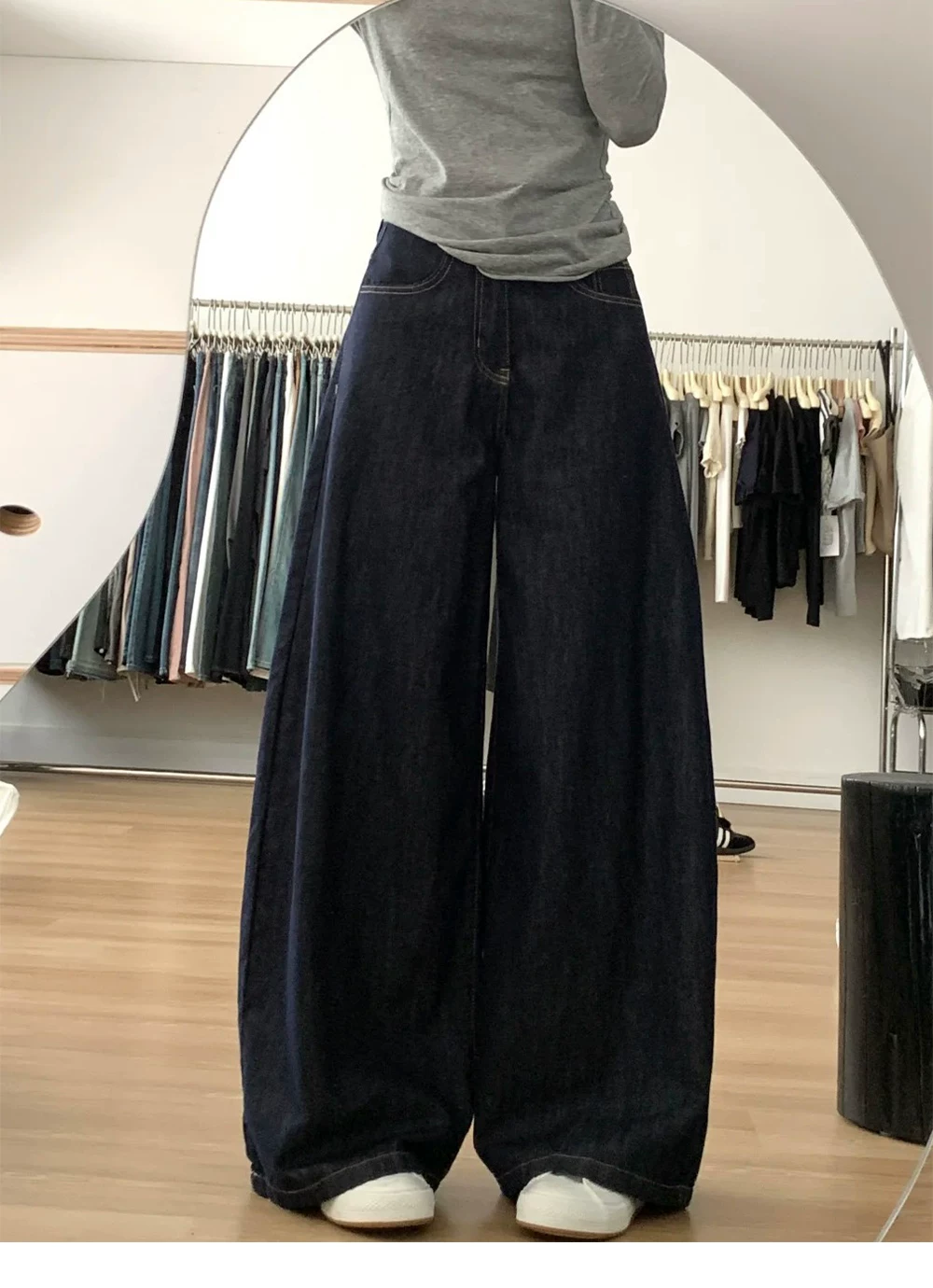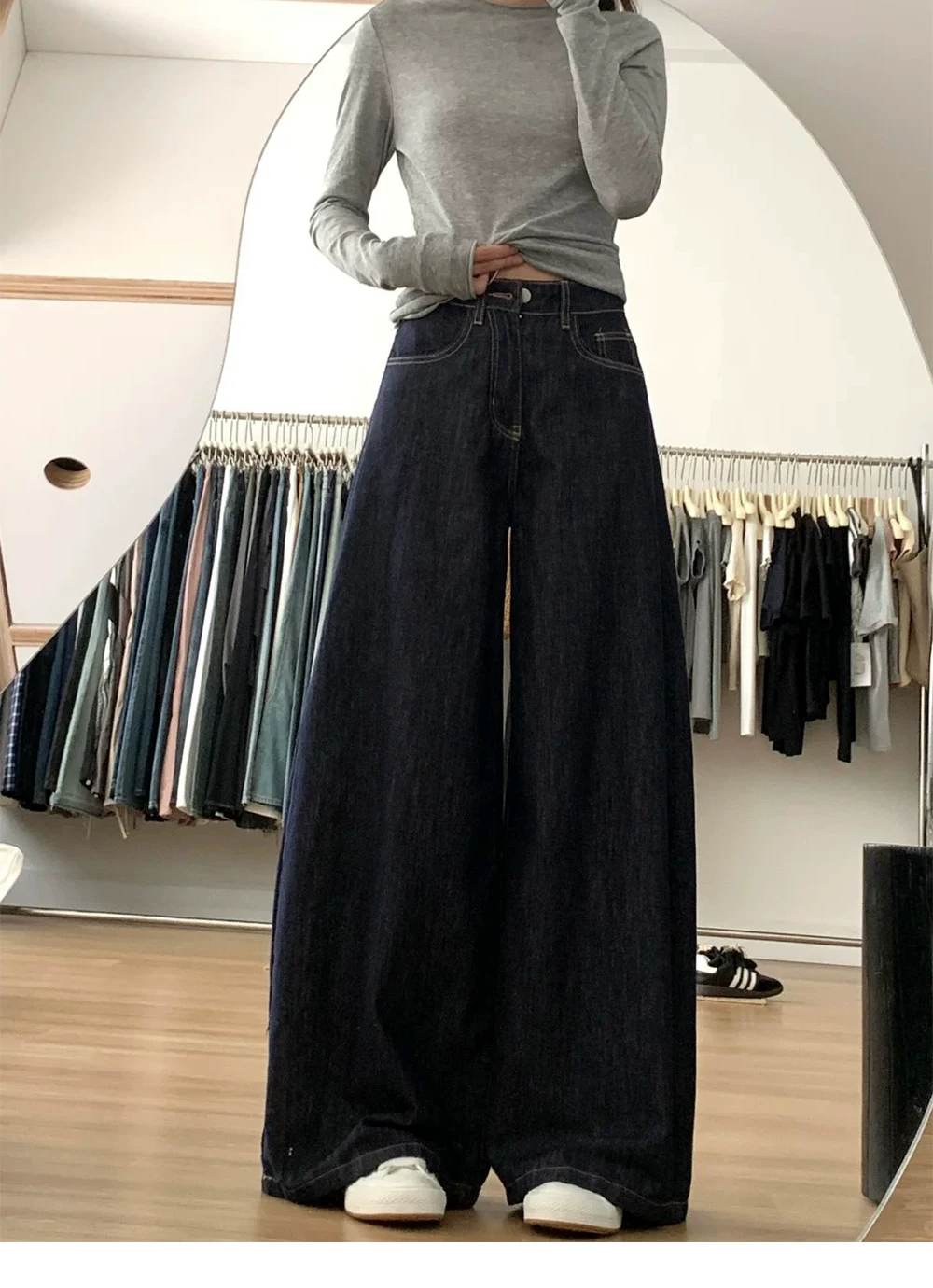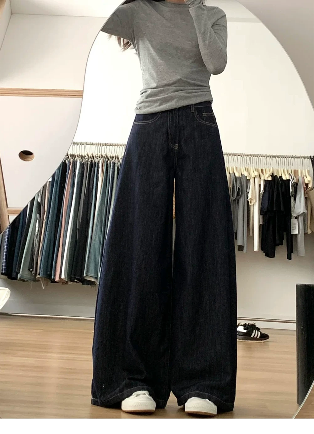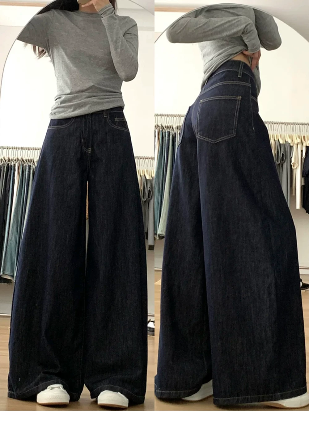 - Quần jean ống rộng chữ A lưng cao màu xanh đậm dành cho nữ, mùa thu, cỡ lớn, dáng rộng, tôn dáng, dáng quả lê, quần dài chạm sàn