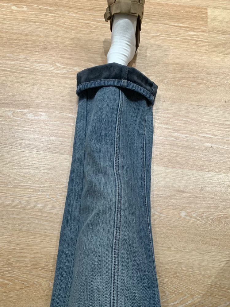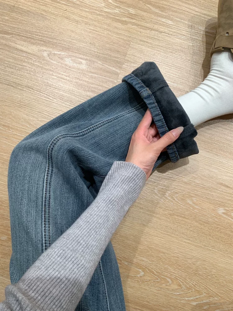- Quần jean ống rộng có họa tiết dày dặn lót lông cừu dành cho nữ, mùa thu đông, cỡ lớn, lưng cao, dáng rộng, dáng thon gọn, ống thẳng, quần dài đến sàn