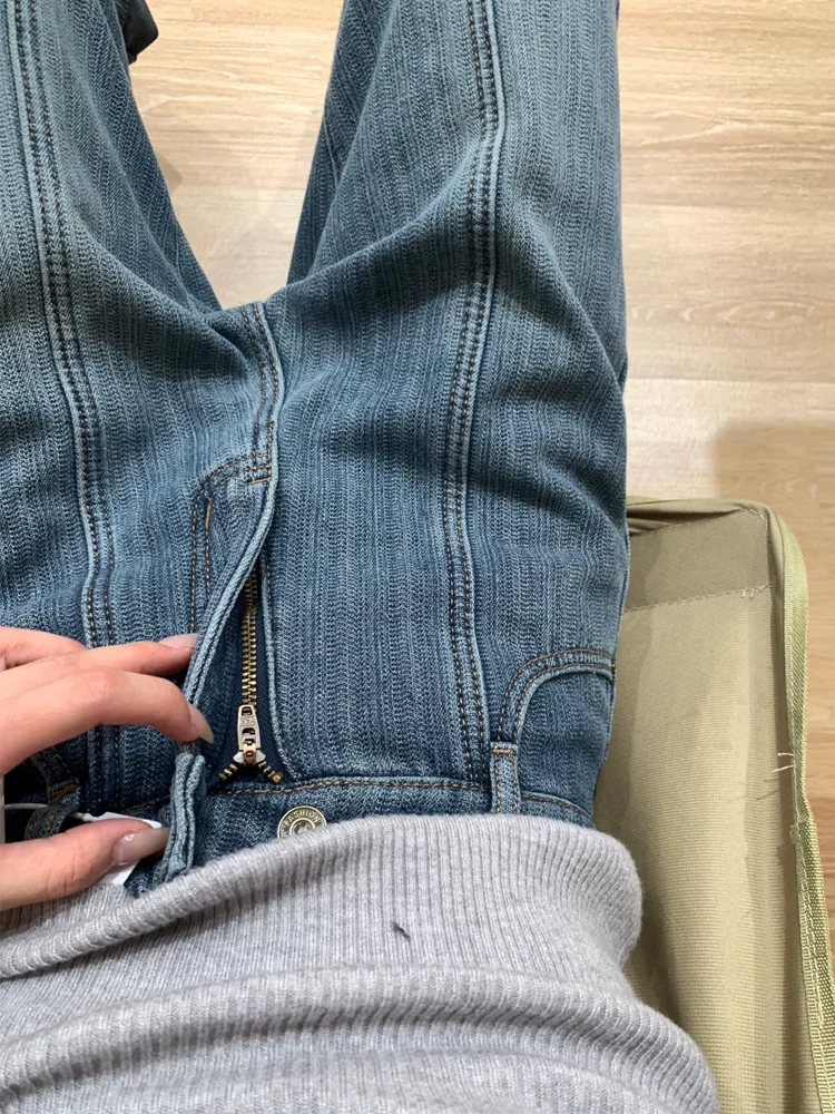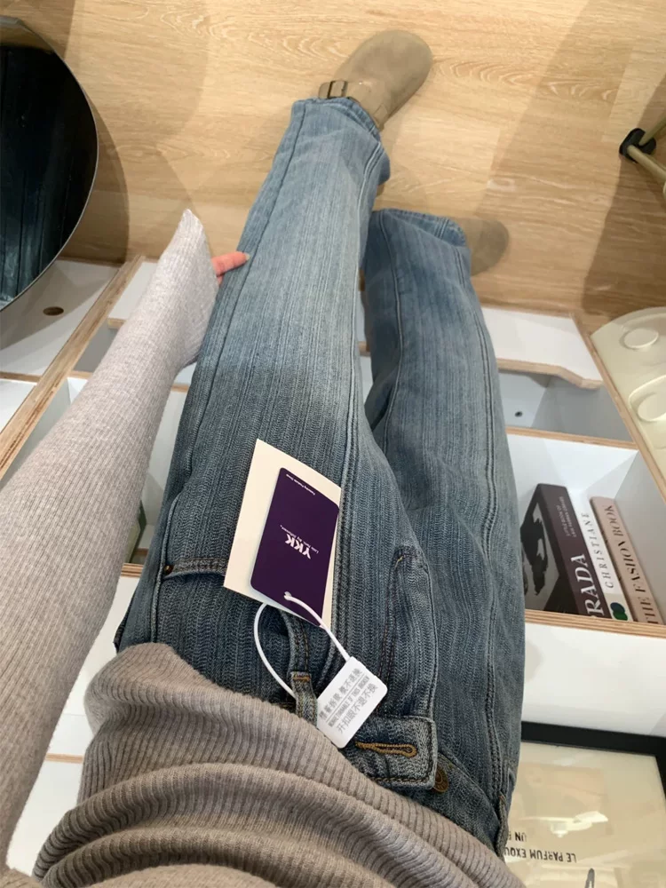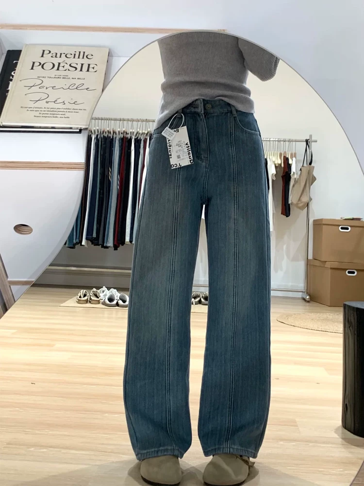Quần jean ống rộng có họa tiết dày dặn lót lông cừu dành cho nữ, mùa thu đông, cỡ lớn, lưng cao, dáng rộng, dáng thon gọn, ống thẳng, quần dài đến sàn