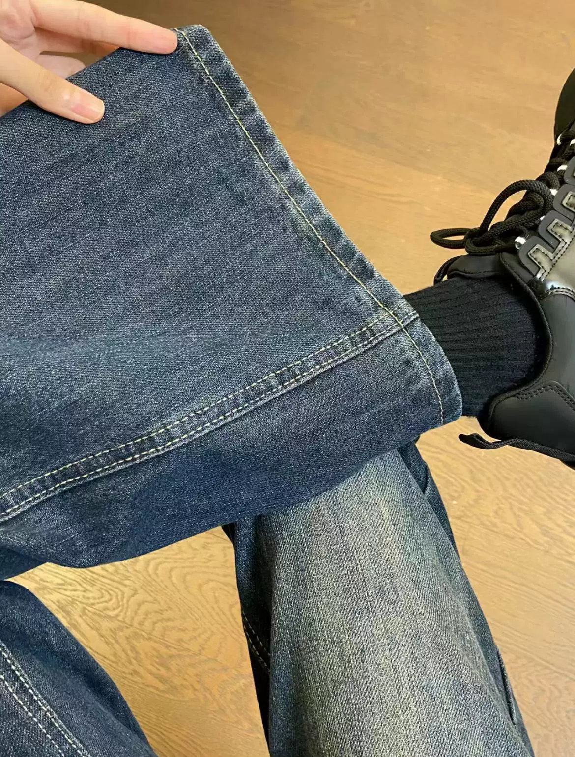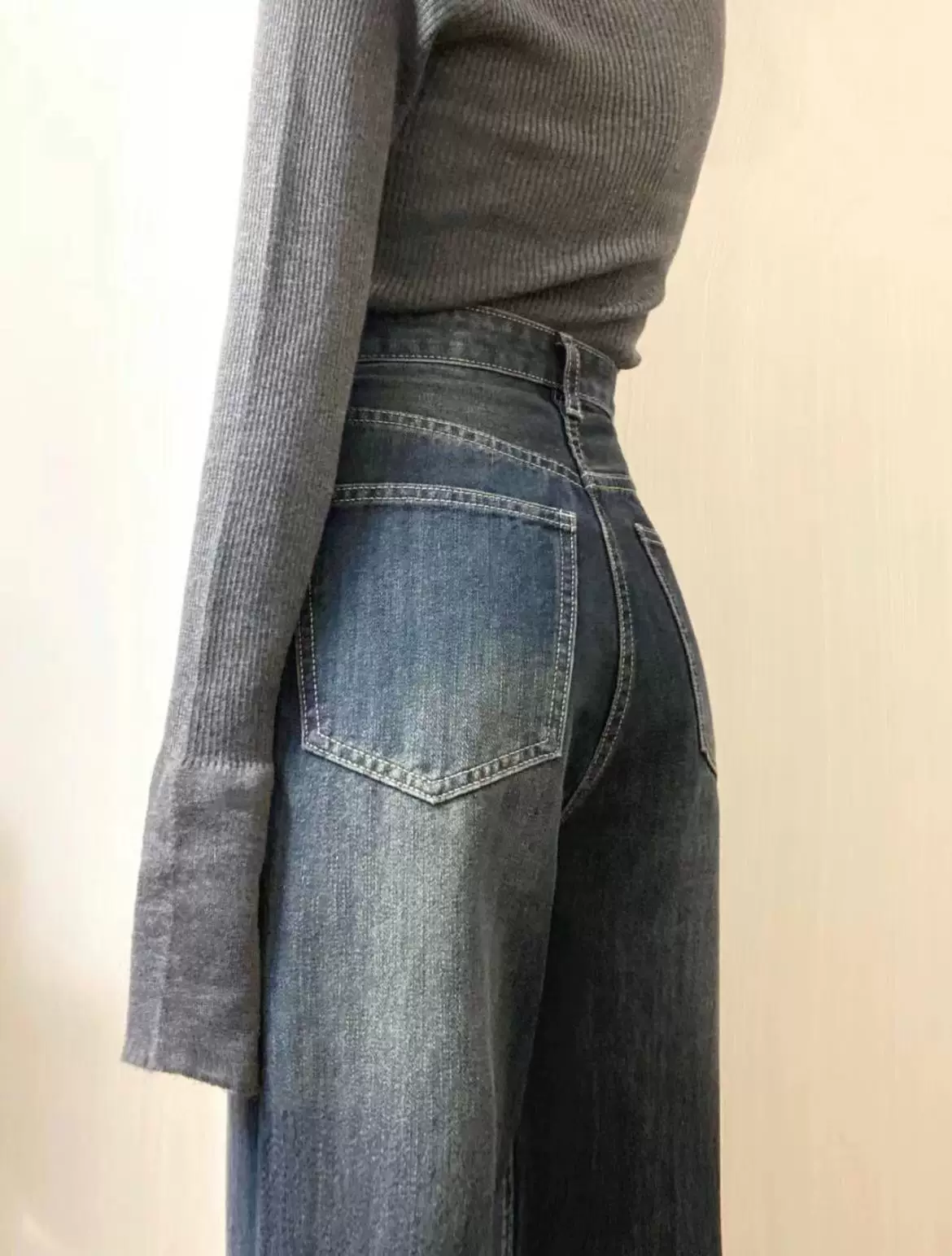 Quần jean ống rộng dáng chữ E màu xanh retro dành cho nữ, size lớn, cạp cao, dáng rộng, tôn dáng, dài chấm đất