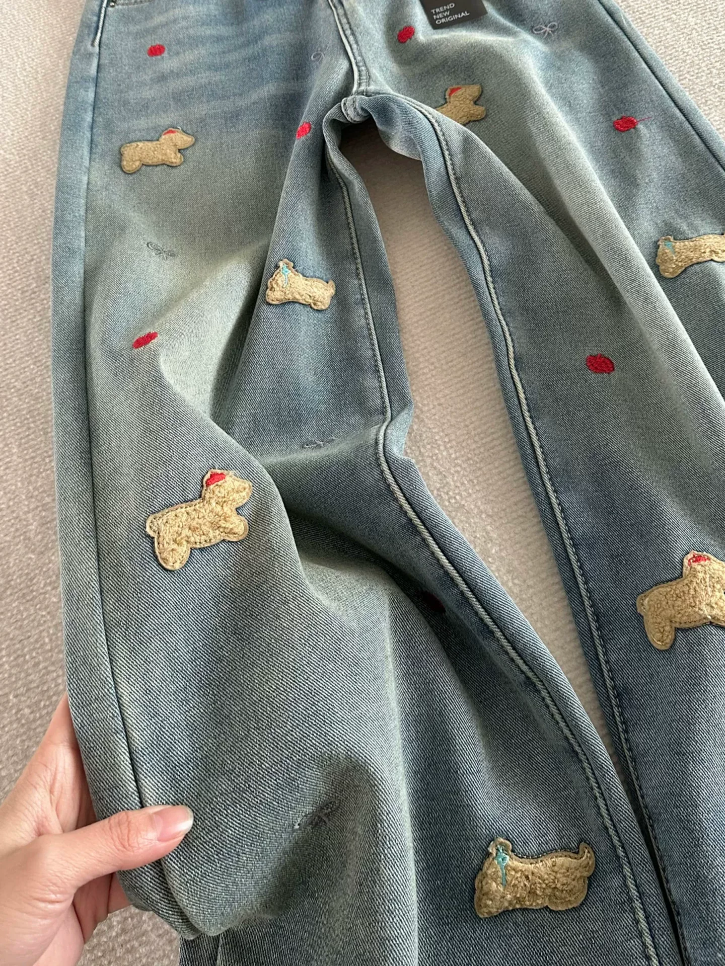 - Quần jean ống rộng dày có lót lông cừu thêu dành cho nữ, mùa thu đông, cỡ lớn, lưng cao, dáng rộng, dáng suông, quần ống đứng nhỏ nhắn.
