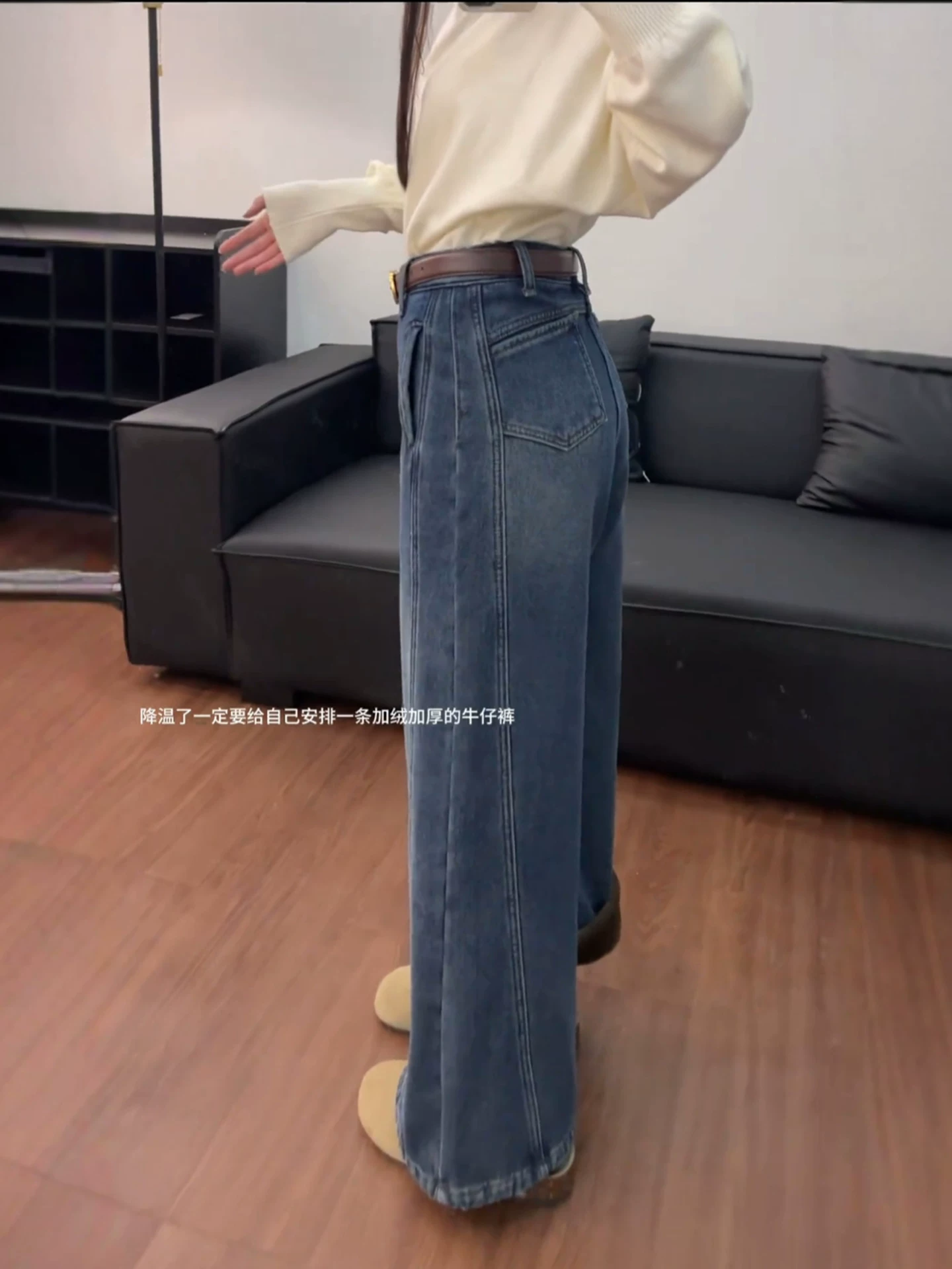 - Quần jean ống rộng dày lót lông cừu dành cho nữ, mùa thu đông, cỡ lớn, lưng cao, dáng rộng, mềm mại, tôn dáng, quần ống đứng nhỏ nhắn