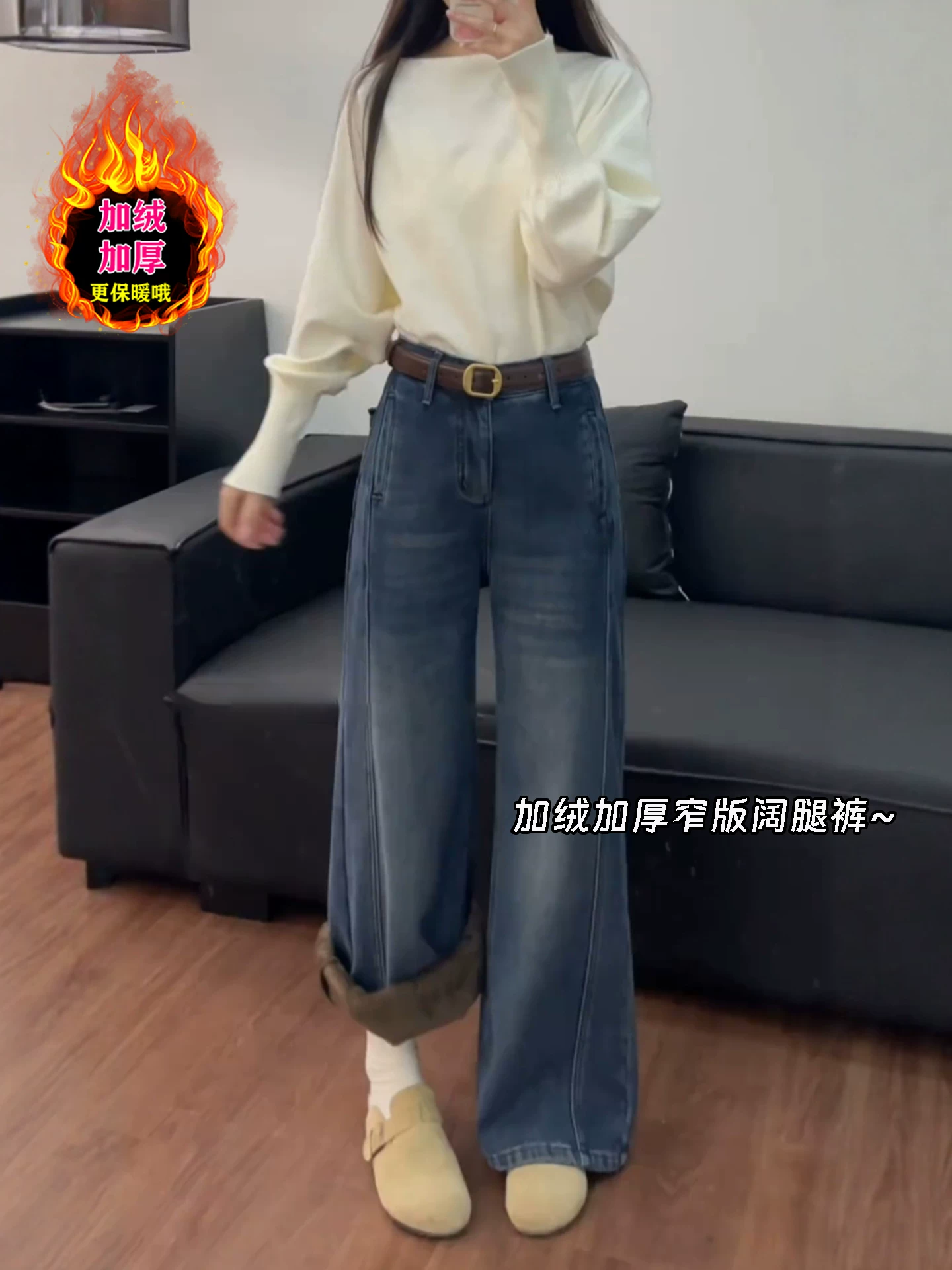 Quần jean ống rộng dày lót lông cừu dành cho nữ, mùa thu đông, cỡ lớn, lưng cao, dáng rộng, mềm mại, tôn dáng, quần ống đứng nhỏ nhắn