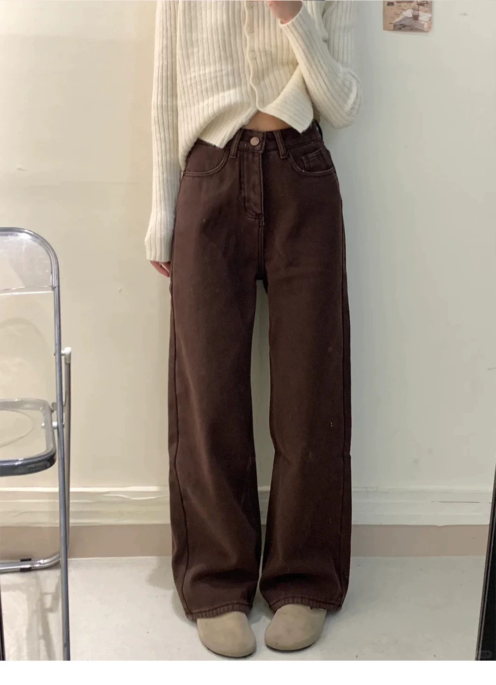 - Quần jean ống rộng dày lót lông cừu màu cà phê dành cho nữ, mùa thu đông, cỡ lớn, lưng cao, dáng rộng, quần ống thẳng không bó sát