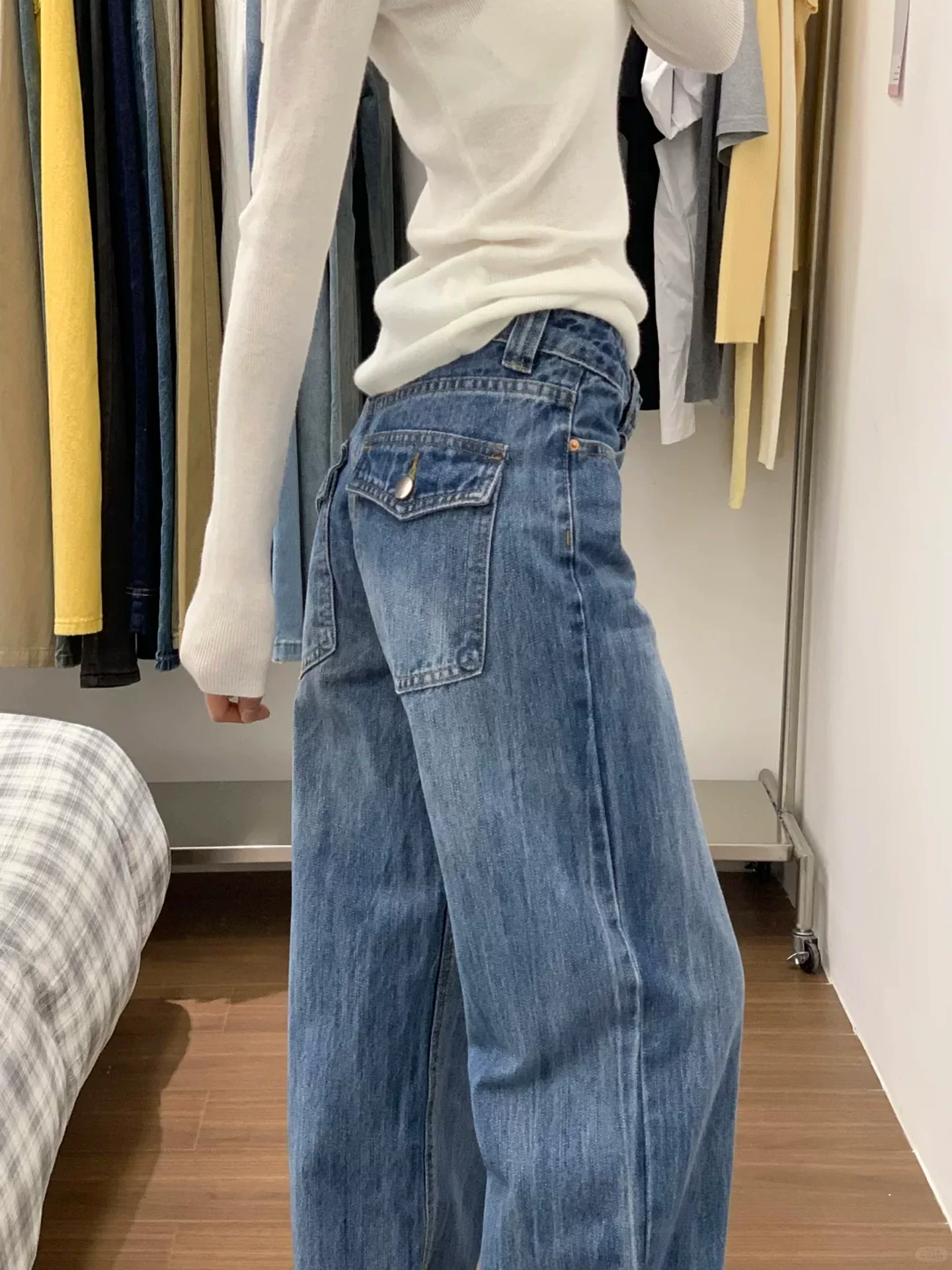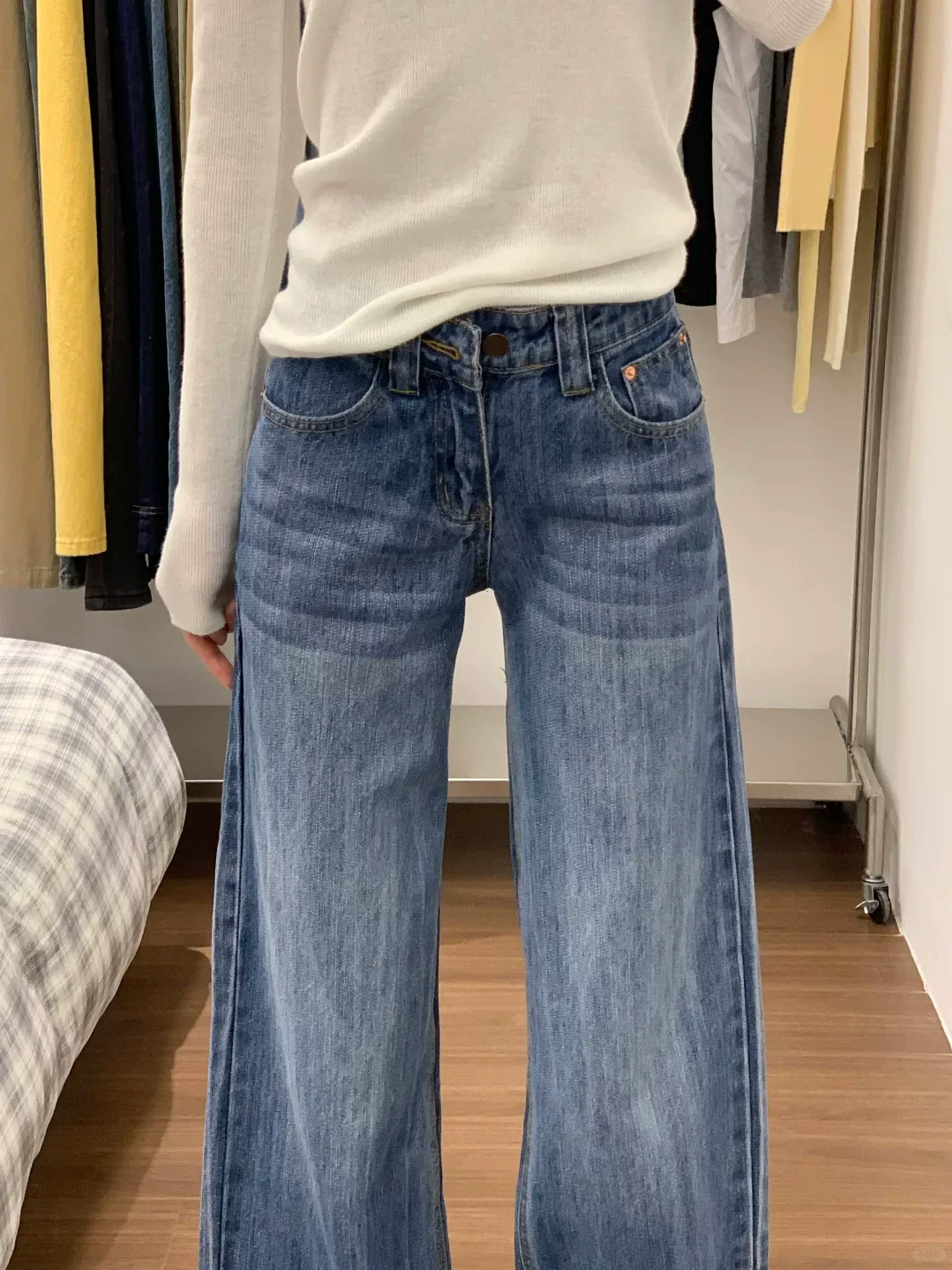 Quần jean ống rộng kiểu Mỹ dành cho nữ, đầu thu, cỡ lớn, thiết kế tinh tế, lưng cao, dáng rộng, tôn dáng, thân hình quả lê, quần ống thẳng
