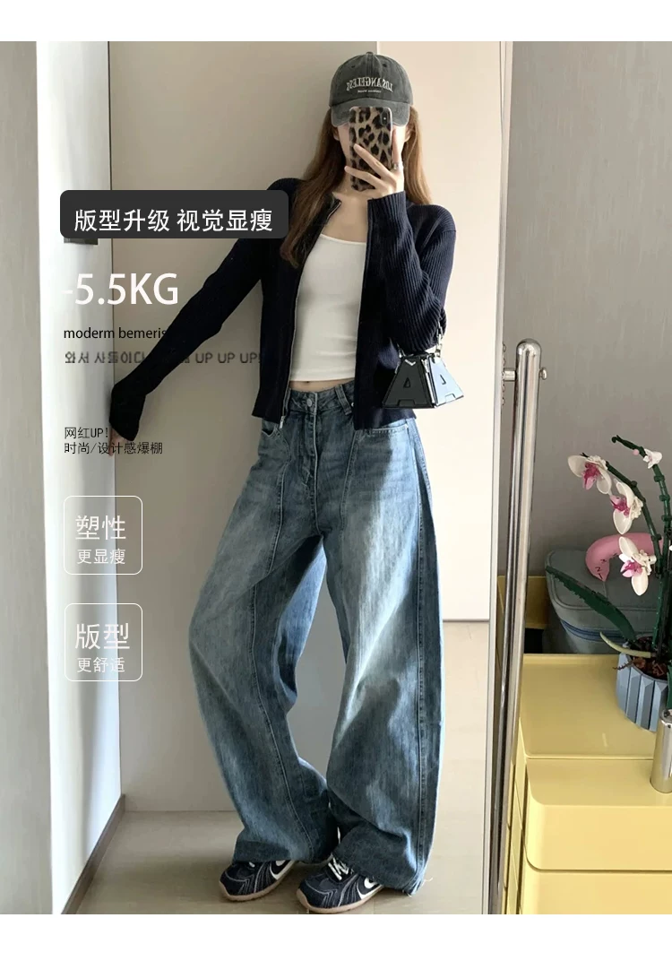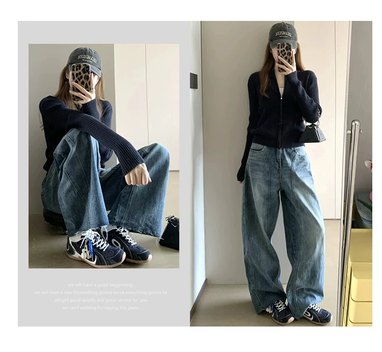 - Quần jean ống rộng kiểu retro Mỹ dành cho nữ, phong cách mùa thu mới, cỡ lớn, lưng cao, dáng rộng, quần liềm dáng thon gọn.