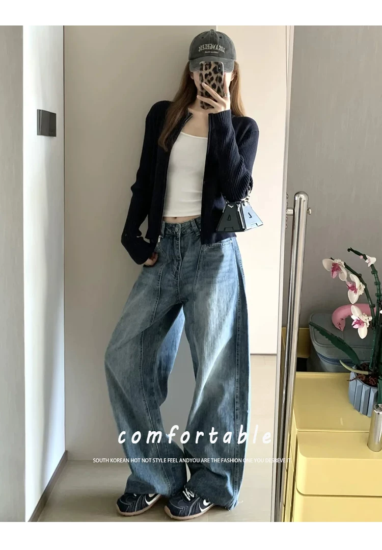 Quần jean ống rộng kiểu retro Mỹ dành cho nữ, phong cách mùa thu mới, cỡ lớn, lưng cao, dáng rộng, quần liềm dáng thon gọn.
