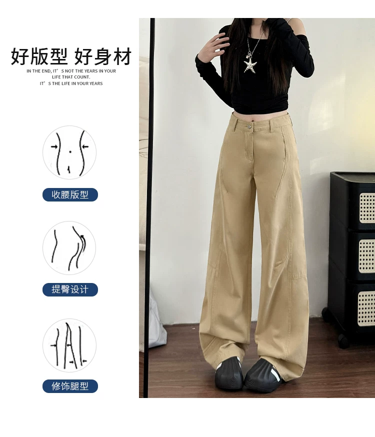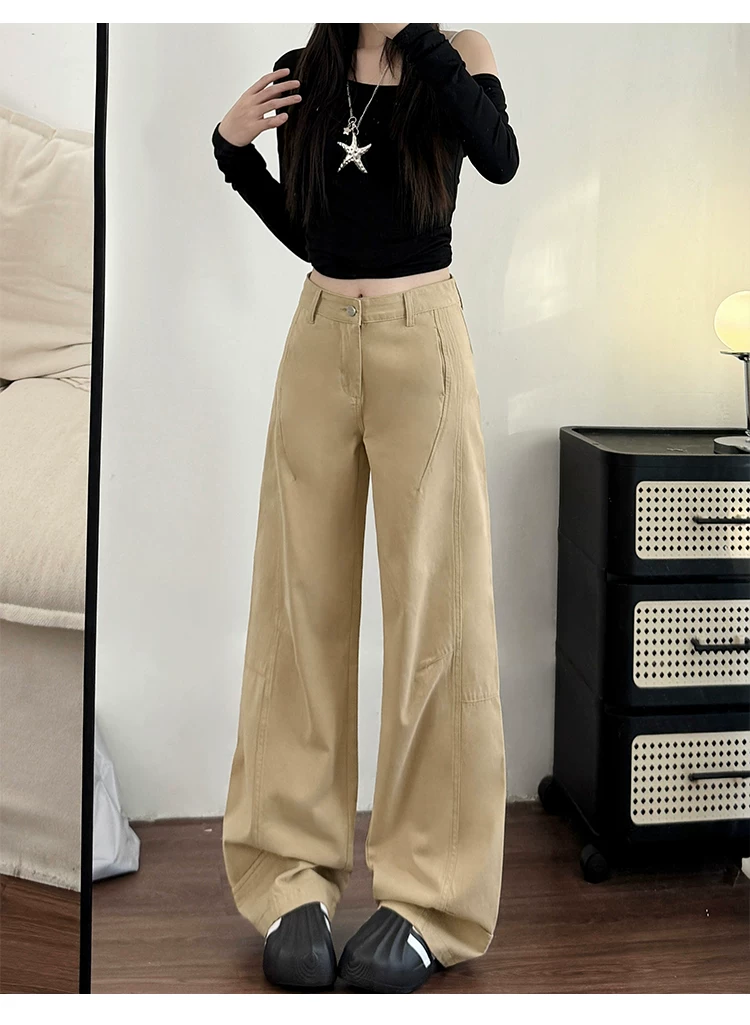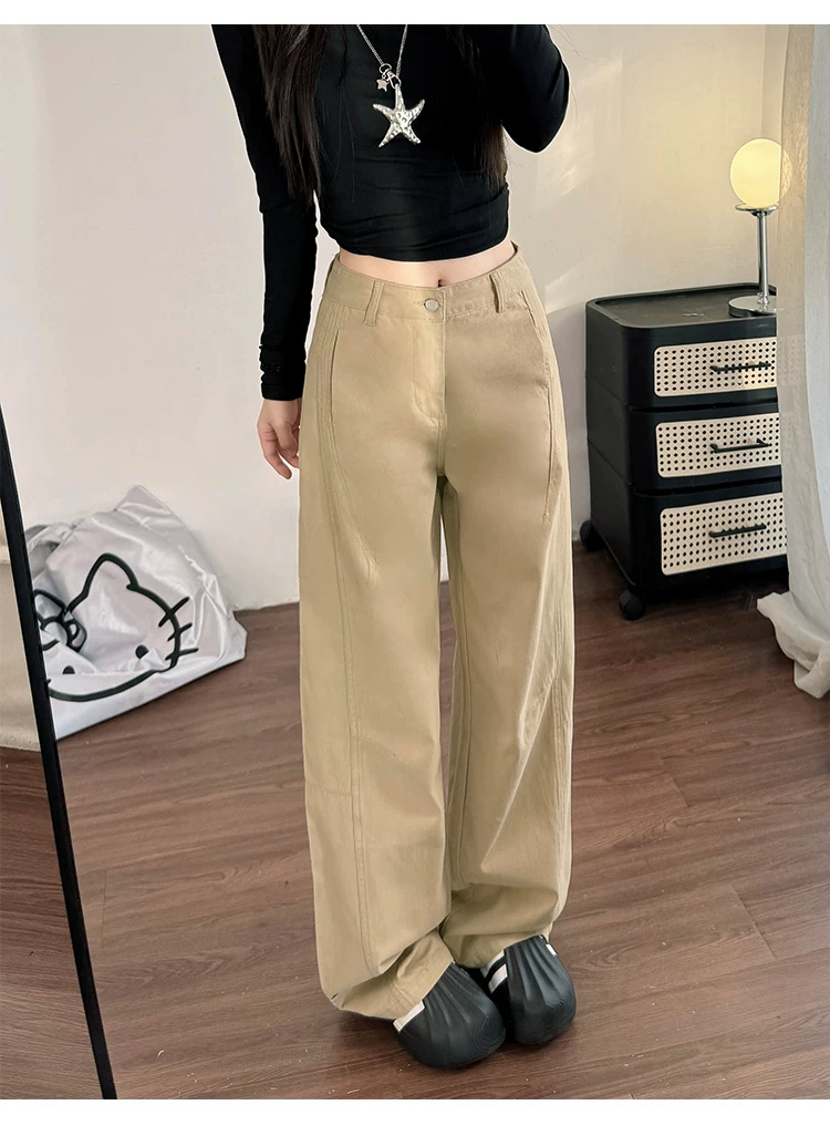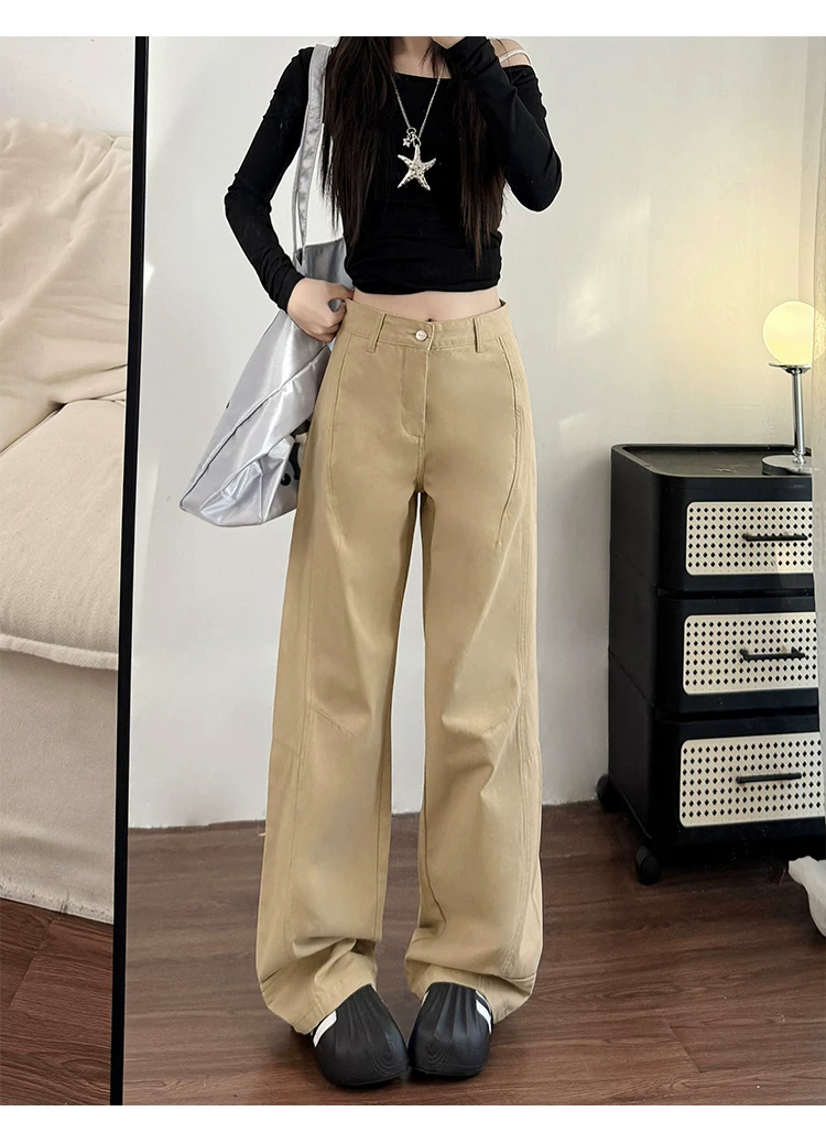 Quần jean ống rộng màu kaki cho nữ, kiểu dáng mùa thu mới, cỡ lớn, lưng cao, dáng rộng, dáng thon gọn, dáng quả lê, quần ống thẳng