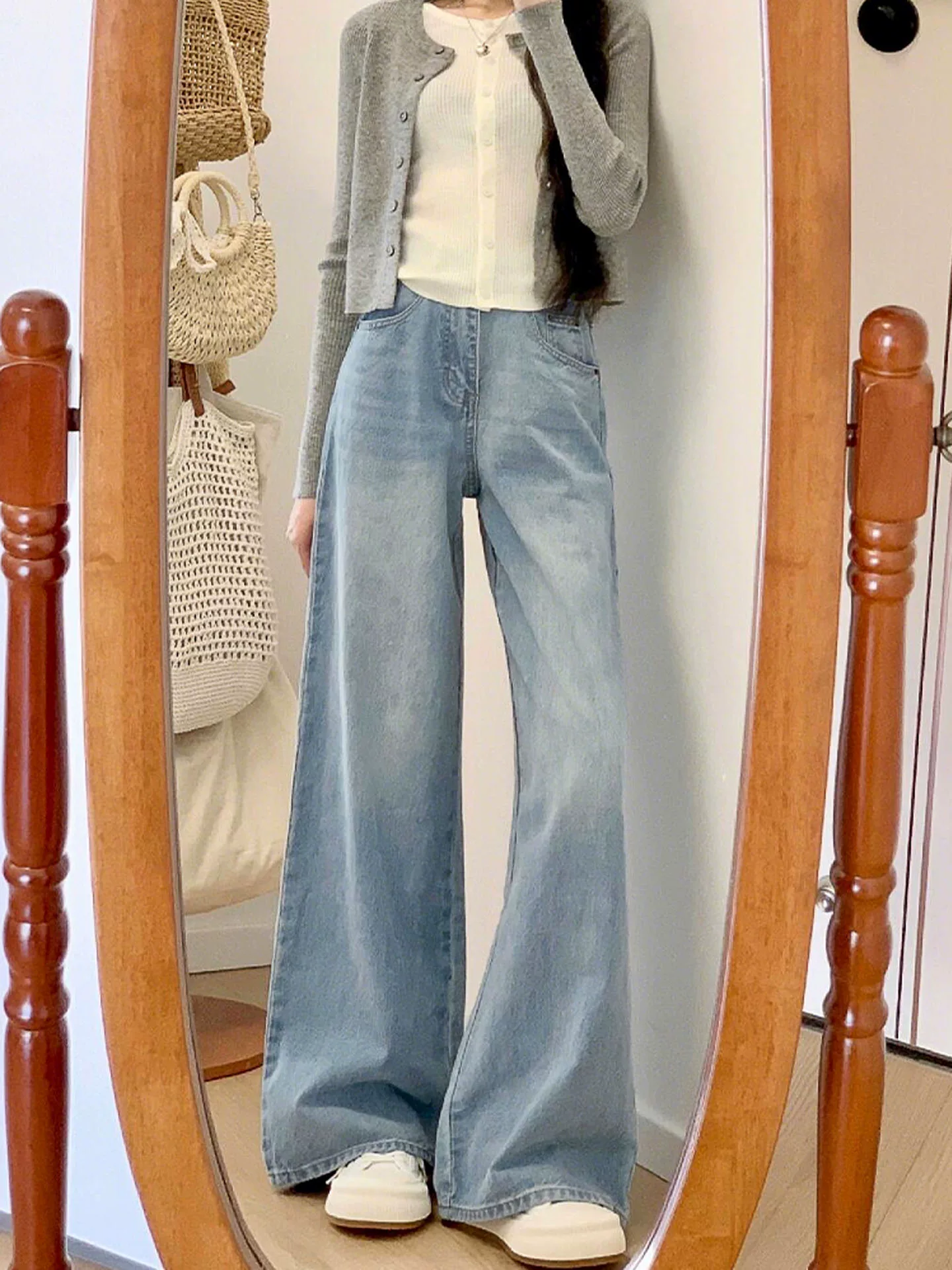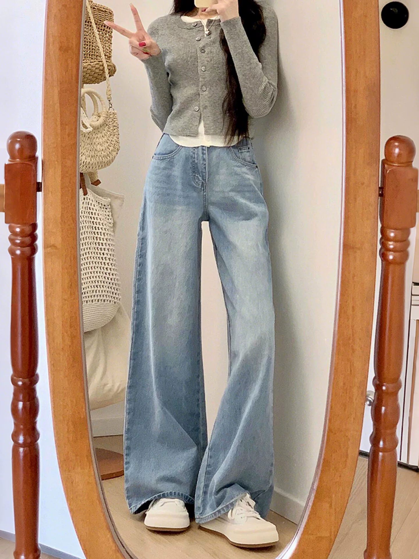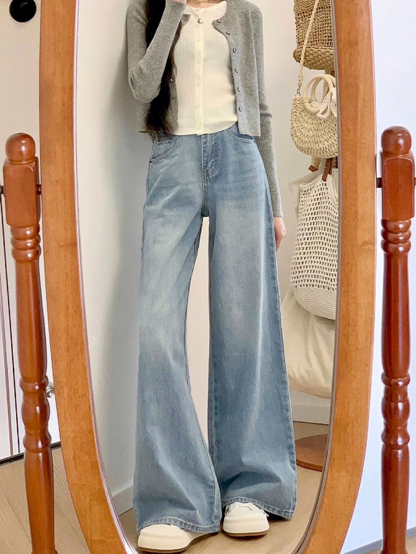 - Quần jean ống rộng màu sáng cho nữ, kiểu dáng mùa thu mới, cỡ lớn, lưng cao, dáng rộng, giảm béo, dáng quả lê, quần ống thẳng