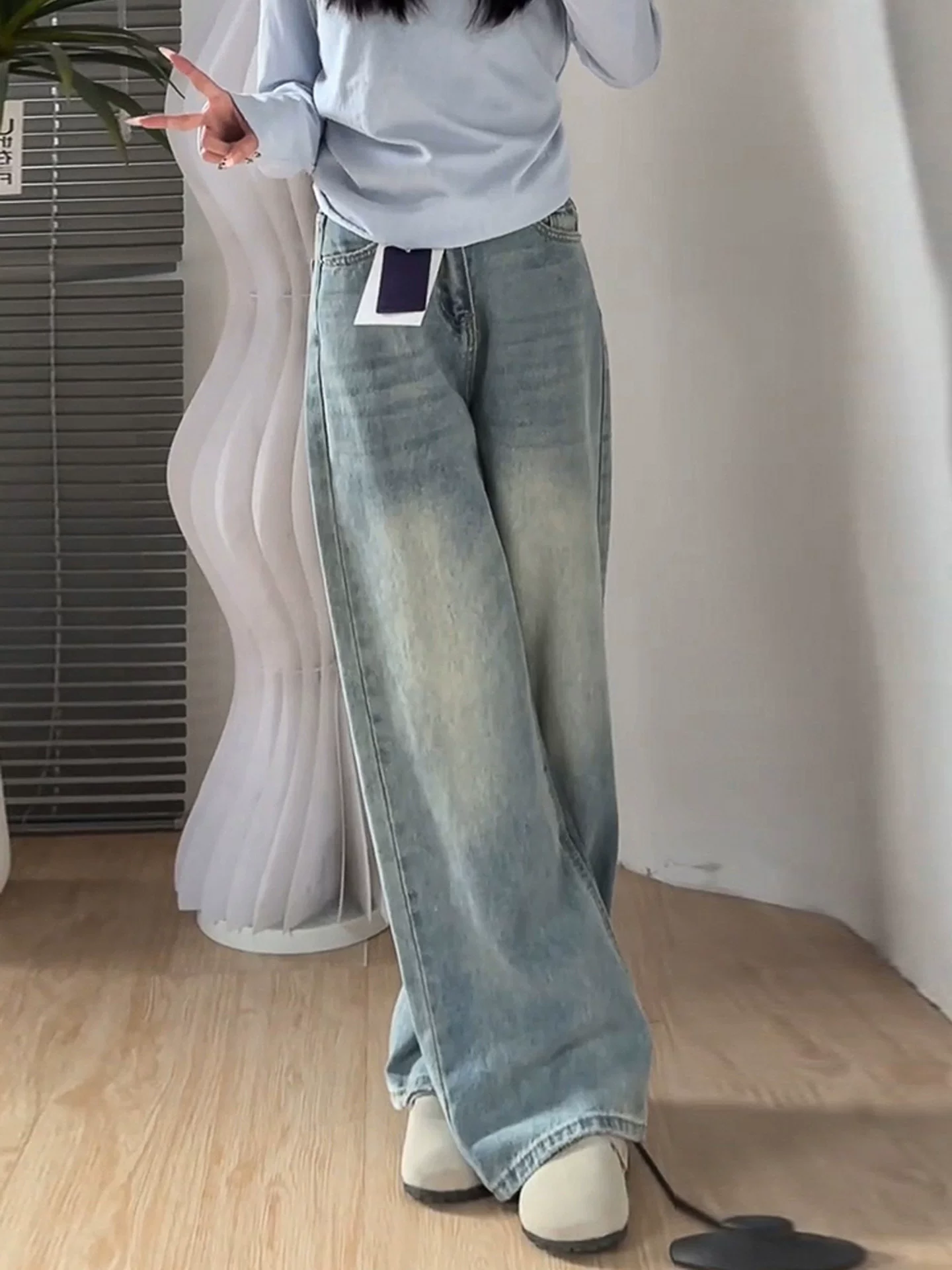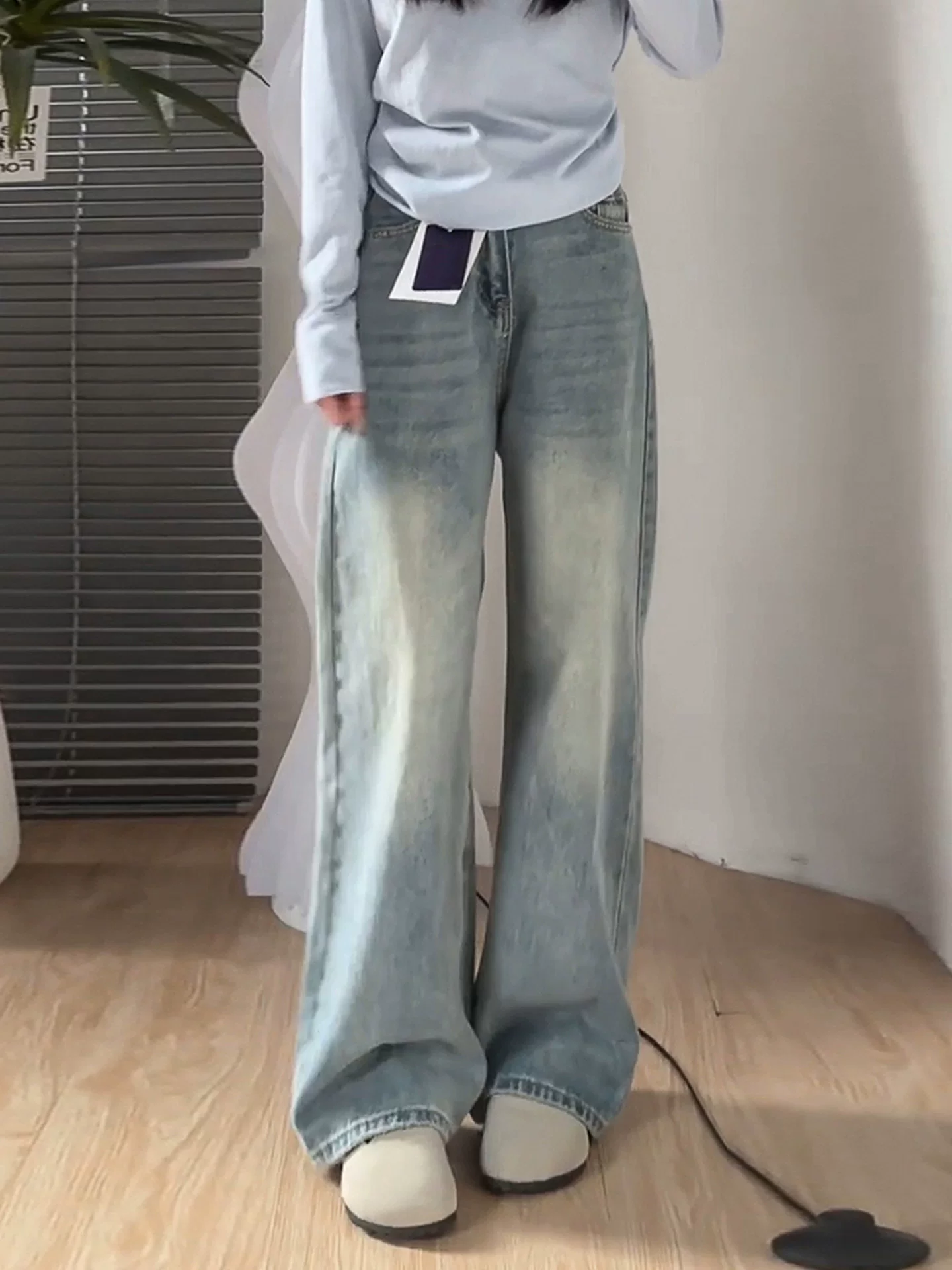 - Quần jean ống rộng màu sáng cho nữ, mùa thu, cỡ lớn, lưng cao, dáng rộng, thon gọn, dáng quả lê, ống thẳng, quần dài chạm sàn