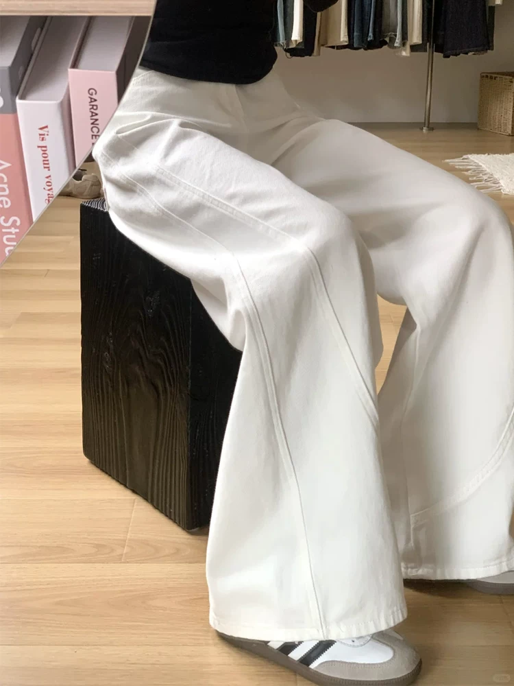 Quần jean ống rộng màu trắng cho nữ, mùa thu, cỡ lớn, lưng cao, dáng rộng, thon gọn, dáng quả lê, vạt cong, quần dài chạm sàn
