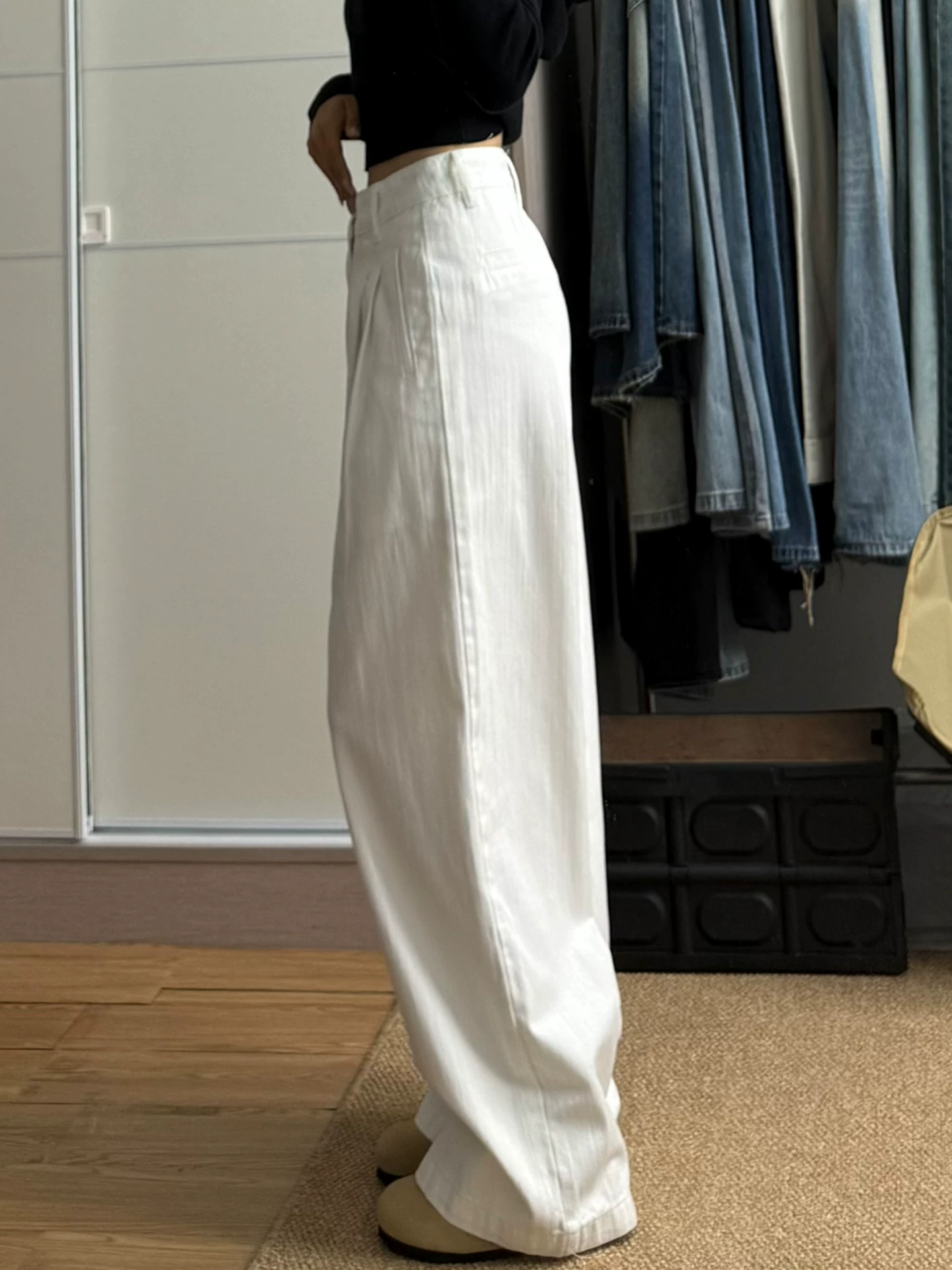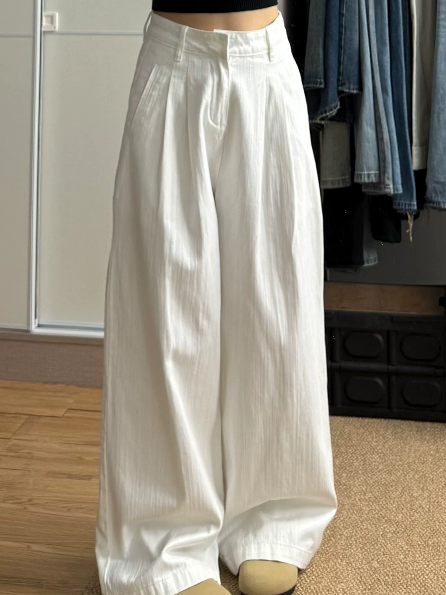 - Quần jean ống rộng màu trắng cho nữ, phong cách mùa thu, cỡ lớn, lưng cao, dáng suôn, rộng rãi, tôn dáng, dáng quả lê, quần ống thẳng