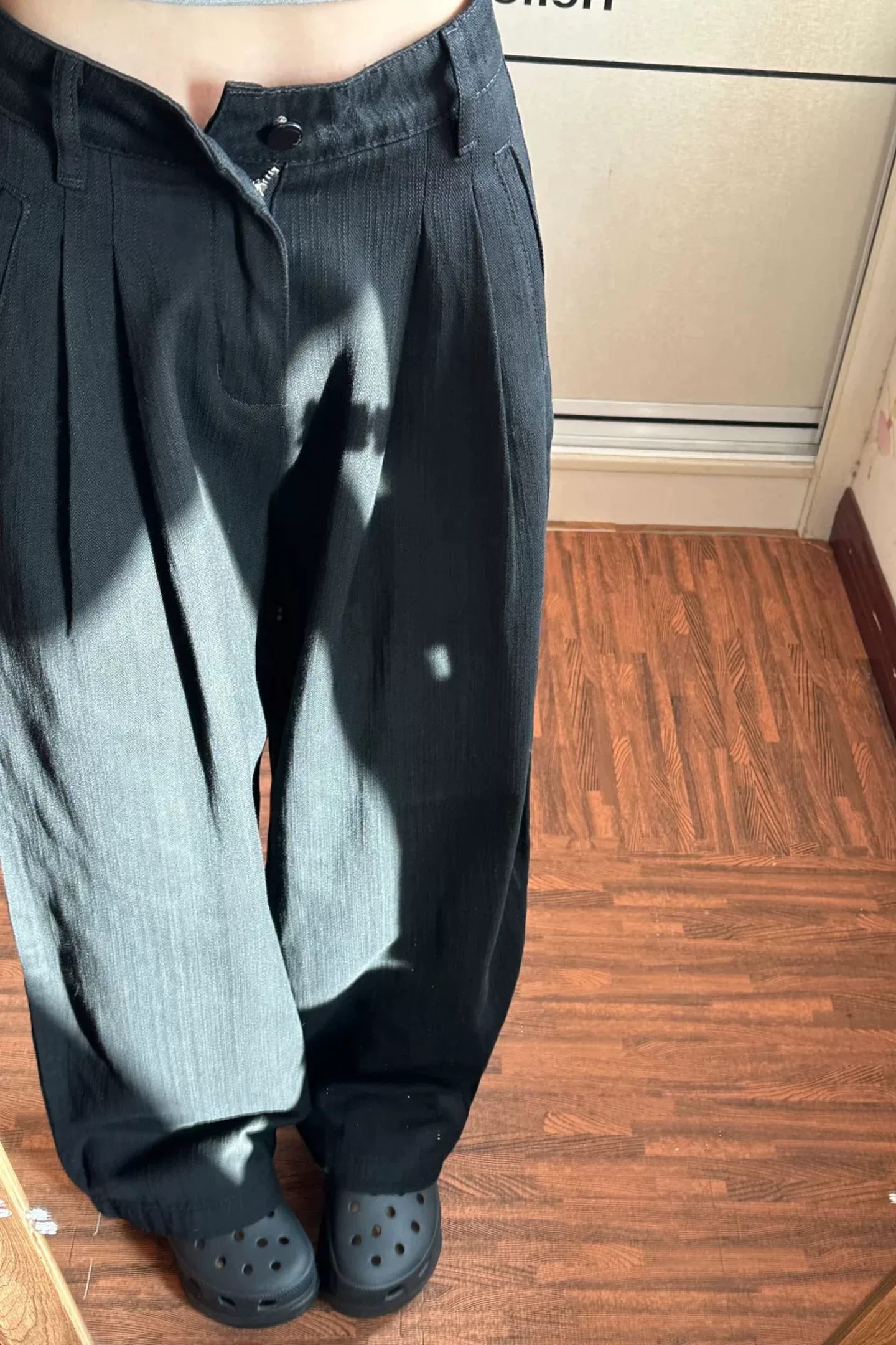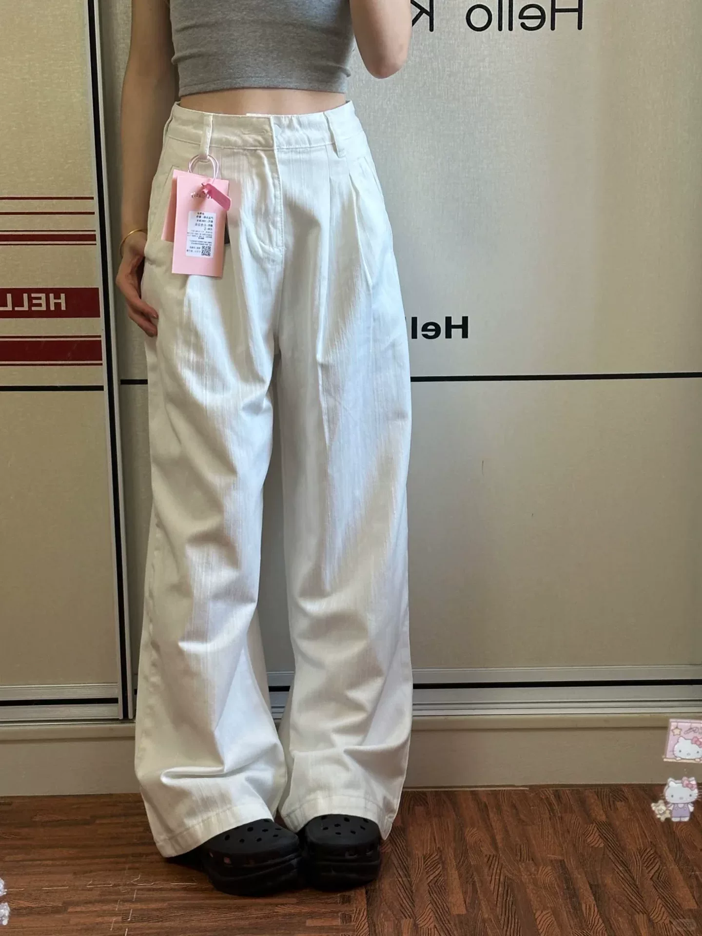 Quần jean ống rộng màu trắng có họa tiết dành cho nữ, phong cách đầu thu, cỡ lớn, lưng cao, dáng rộng, che hông, giảm béo, quần ống thẳng