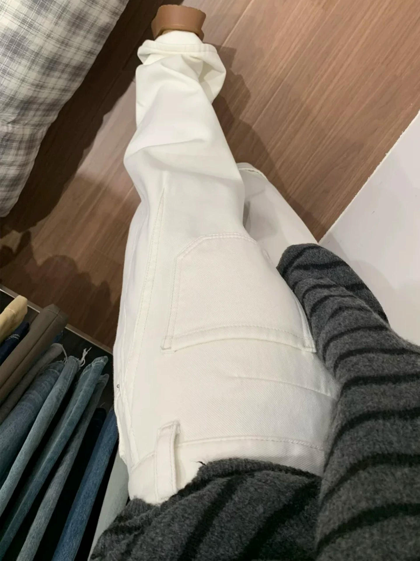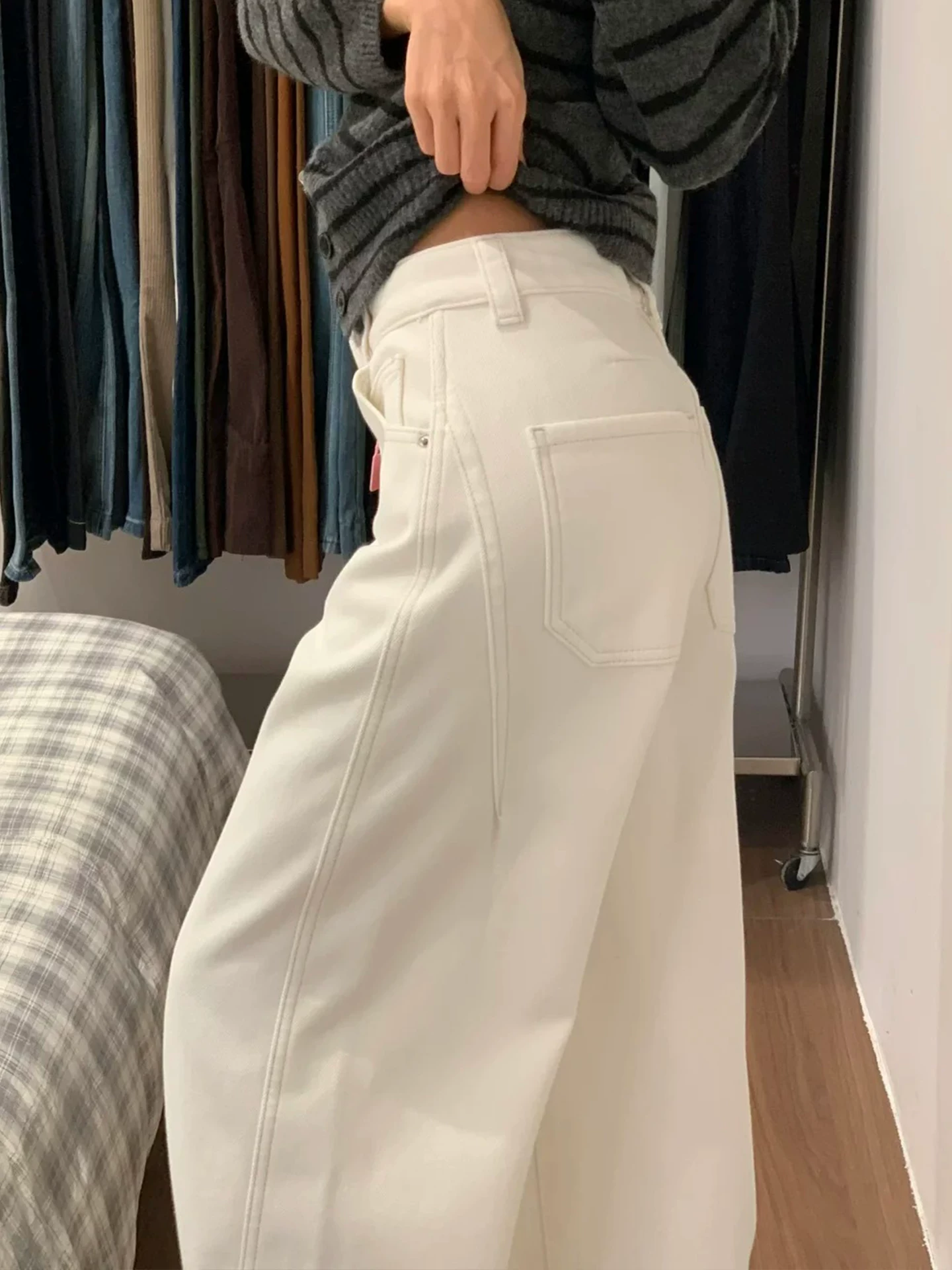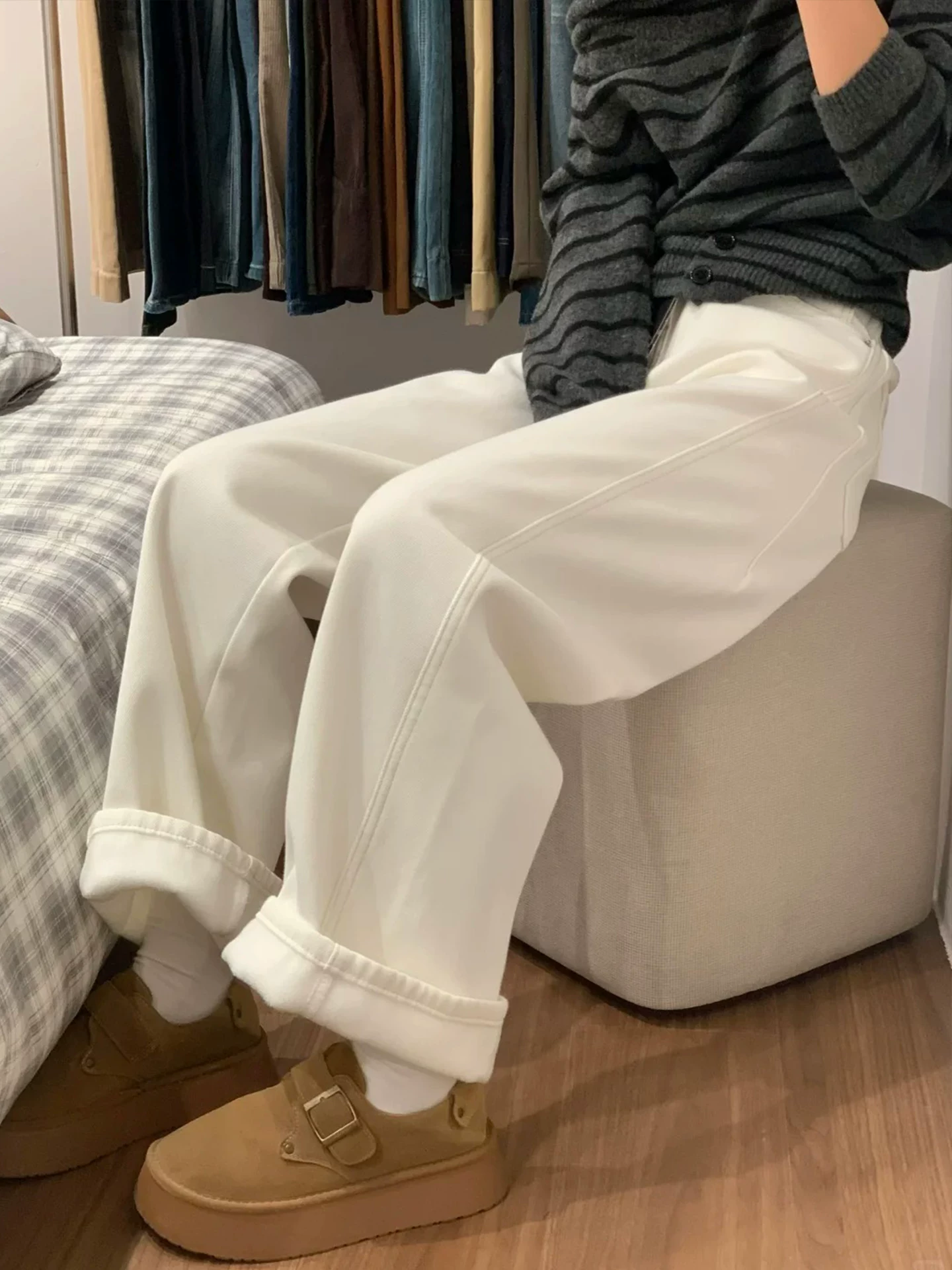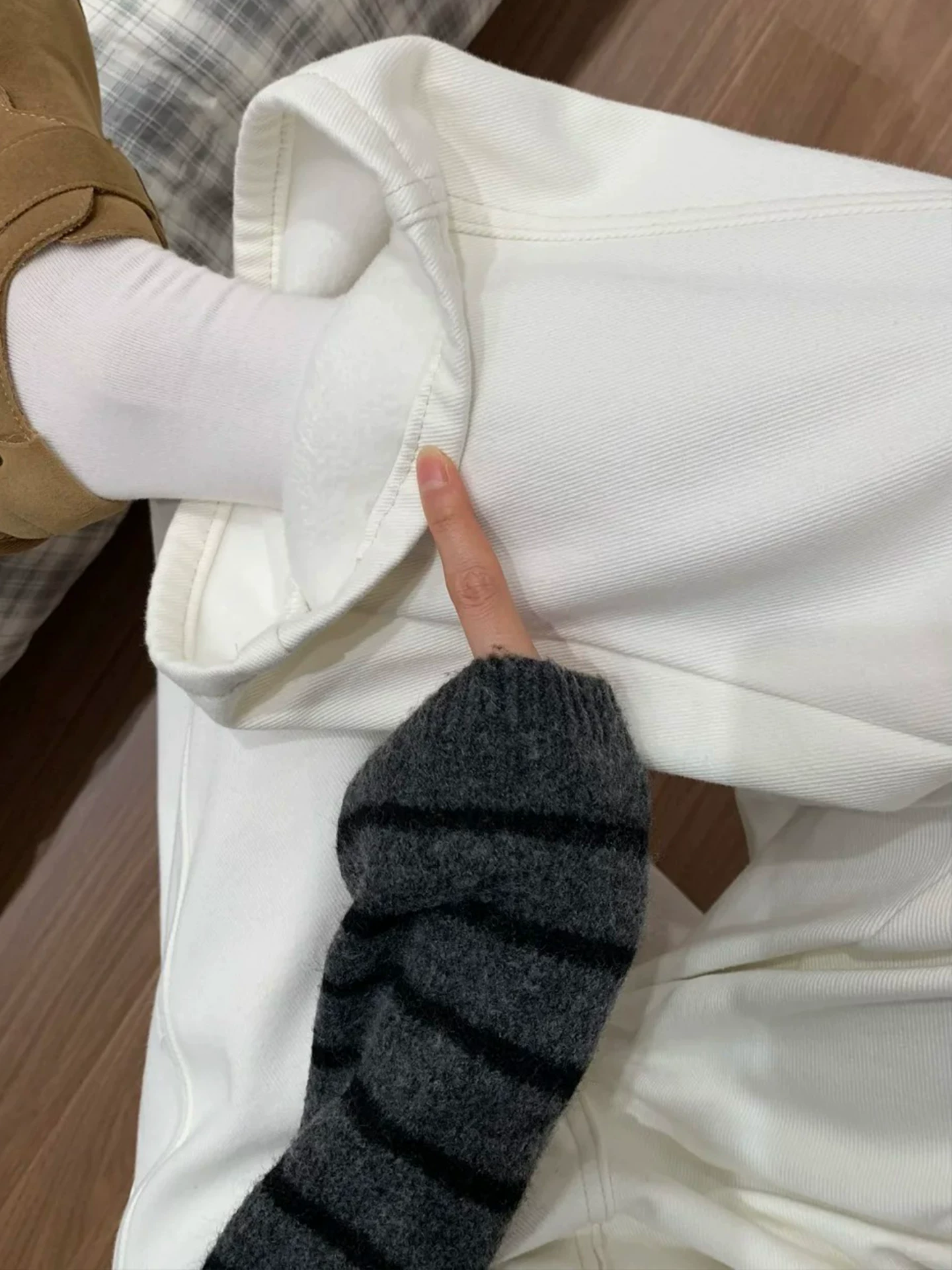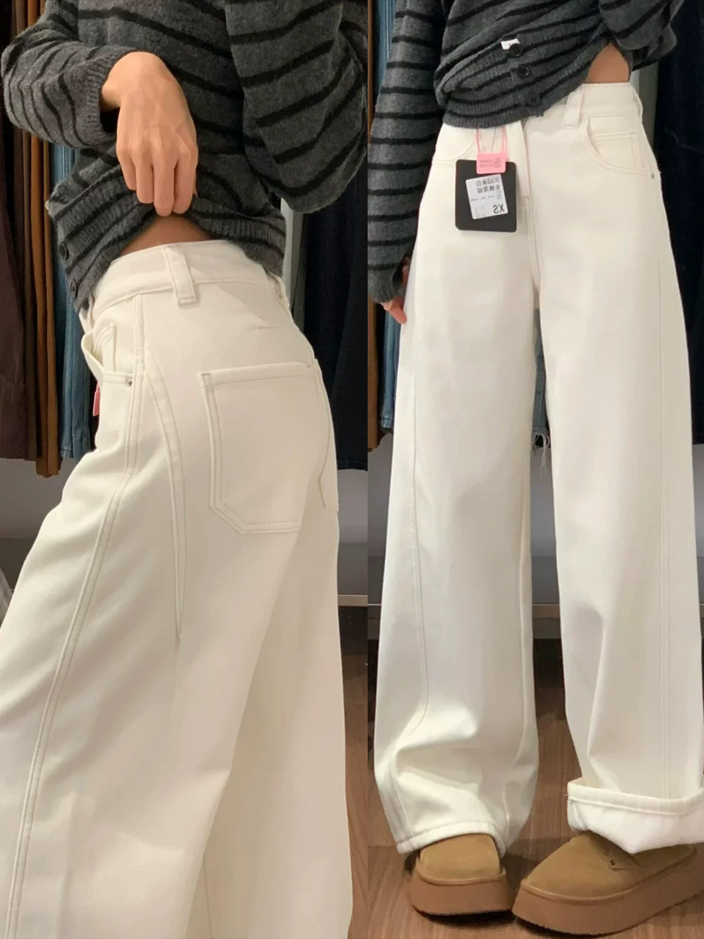 - Quần jean ống rộng màu trắng dành cho nữ, mùa đông, cỡ lớn, lót lông cừu, dày dặn, cạp cao, dáng rộng, tôn dáng, dáng quả lê, quần ống thẳng