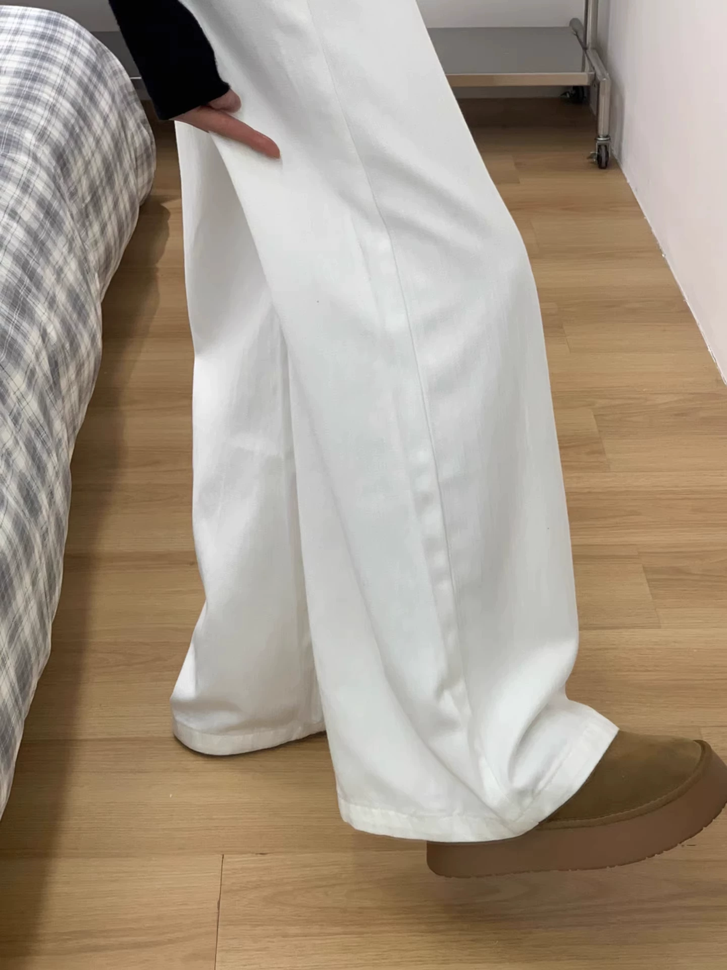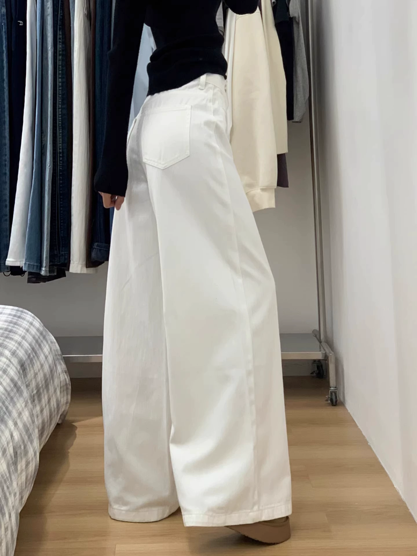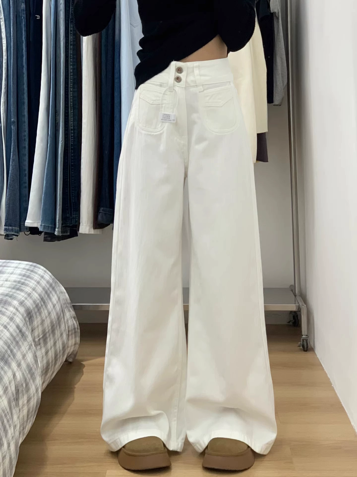 Quần jean ống rộng màu trắng dành cho nữ, mùa thu đông, lót lông cừu, dày, cỡ lớn, lưng cao, dáng rộng, giảm béo, ống thẳng, quần dài đến sàn.