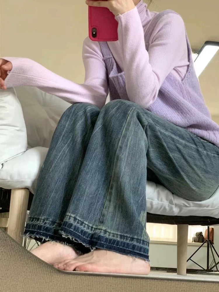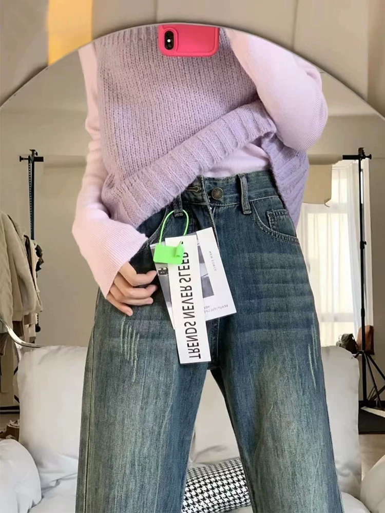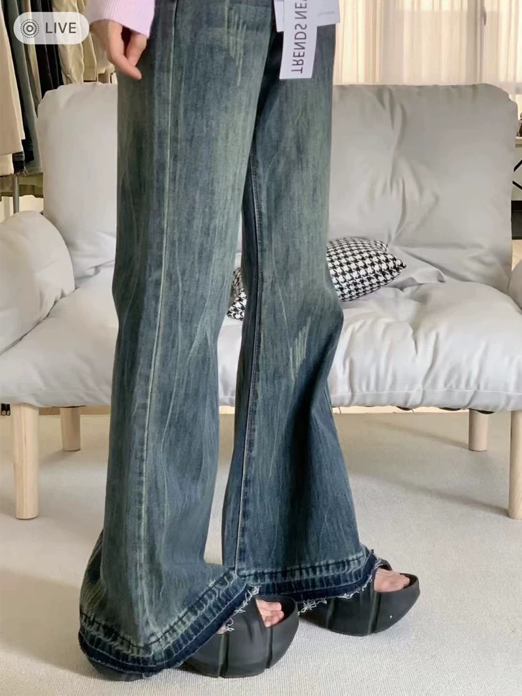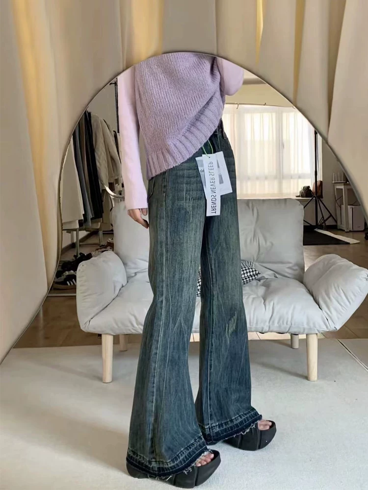 Quần jean ống rộng màu xanh cổ điển dành cho nữ, cỡ lớn, phong cách đầu xuân, lưng cao, dáng rộng, tôn dáng, không bó sát, kiểu quần bootcut.