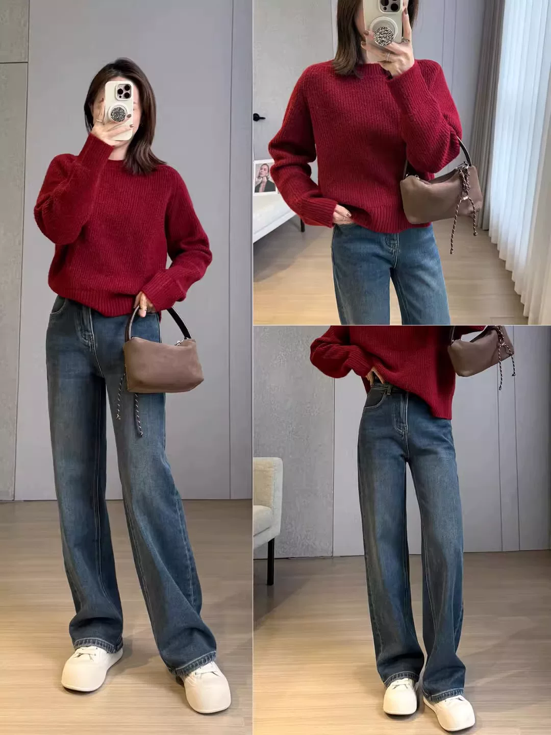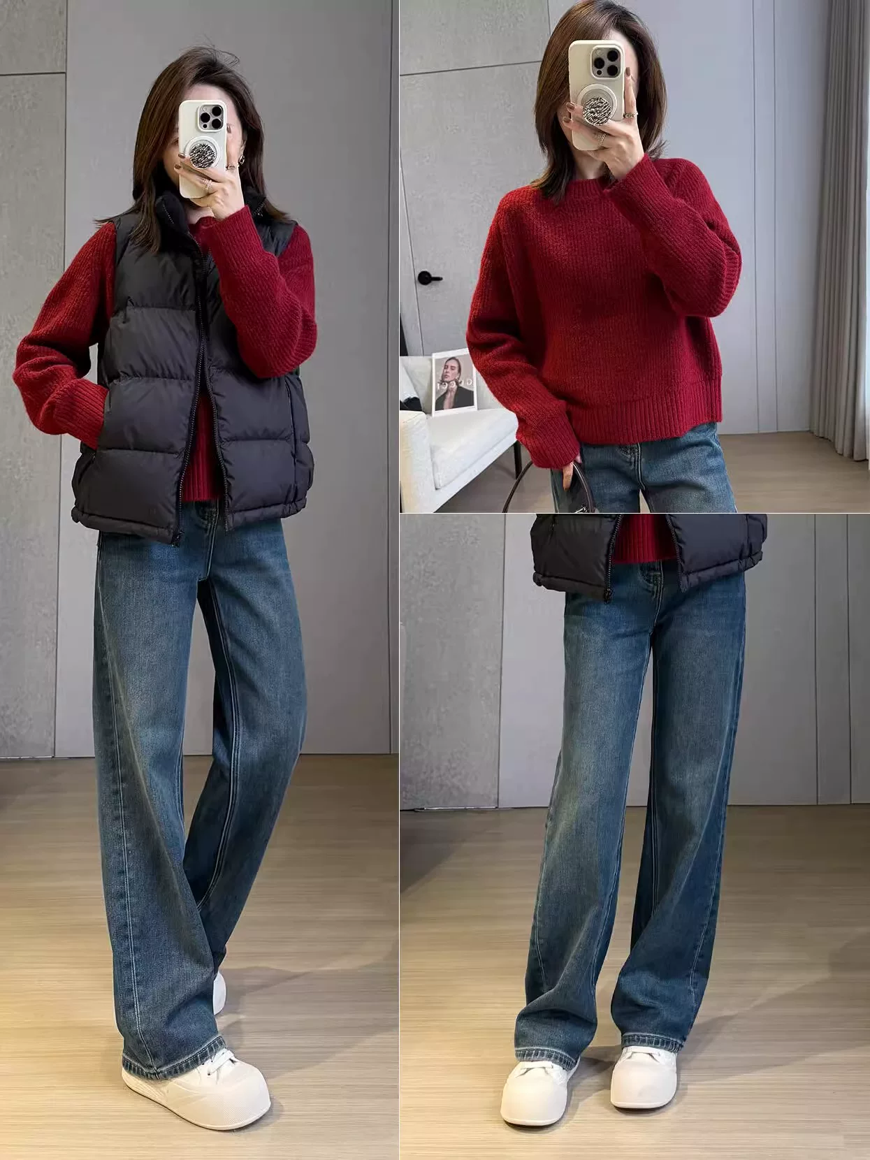 - Quần jean ống rộng màu xanh cổ điển dành cho nữ, kiểu dáng mùa xuân mới, cỡ lớn, lưng cao, che hông, giảm béo, ống thẳng, quần dài chạm sàn.