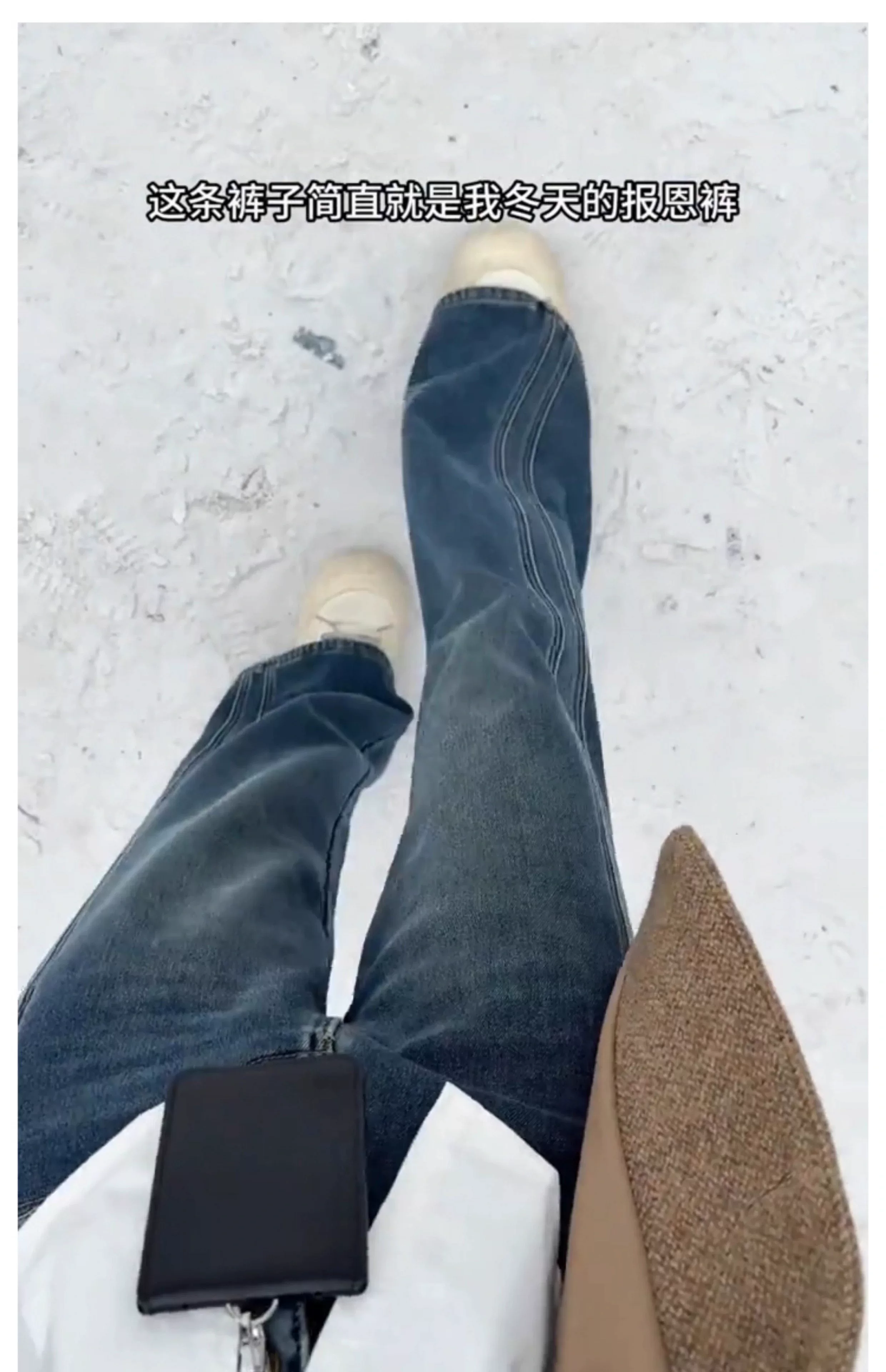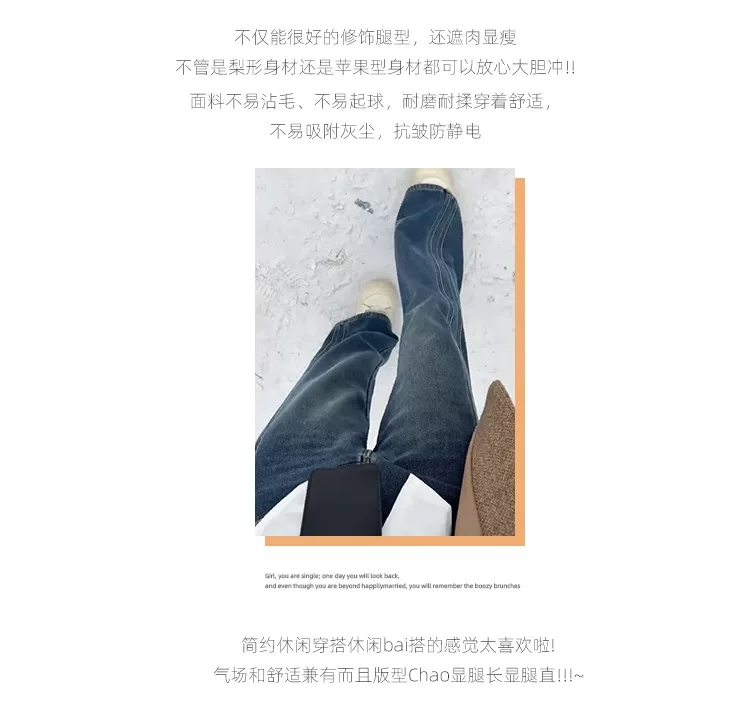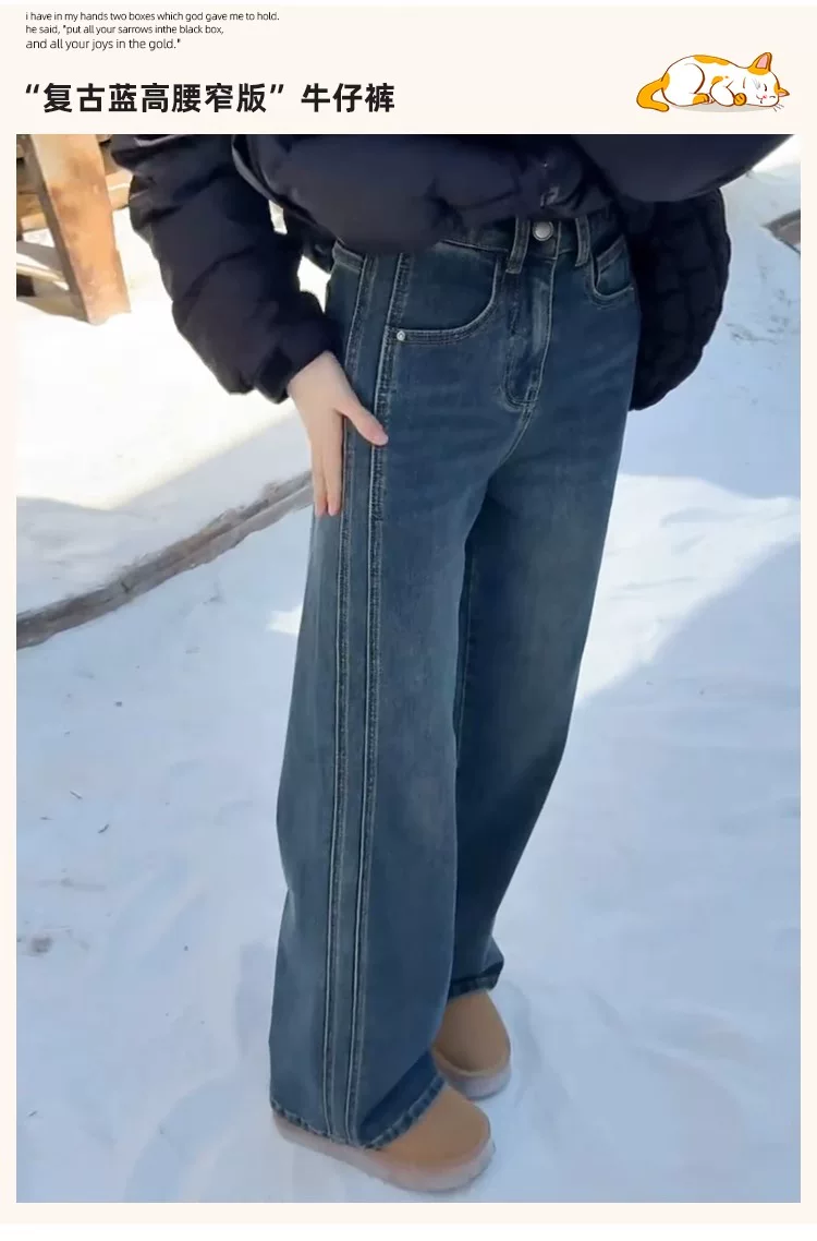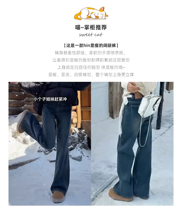 Quần jean ống rộng màu xanh cổ điển dành cho nữ, mùa thu đông, lót lông cừu, dày, cỡ lớn, lưng cao, dáng rộng, tôn dáng, ống thẳng, quần dài chạm sàn.
