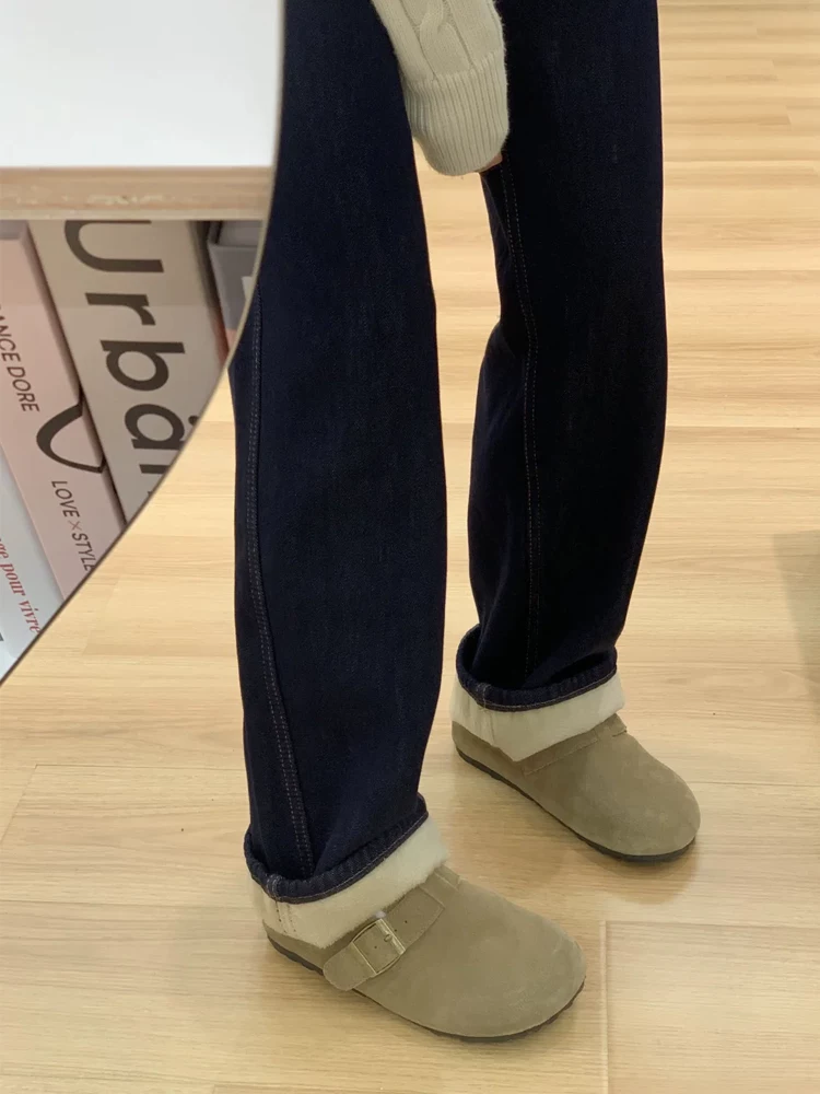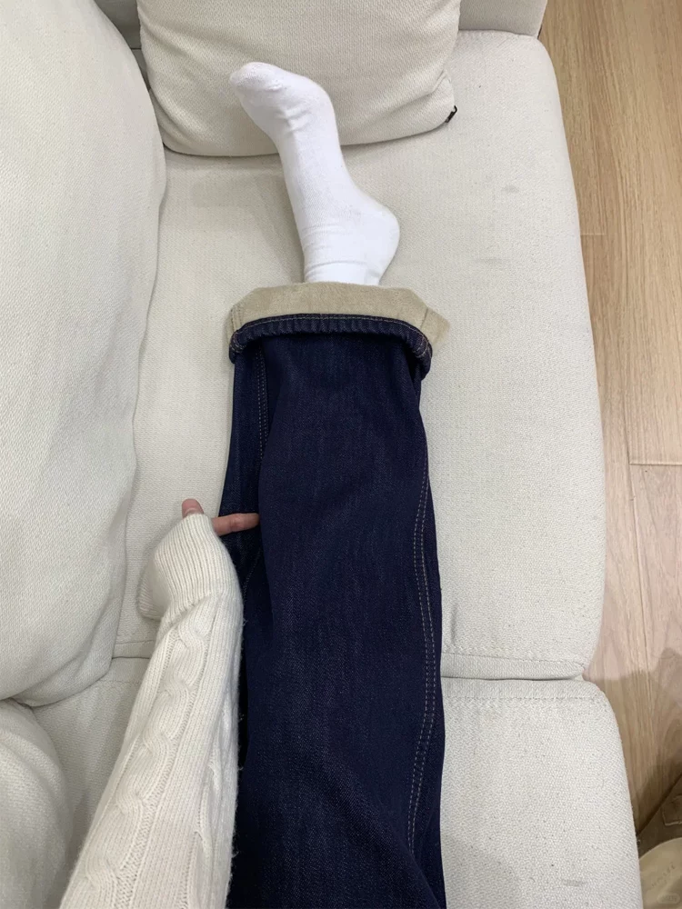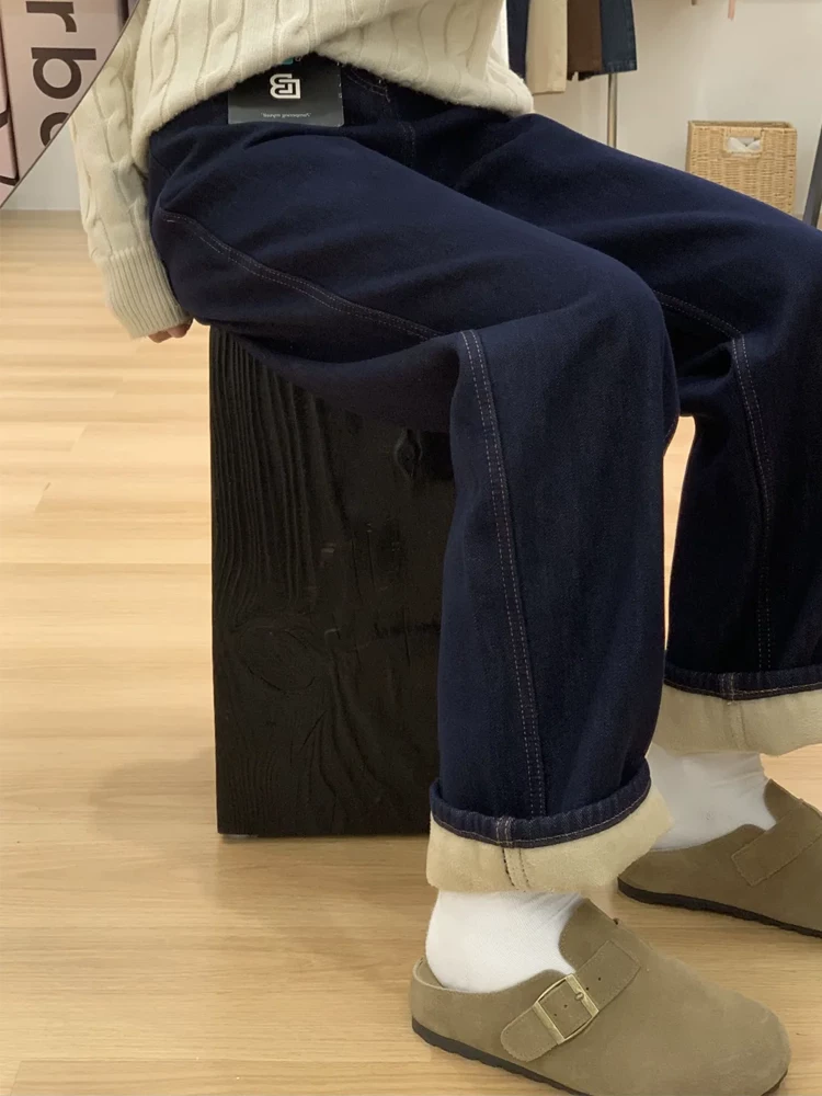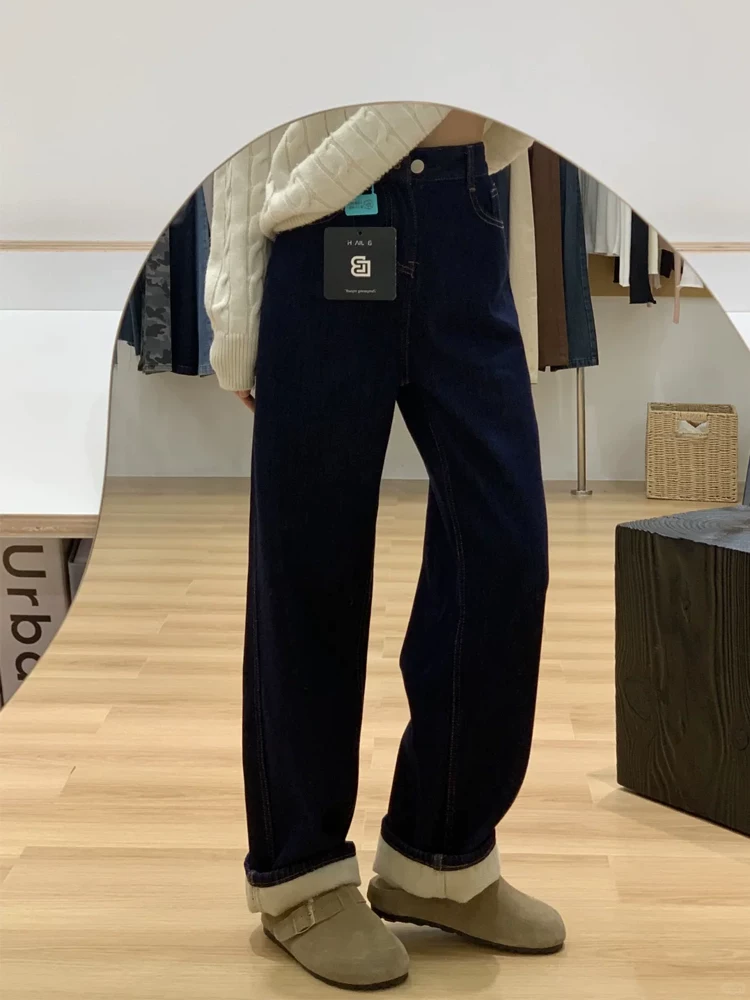 Quần jean ống rộng màu xanh đậm dành cho nữ, mùa thu đông, cỡ lớn, lót lông cừu, dày dặn, cạp cao, dáng suôn, quần ống thẳng giúp thon gọn.