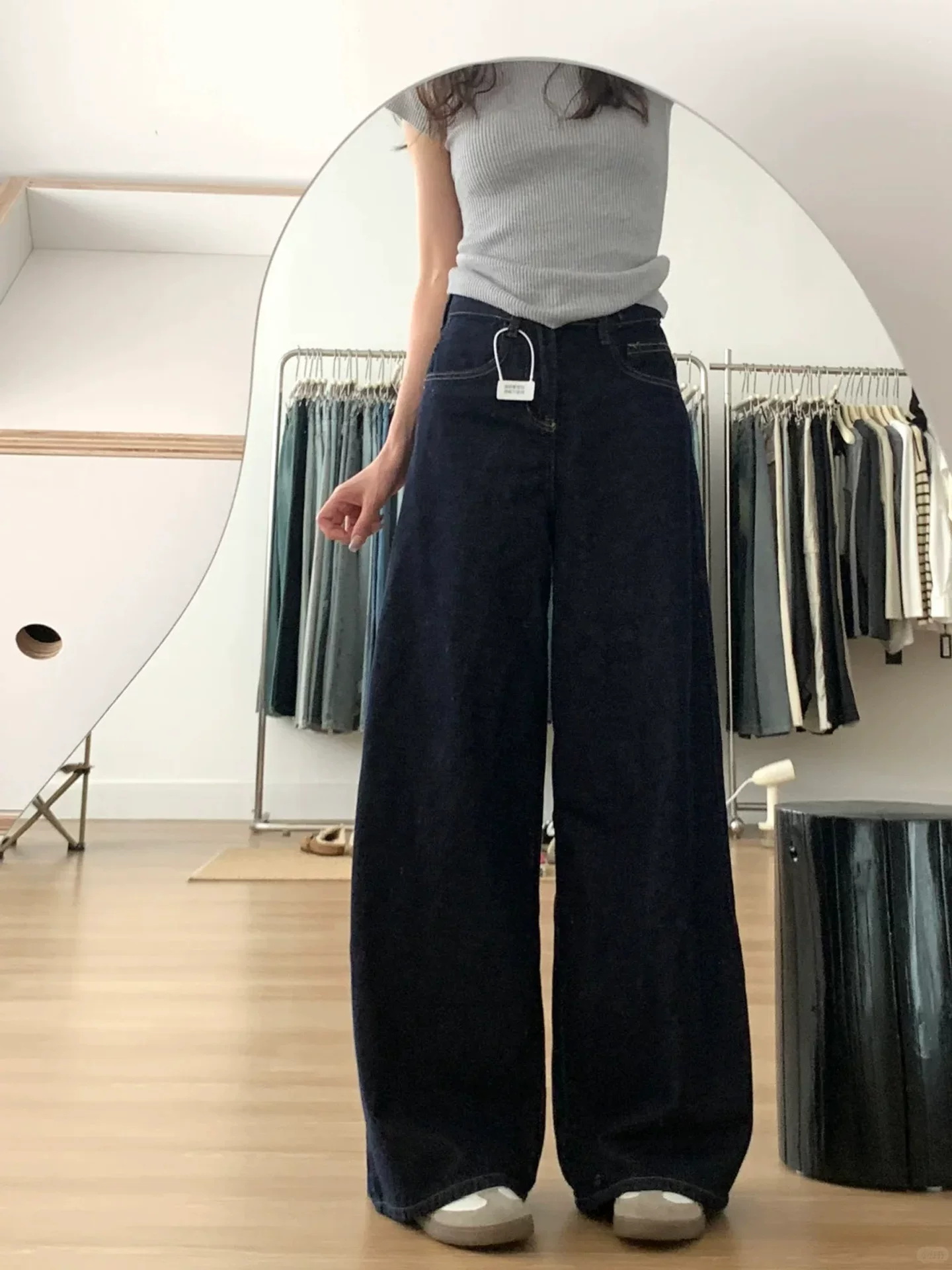 - Quần jean ống rộng màu xanh đậm dành cho nữ, phong cách đầu thu, cỡ lớn, lưng cao, dáng rộng, tôn dáng, quần dài dáng chữ A thẳng dài.