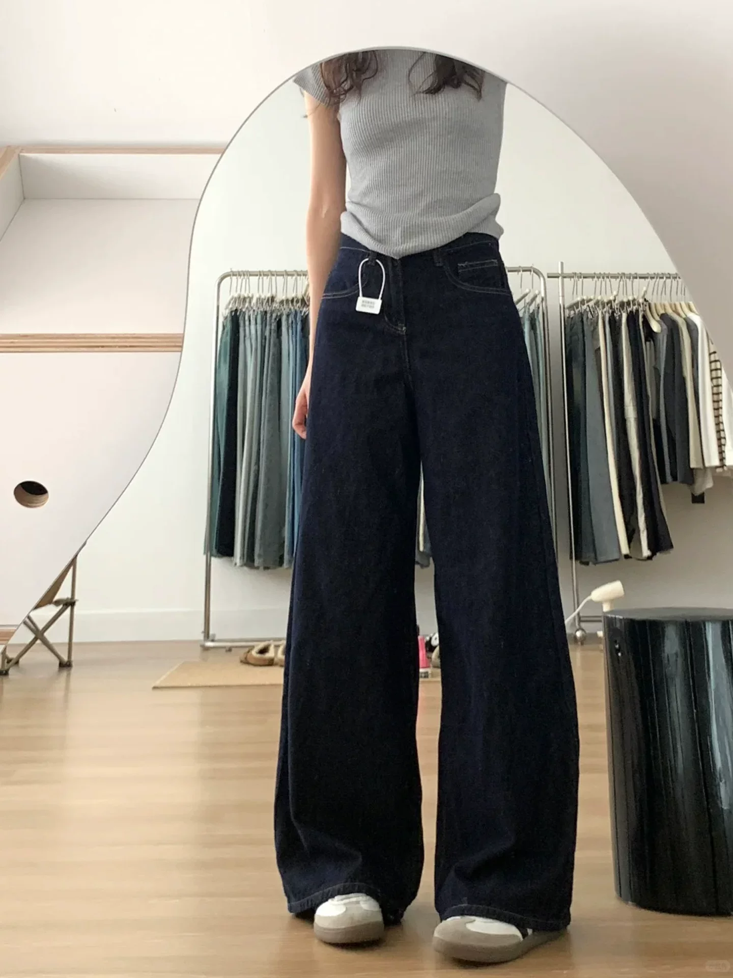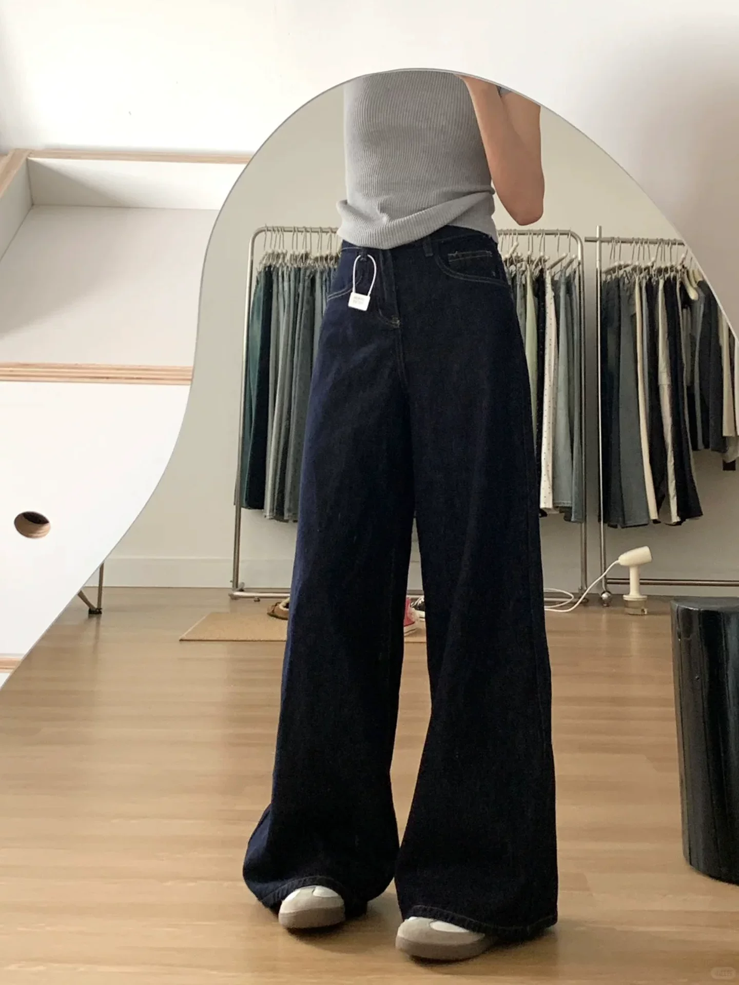 Quần jean ống rộng màu xanh đậm dành cho nữ, phong cách đầu thu, cỡ lớn, lưng cao, dáng rộng, tôn dáng, quần dài dáng chữ A thẳng dài.