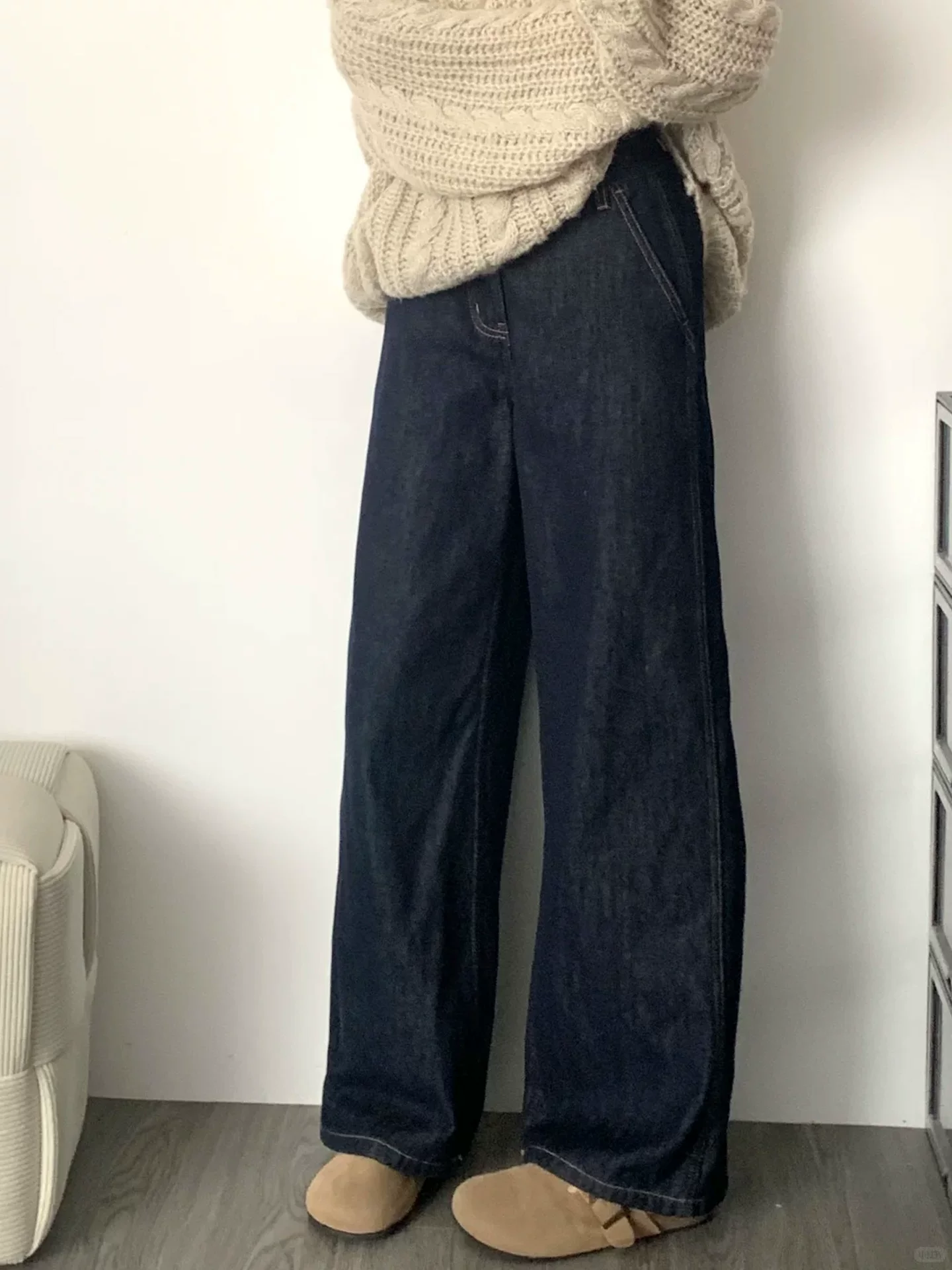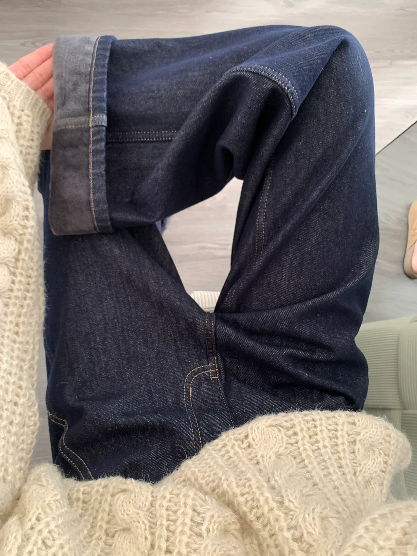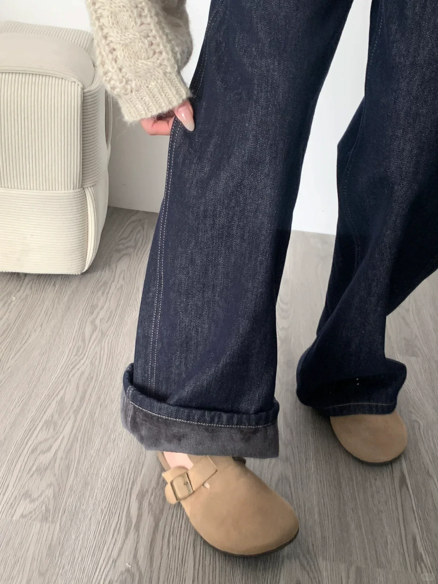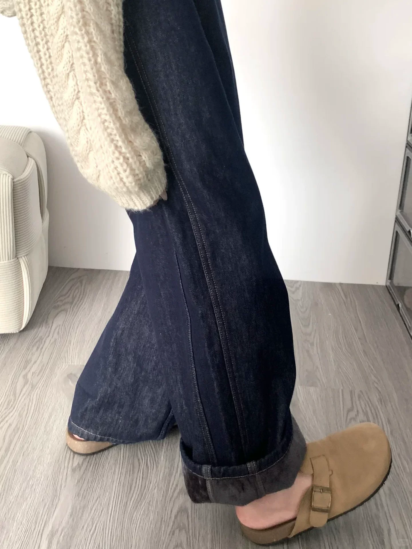 Quần jean ống rộng màu xanh đậm dành cho nữ, phong cách thu đông, lót lông cừu, cỡ lớn, lưng cao, dáng rộng, giảm béo, quần ống thẳng dày.