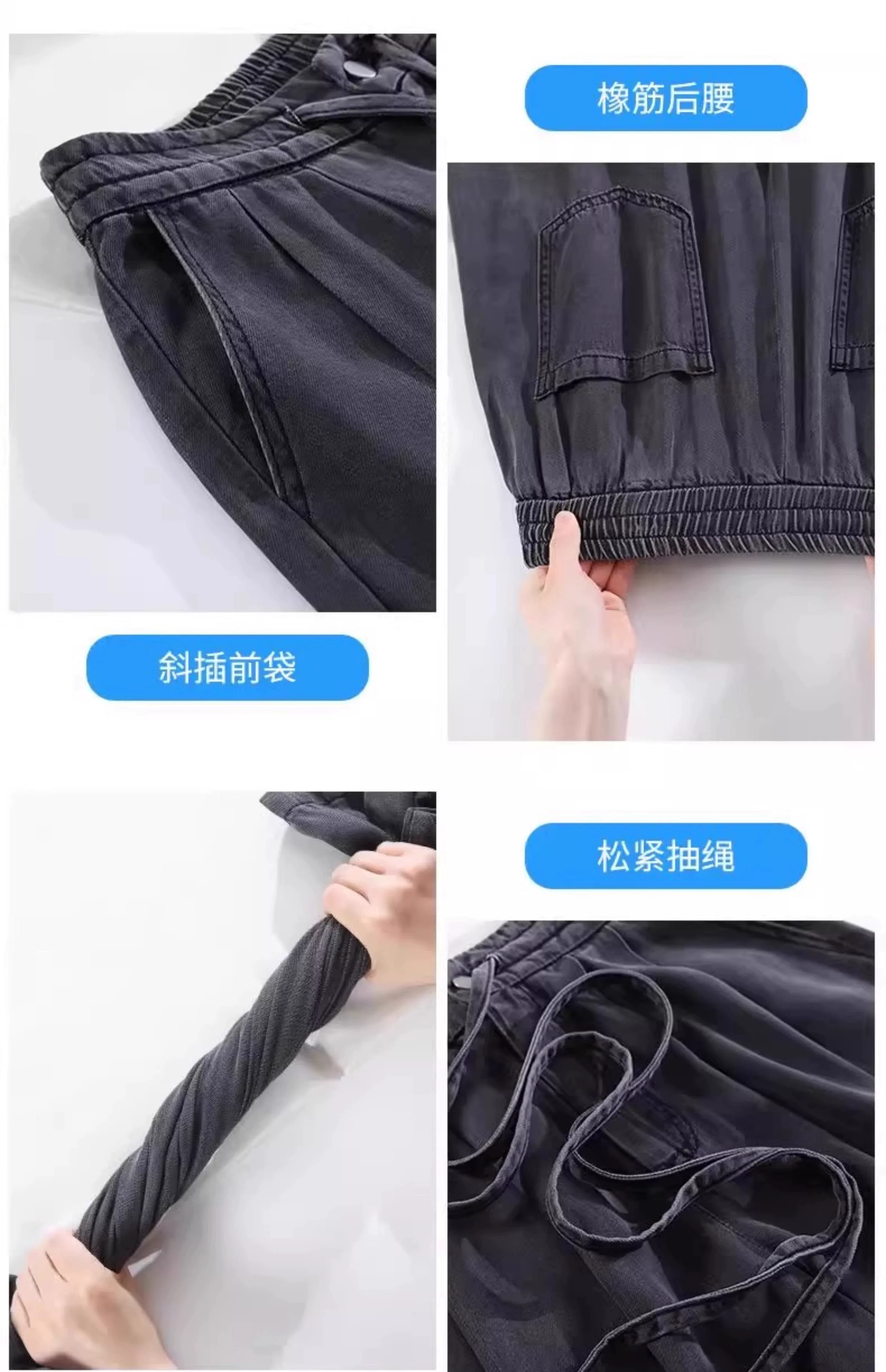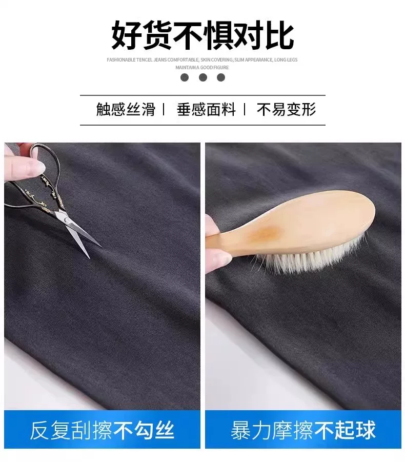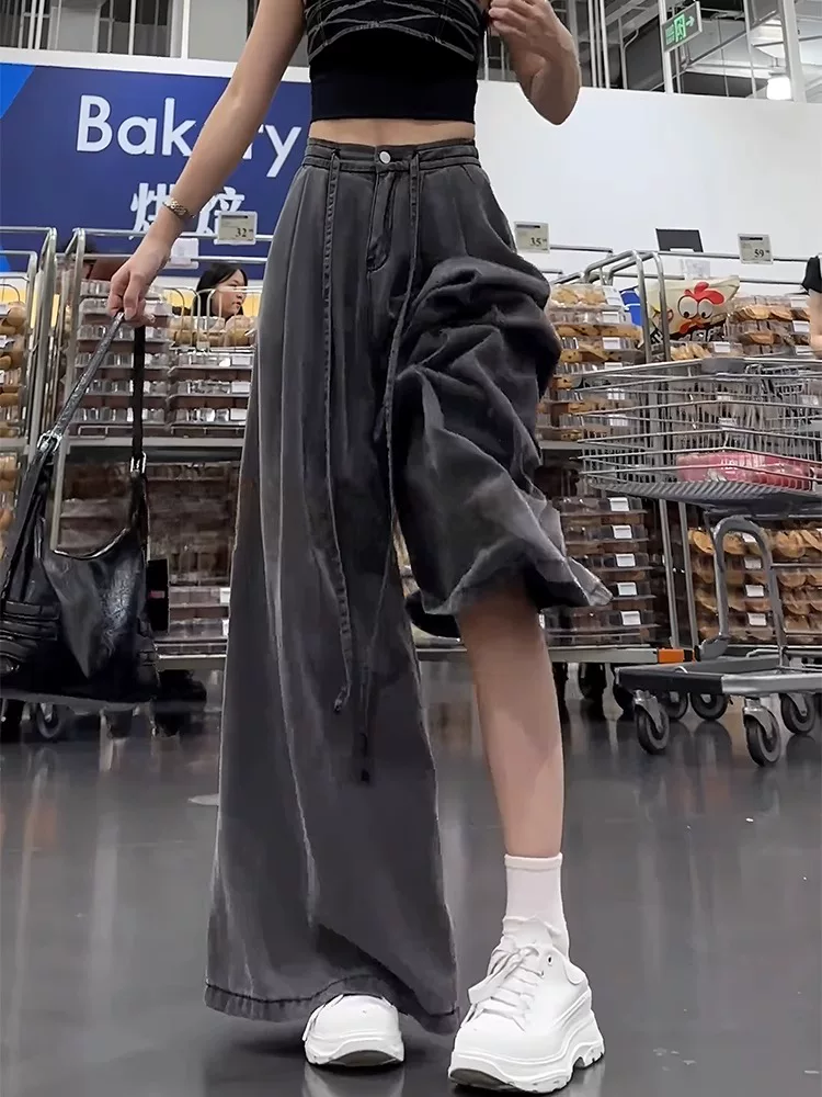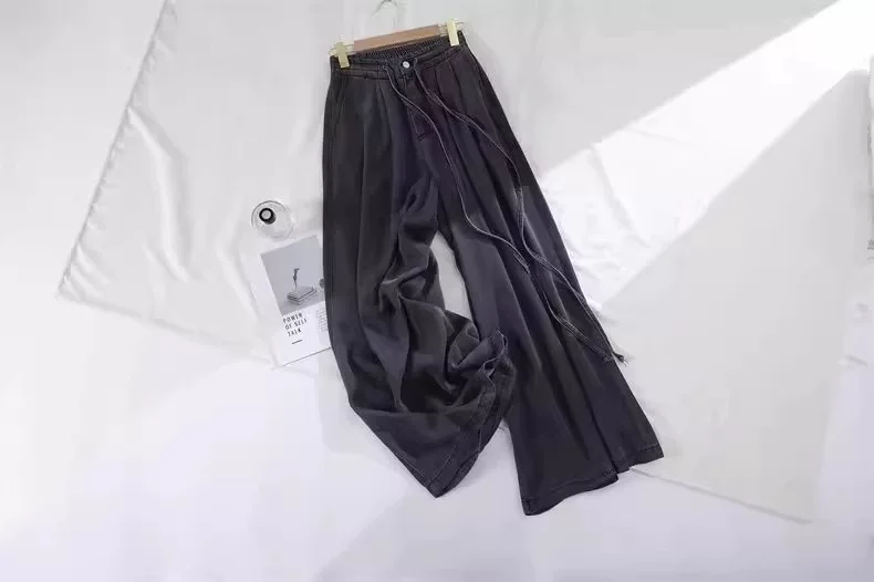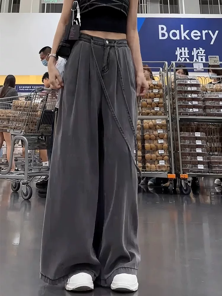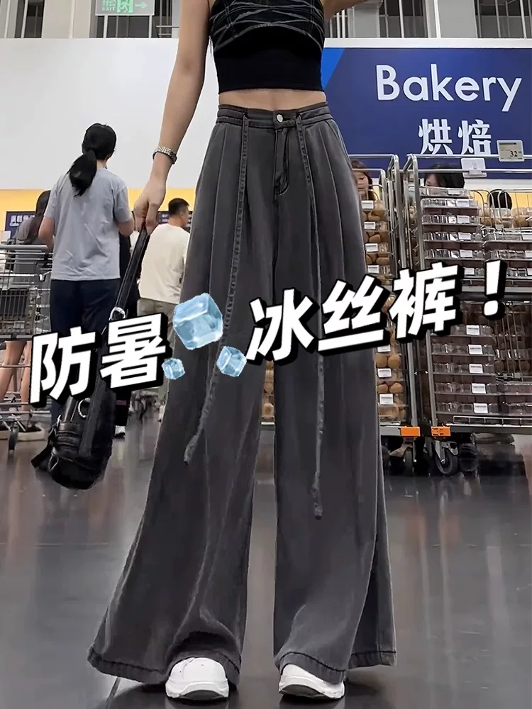 Quần jean ống rộng Tencel màu đen và xám dành cho nữ, kiểu dáng mỏng mùa hè, cỡ lớn, lưng cao, rộng rãi, mềm mại, tôn dáng, quần dài chạm sàn.