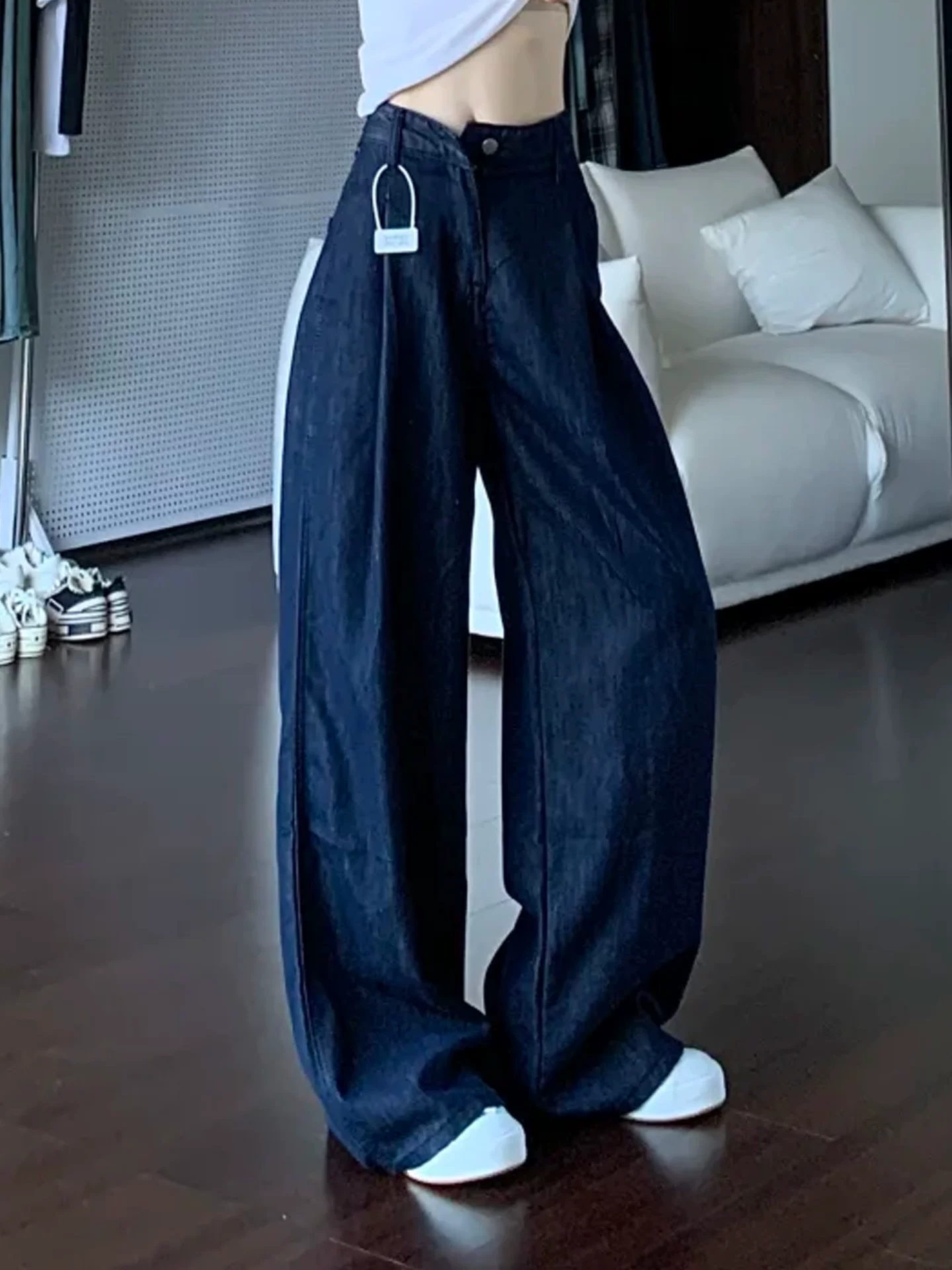 - Quần jean ống rộng Tencel màu xanh đậm dành cho nữ, kiểu dáng mỏng mùa hè, cỡ lớn, lưng cao, mềm mại, tôn dáng, quần mát như lụa băng.