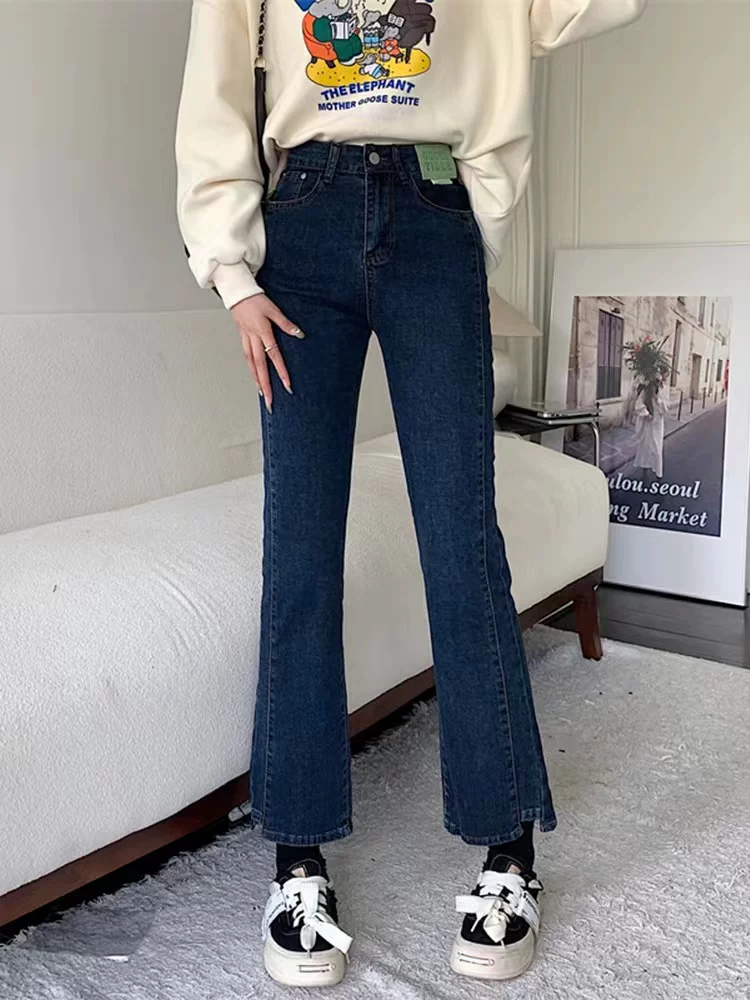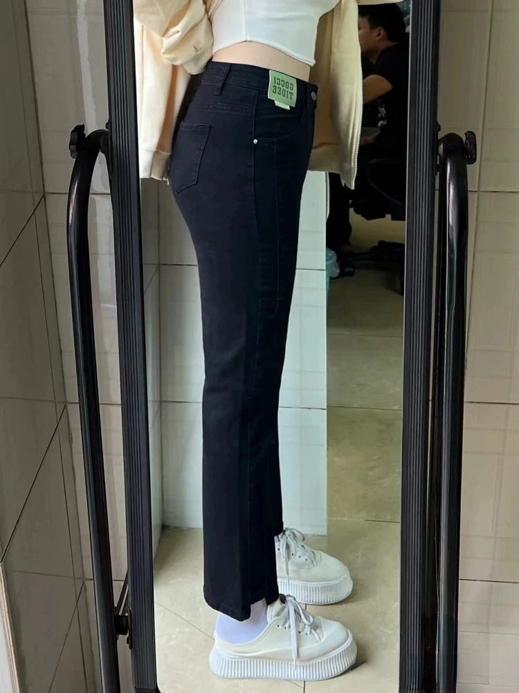 - Quần jean ống thẳng dáng quả lê dành cho nữ, mặc đầu thu, cỡ lớn, dáng hơi mũm mĩm, co giãn, che hông, giảm béo, quần jean hơi loe