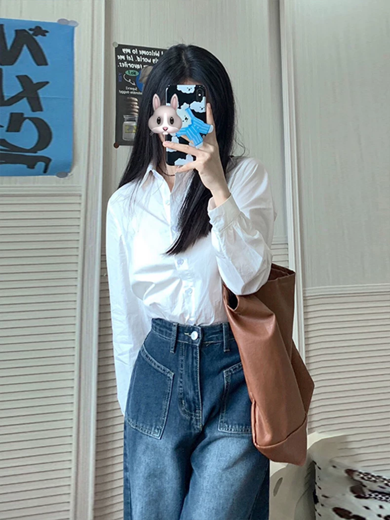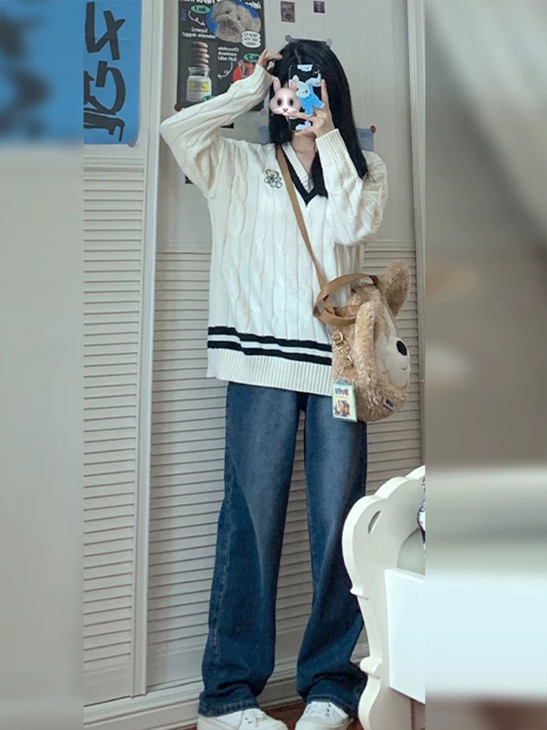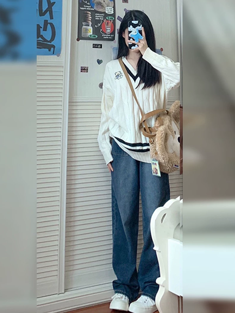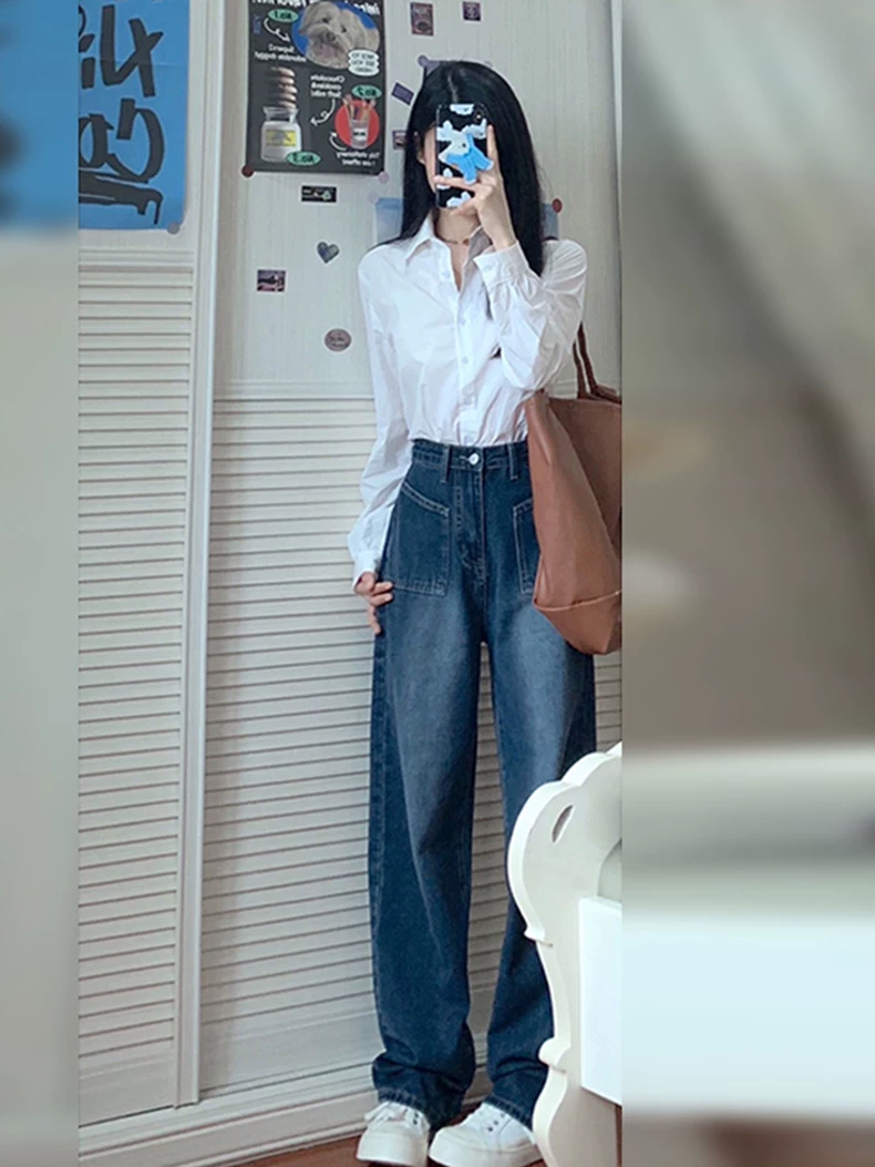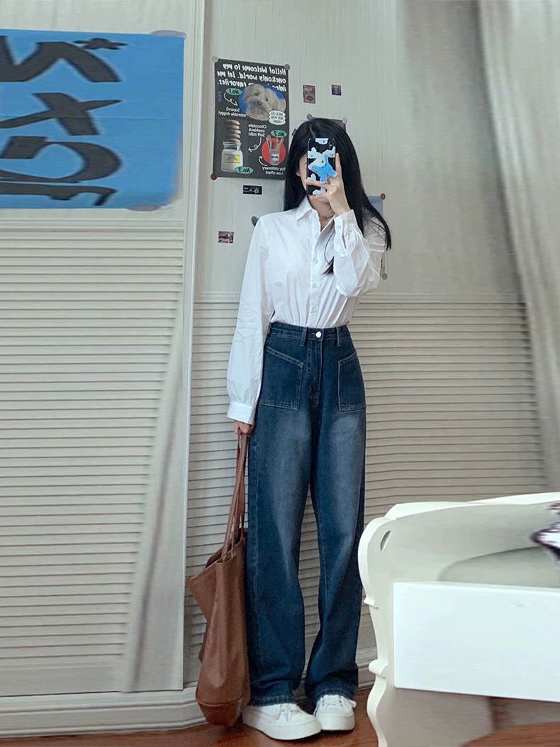- Quần jean ống thẳng dáng quả lê dành cho nữ, mặc đầu thu, cỡ lớn, hơi mũm mĩm, lưng cao, dáng rộng, che bụng, giảm béo, quần ống rộng