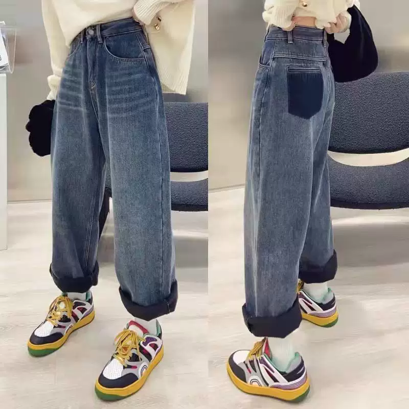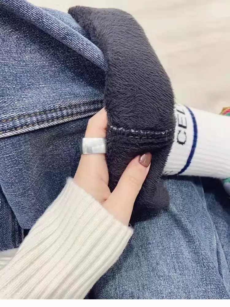 - Quần jean ống thẳng dáng quả lê dành cho nữ, mùa thu đông, lót lông cừu, dày dặn, cỡ lớn, lưng cao, dáng rộng, giảm béo, quần bố.