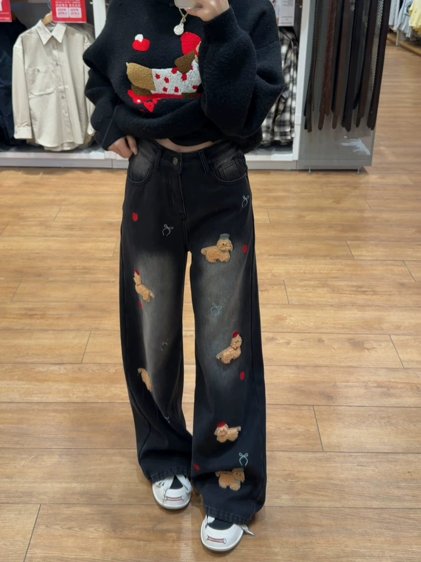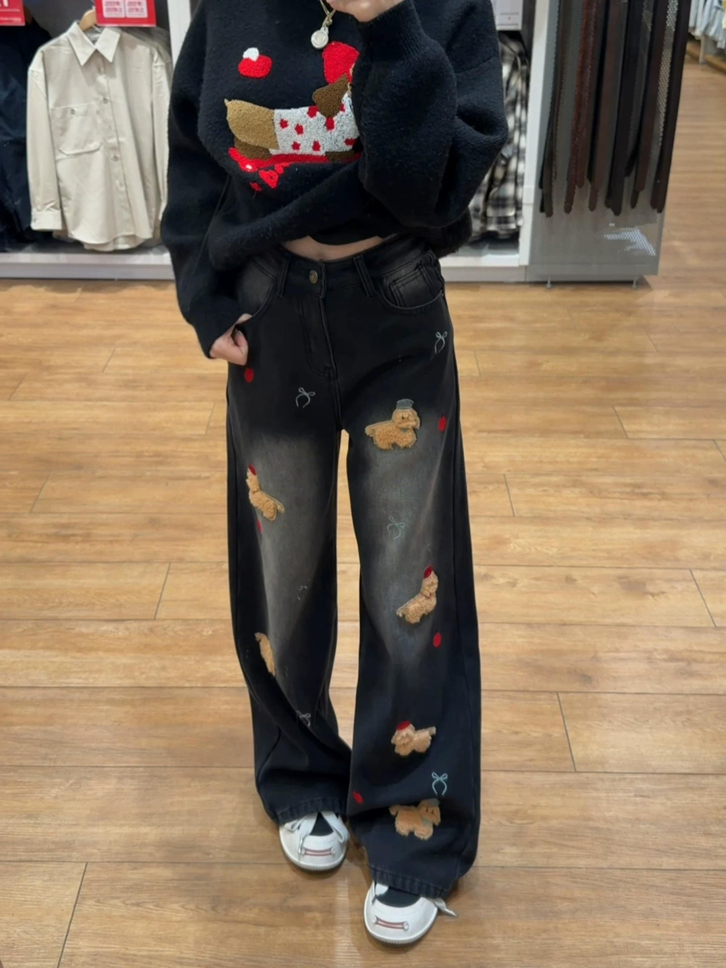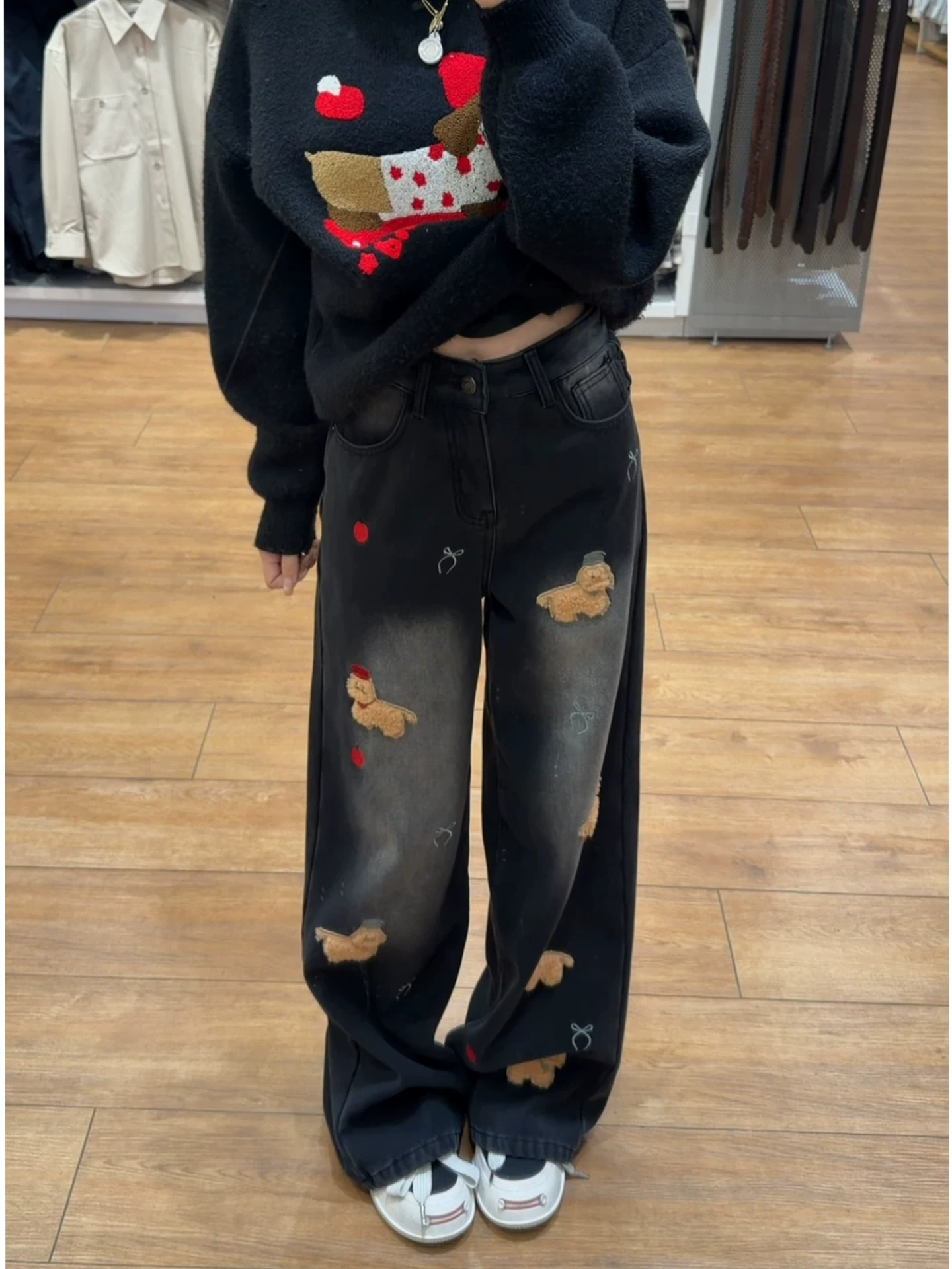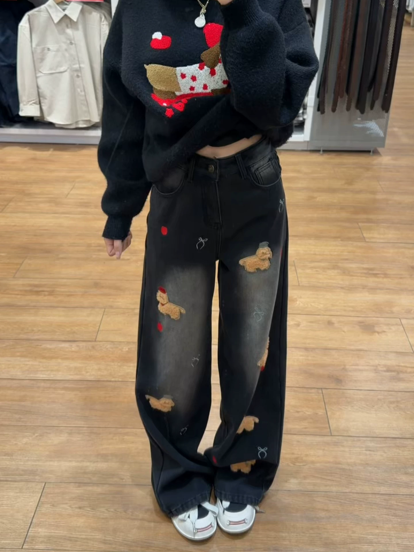 - Quần jean ống thẳng dày có lót lông cừu thêu hình chó dành cho nữ, mùa thu đông, cỡ lớn, lưng cao, dáng rộng, giảm béo, quần ống rộng