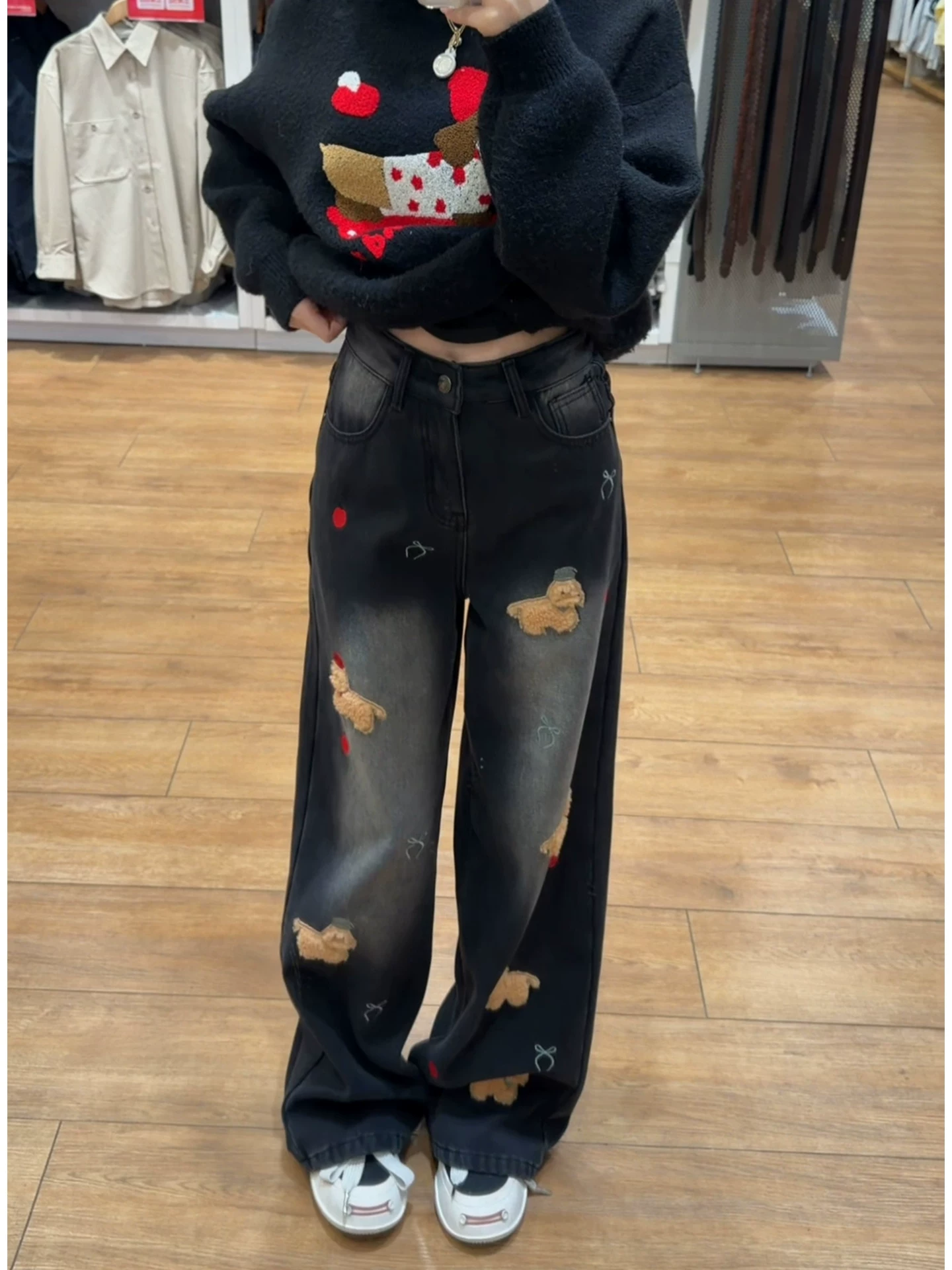 Quần jean ống thẳng dày có lót lông cừu thêu hình chó dành cho nữ, mùa thu đông, cỡ lớn, lưng cao, dáng rộng, giảm béo, quần ống rộng