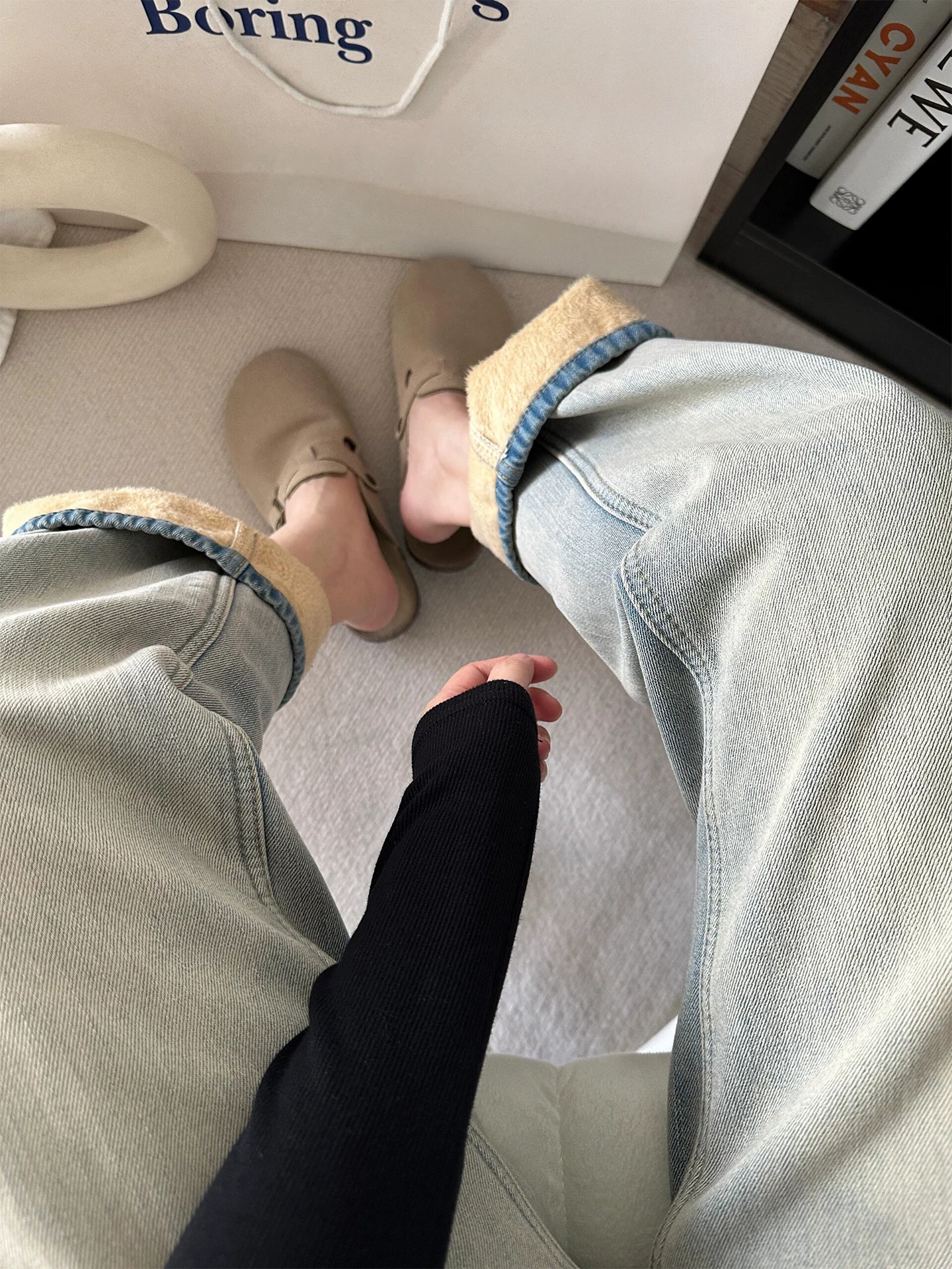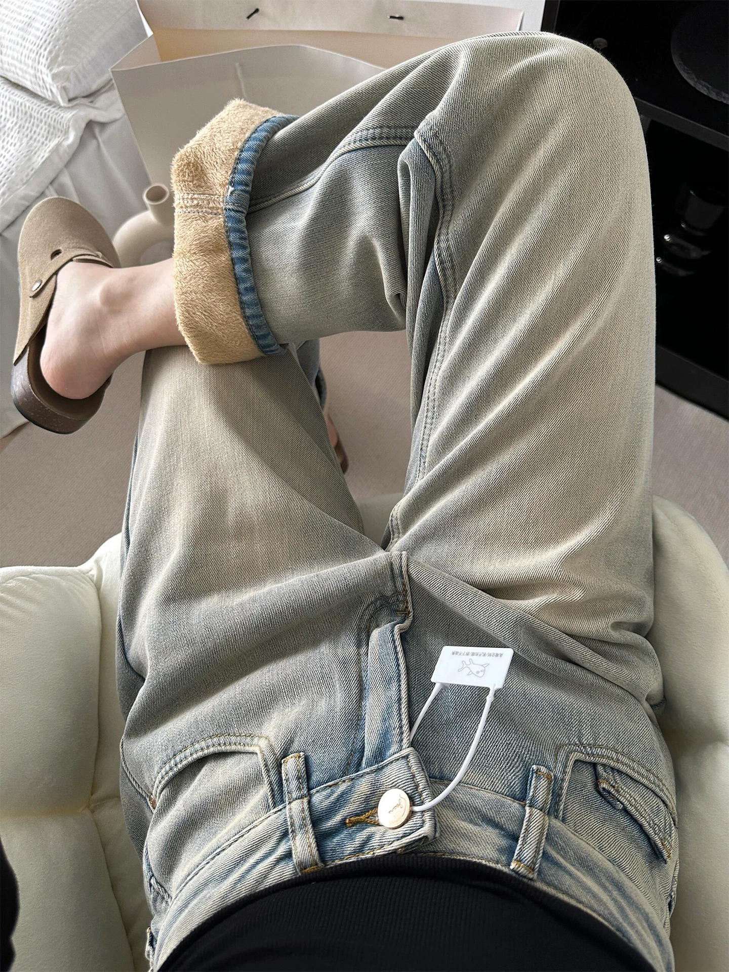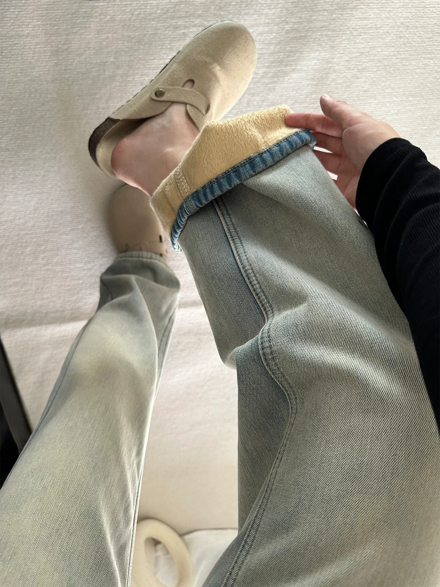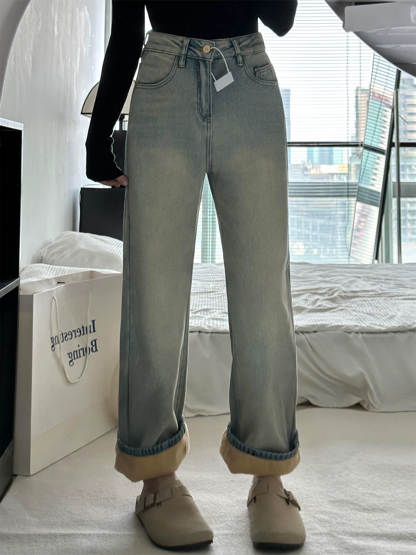 - Quần jean ống thẳng dày lót lông cừu dành cho nữ, mùa thu đông, cỡ lớn, lưng cao, dáng rộng, giảm béo, dáng quả lê, quần ống rộng